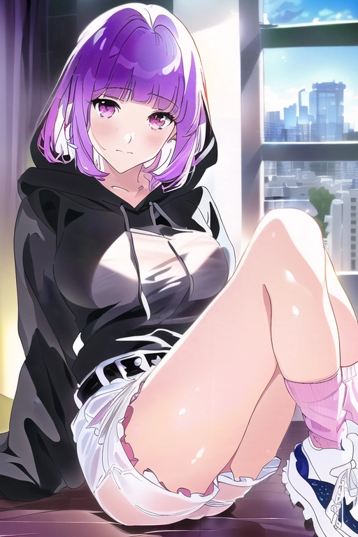 prompt: masterpiece, best quality, NSFW, Official art work, 400 mega pixels, photoshop, {{Delicate and intricate lines hair}}, beautiful Ephemeral colors, {{{{super awesome detailed the best of Professional animation composition painting}}}}, {{{{super finely detailed 2020’s anime works, tessellation}}}}, {{realistic bright and cheerful}}, {{{the best of anime}}}, fusion of flat lay photography & from {{front side}}, {{a super detailed centered on a beautiful and cute girl with {pure purple} hair, delicate dark pink eyes}}, {{boring expression}}, solo focus, cowboy shot, {{{yami_kawaii}}}, {{blunt bangs with arch short locks}}, ribbon collar, detailed black hooded hoodie, {{white frilled shorts}}, large breasts, bend over, such belt, cute sleeve, {{sexy chubby thighs, beautiful legs, It\'s so close, {{frilled are see through}}, sitting on bed room, {{thighs belts, {{loose socks}}, platform sneakers}}, knee up, sexy anime figures pose, {{Product photos of figures for adults}}, {{detailed background}}, hotel window, {{realistic building}}, {midnight, perfect anatomy, 4K},