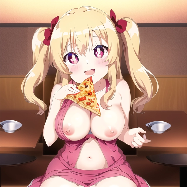 おっぱい見せたヘソ出しチャイナドレスの女の子とピザです