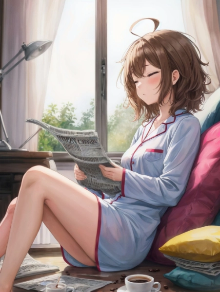 In the morning, a young woman, sloppily and disheveled in her pajamas, sits on the floor, drinking coffee while vaguely (reading a newspaper:1.3).