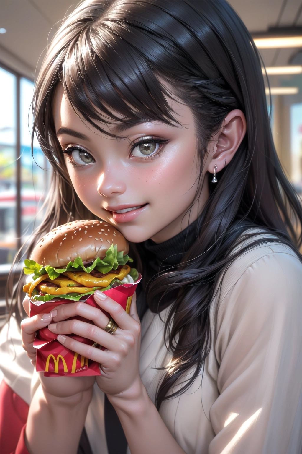 eating a hamburger at McDonald's