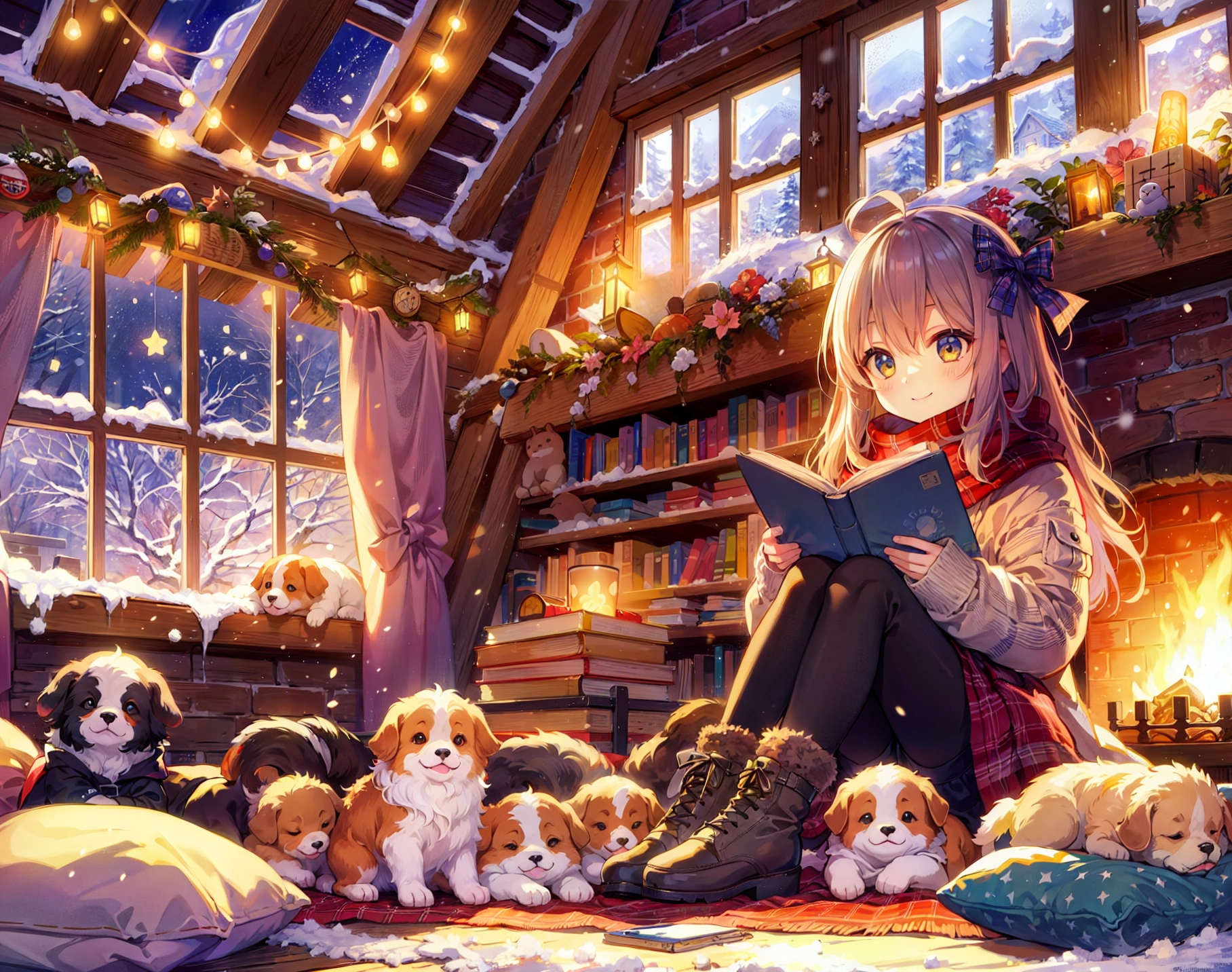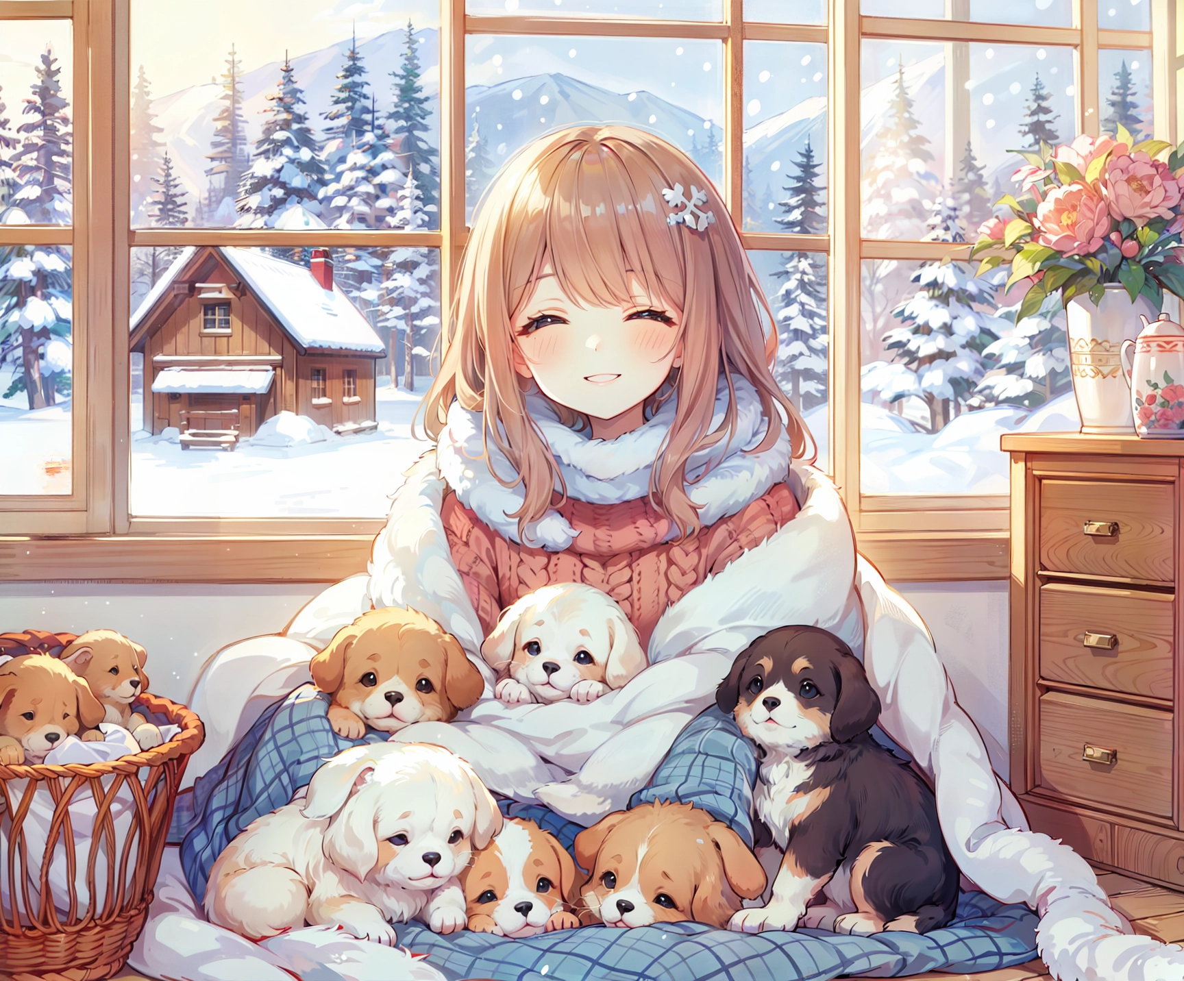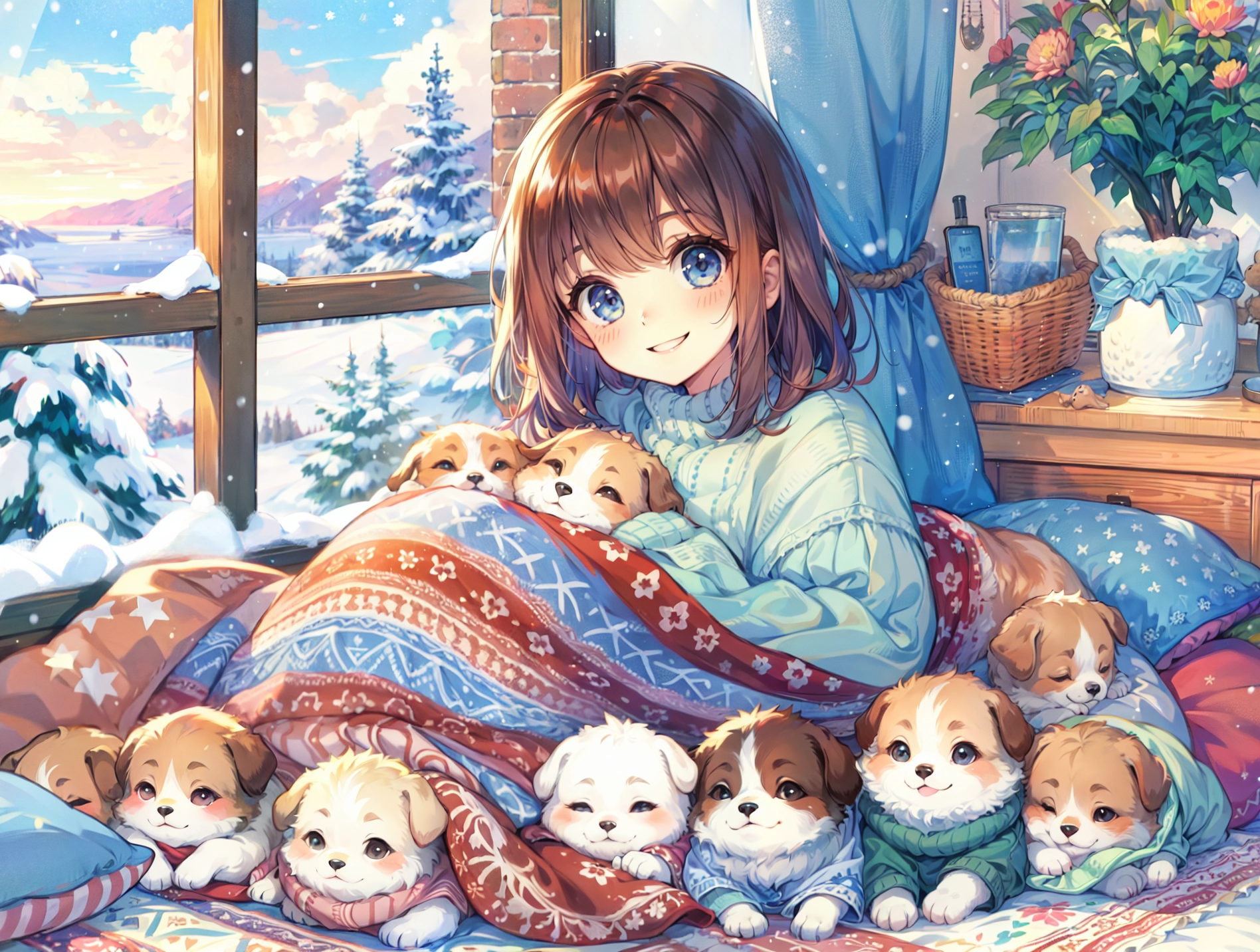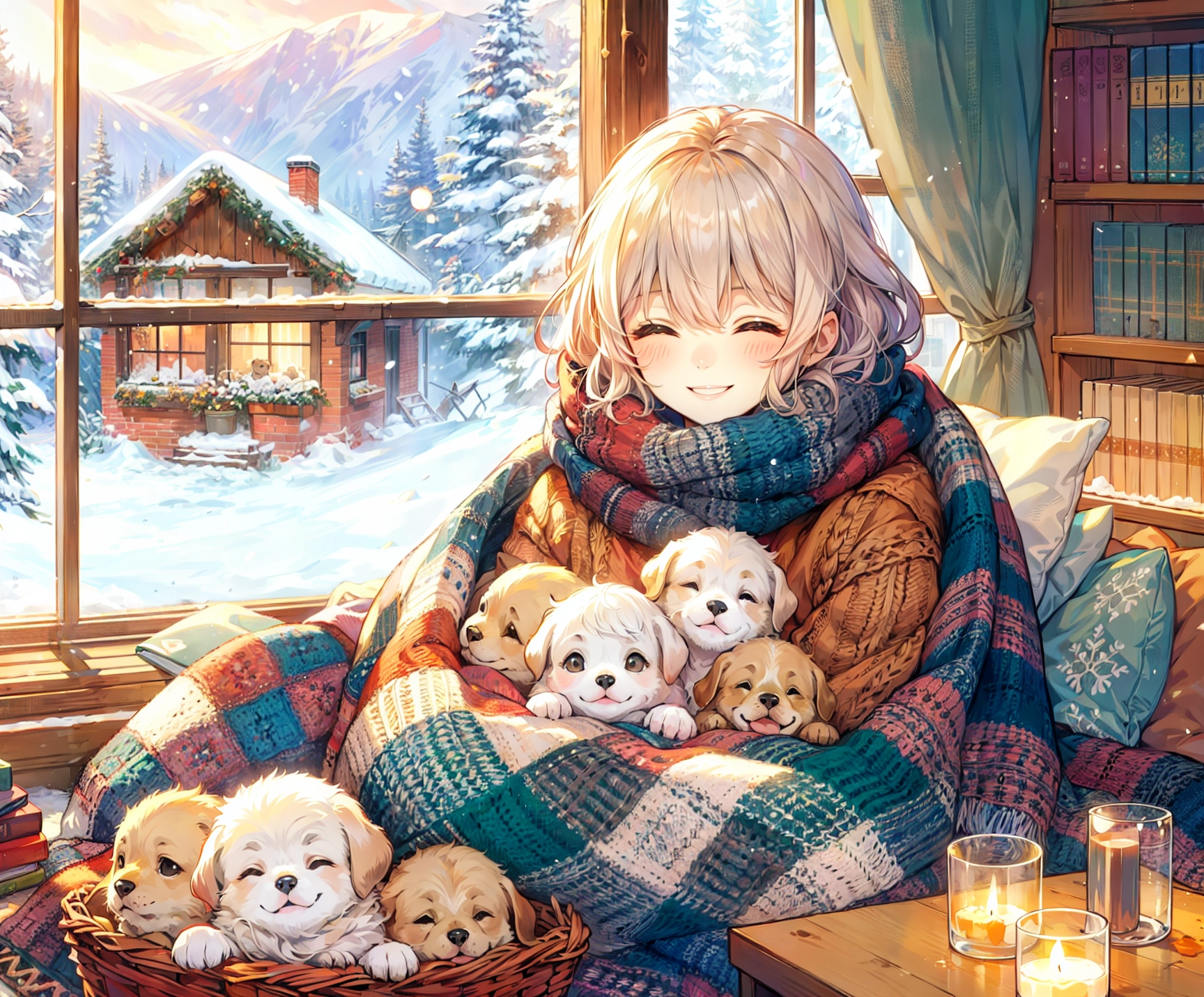 子犬と毛布にくるまる