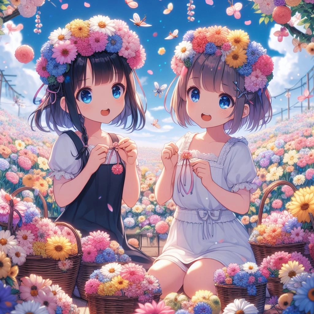 花畑で花飾りを作ってる女の子🤗