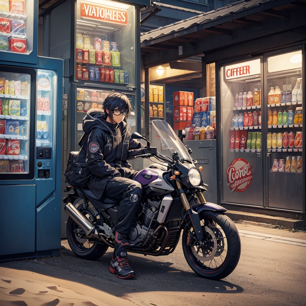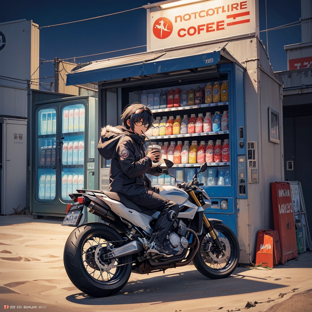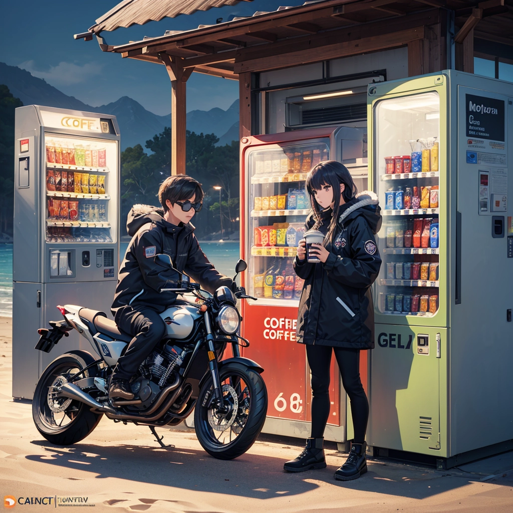 夜明け前の海岸の自販機で休むバイク乗り