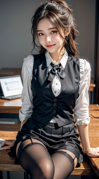 (sit on a chair:1.5) , (Garter, thigh strap, garter belt:1.3) , (pantyhose:1.5) , cleavage , thick thighs ,