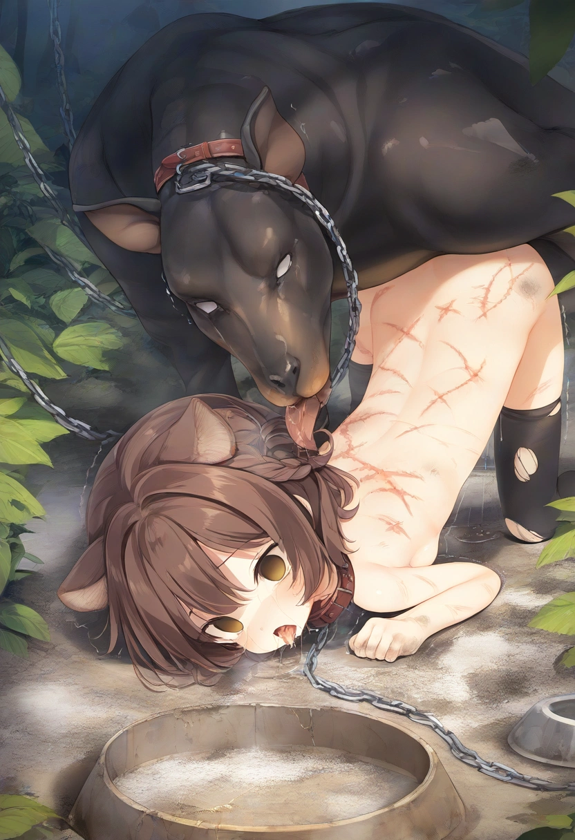 A furry-eared girl who was able to finish all the milk her uncle gave her thanks to her Doberman.