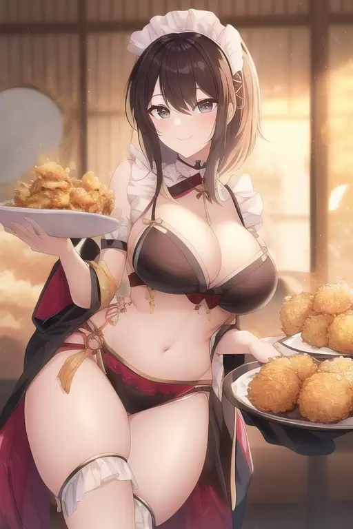 へそ出し和風メイドと天ぷらです
