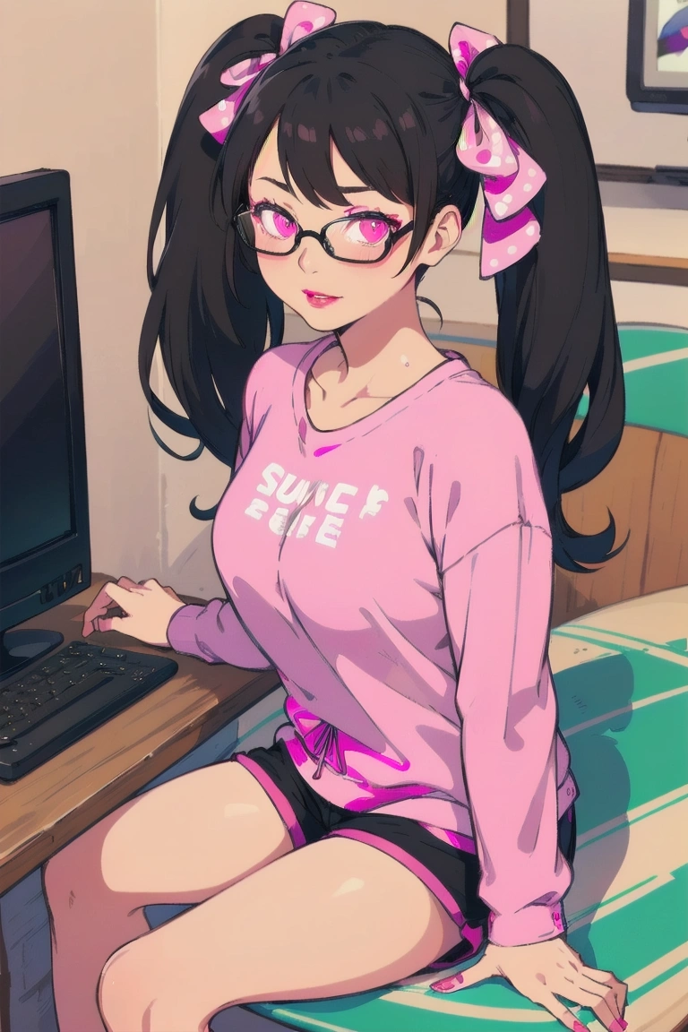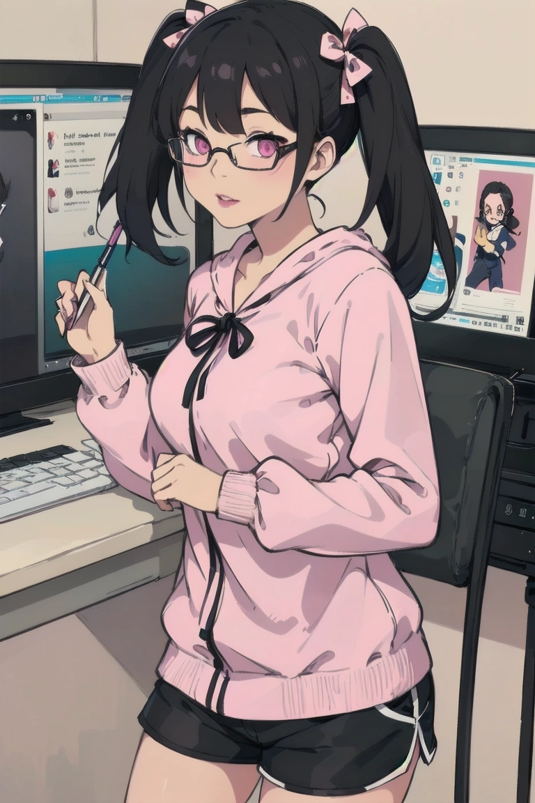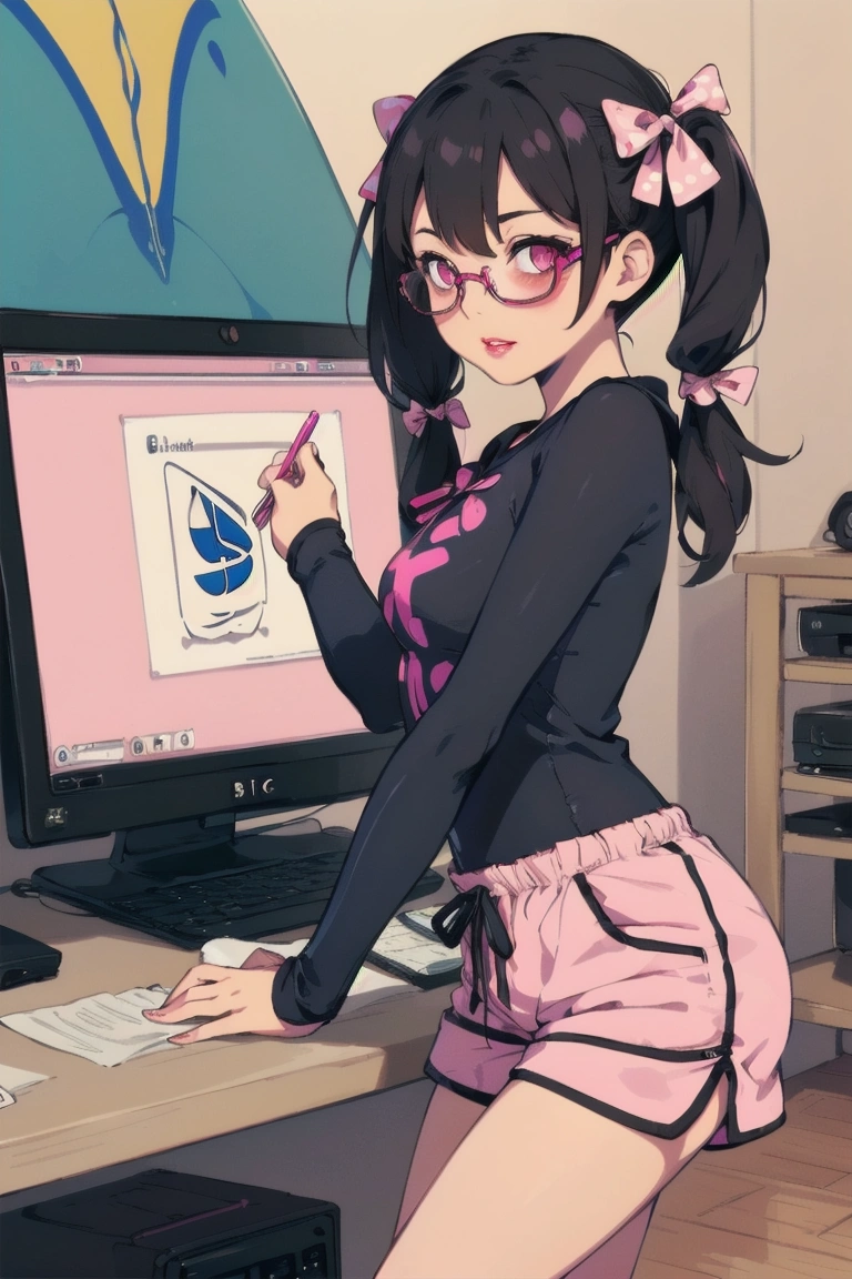 7th photo: I can\'t beat pink pumpkin-like shorts than doing something on a touch-enabled monitor with a stylus pen. Who exactly does that face look like?