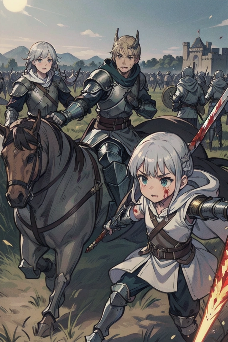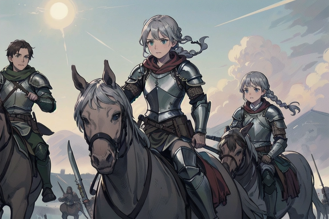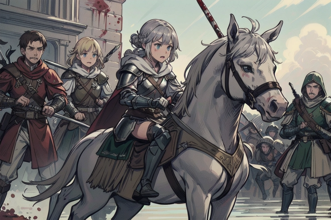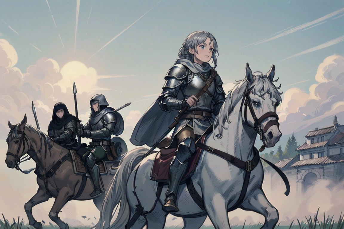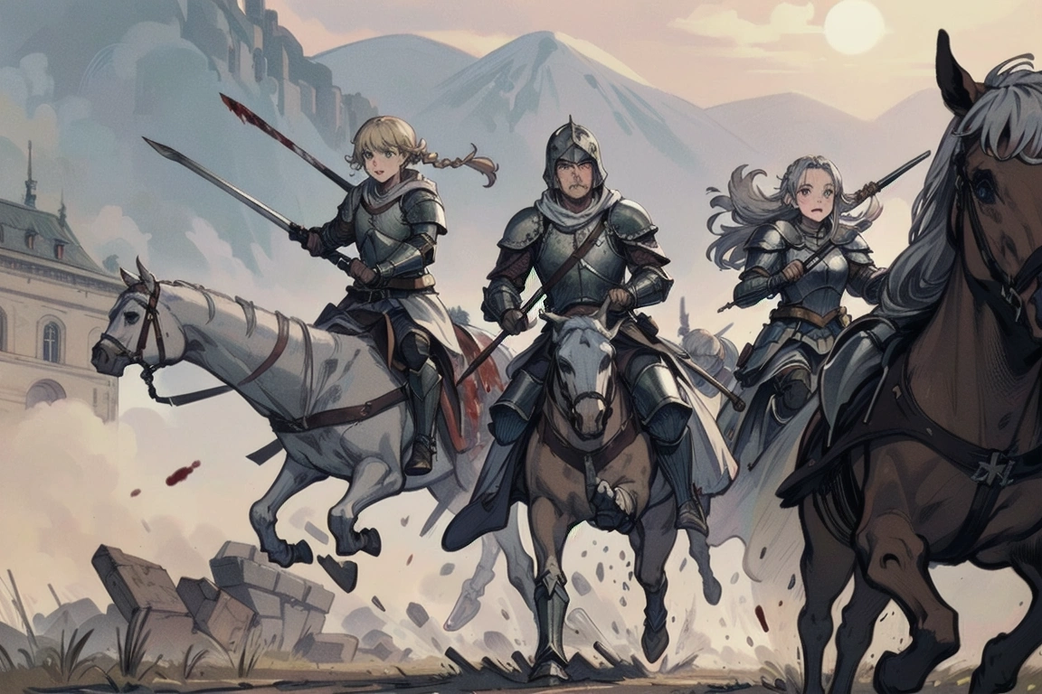 4th photo: Charge! The one on the left looks like Averin (her cousin), and both look like Florian with different hair colors. But the old man knight in the middle is cool, and the horse looks nice too, so it\'s OK! (What happened to the jockey/knight on the right in the foreground? LOL)