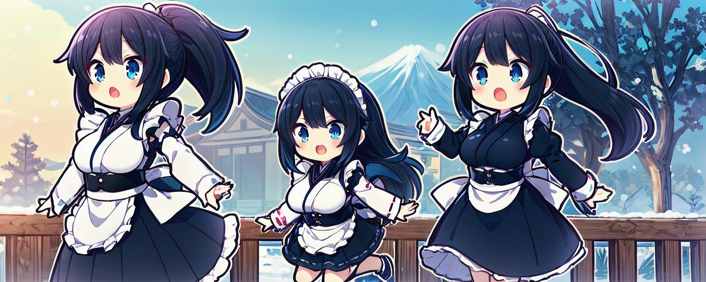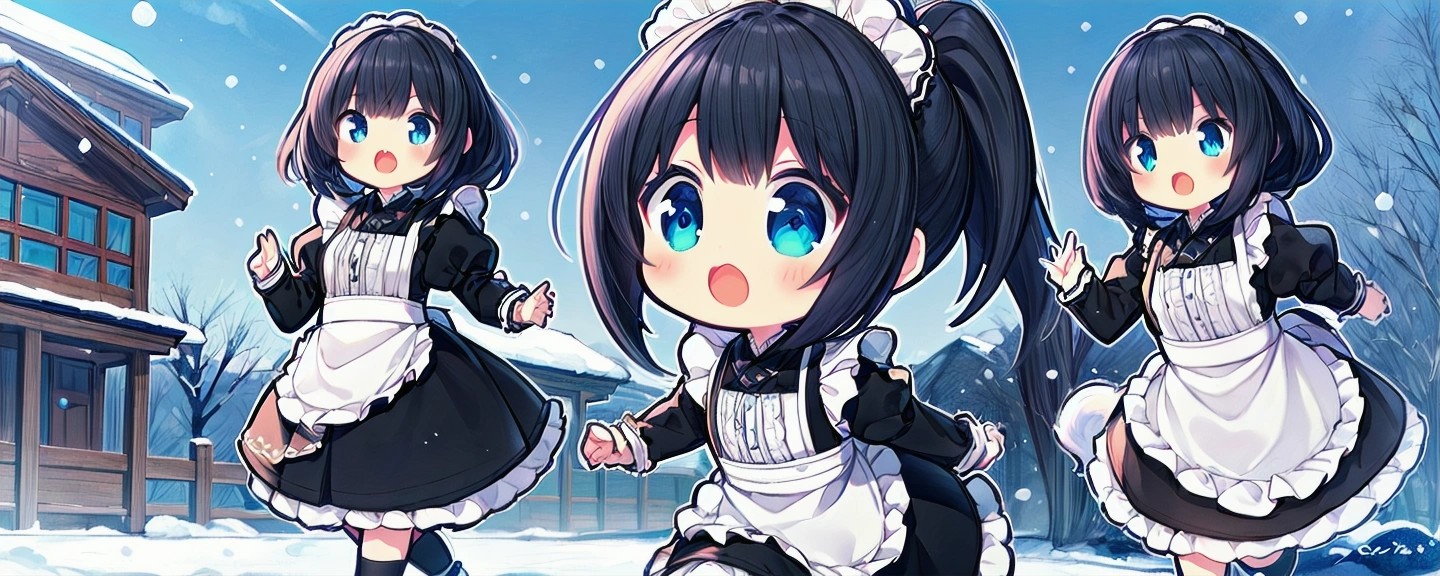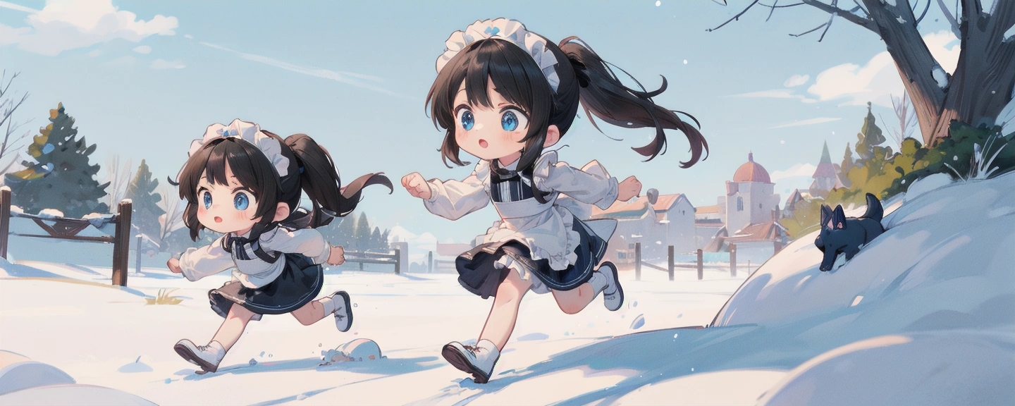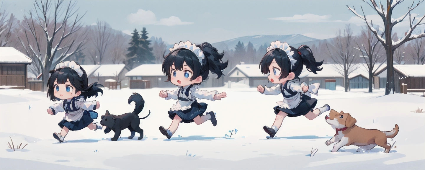 雪の中、わんこたちと走り回るメイドさんたち