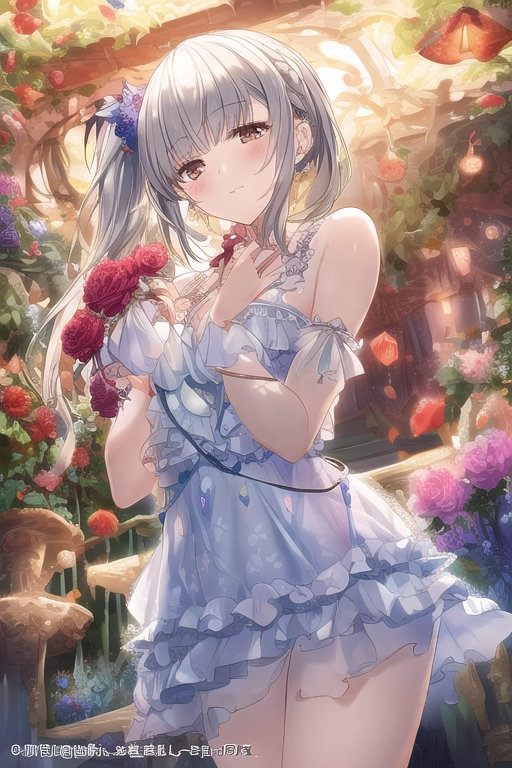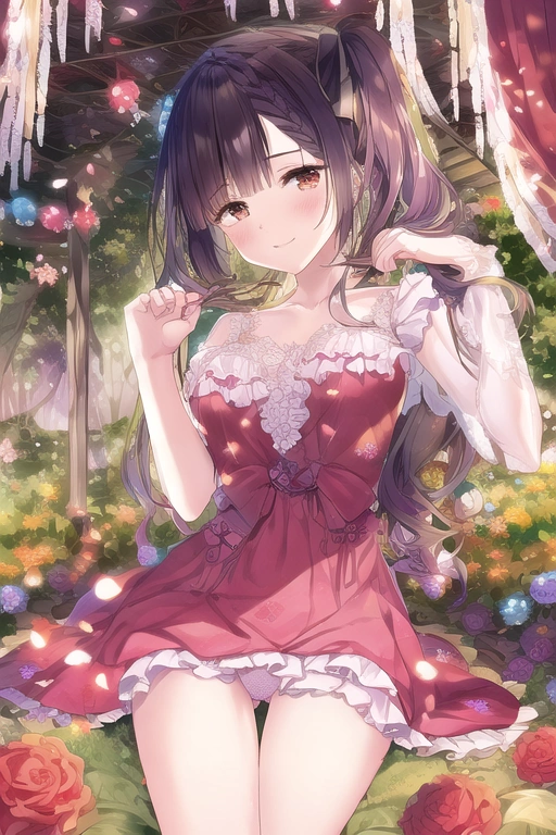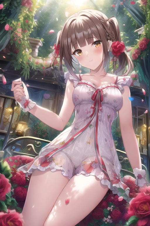 prompt: masterpiece, best quality, \"Whimsical Garden Maiden\" - A charming 18-year-old girl with a red flower print maid outfit, adorned with delicate frills and ribbons. In her hands, she holds flowers emitting a soft glow, casting a warm and dreamlike light around her. The lush garden surrounding the canopy bed is filled with exotic flowers and twinkling lights, creating a magical atmosphere. The girl, with blush cheeks and a sheer nightgown outfit, adds a touch of whimsy to her appearance. The scene is captured in an ultra-detailed, high-resolution artwork, featuring dynamic fuzziness and vibrant colors. The girl is lying on the canopy bed, immersed in thought, while a gentle wind blows, causing many petals to dance in the air, creating a captivating and enchanting visual., embarrassed, official art, {{ultra-detailed}}, {{high resolution}}, dynamic fuzziness, colorful, best quality, cowboy shot, underwear, girl ,solo, 20 years old, blunt bangs, braid hair, twintail, side ponytail, bob, Shostakovich,
