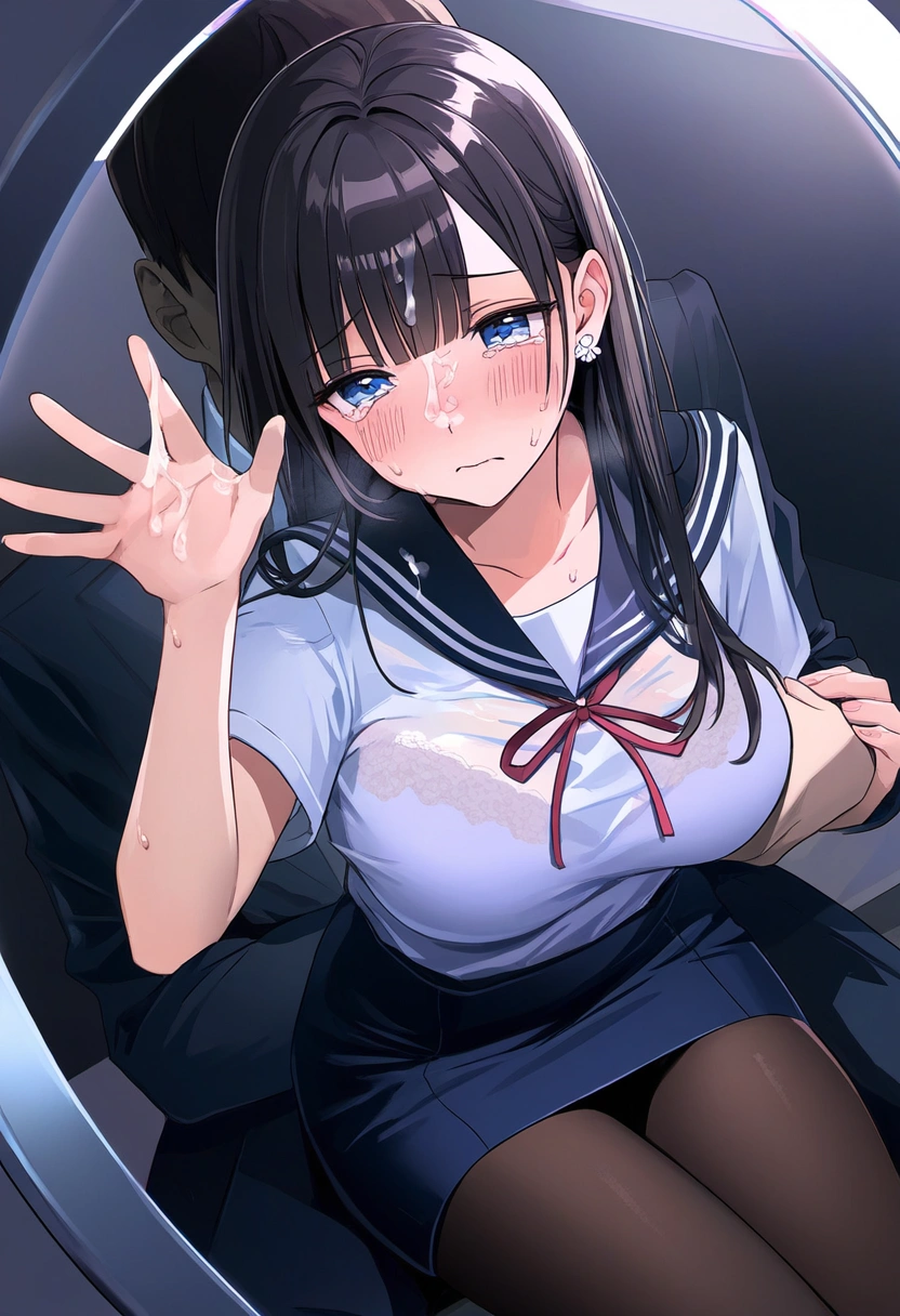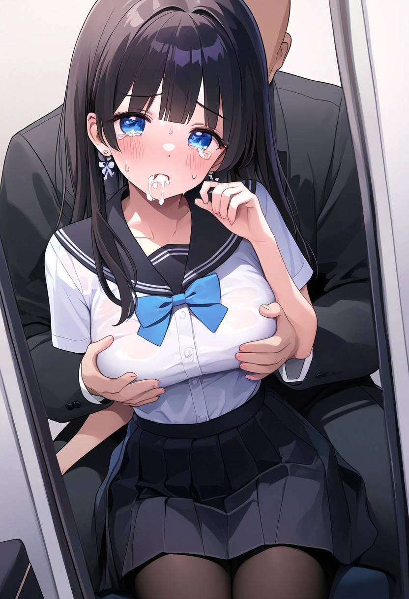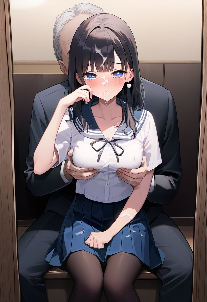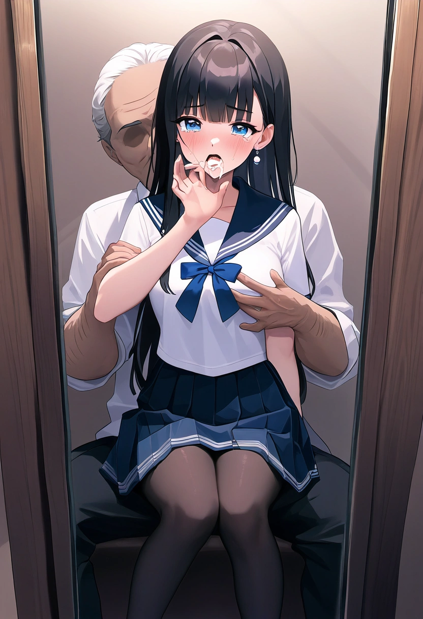 prompt: {NSFW},{{very aesthetic}}, {{best quality}}, {{accurately described}}, {{perfect aesthetic}} {{perfect best quality}},(ultra-highres,extreme detailed,insanely detailed, highest detailed,(illustration),16 years old Neat and pretty girl,pure virgin,(innocent baby face:1.0), (cute:1.3), slender, kawaii, ultimate detailed face, perfect face, ultra cute girl, ultra cute face, ultra detailed eyes,lustrous skin, super detailed skin,textured skin, gleaming skin, glistening skin, ultra eyes, ultra detailed hair, shiny messy long hair, medium breasts, narrow waist,black hair,blue eyes,{{{in business hotel room,}}{{{too short sailor uniform,mini sailor skirt,simple earrings,black tights}},{{{hetero,1girl sitting on a man in suit reflected in the mirror},{{{{a pure girl sexually molested by faceless man,a cute girl Grasped her breasts on the clothes by man from behind}},mirror focus,{{full-length mirror}},facing the front,{{straight-on}}, {{cum on face,dislike,crying,sweat,shamefaced}