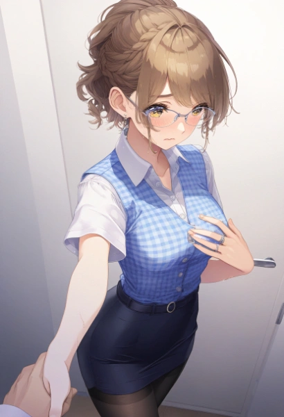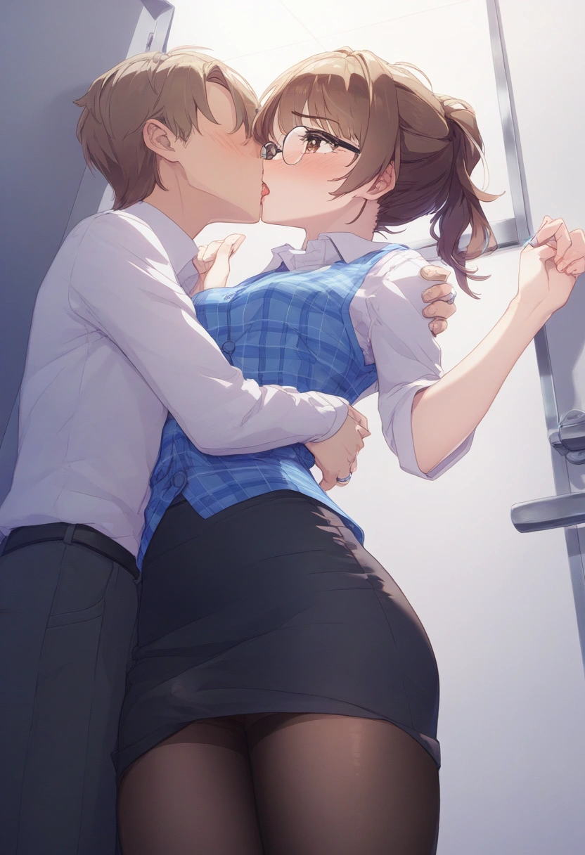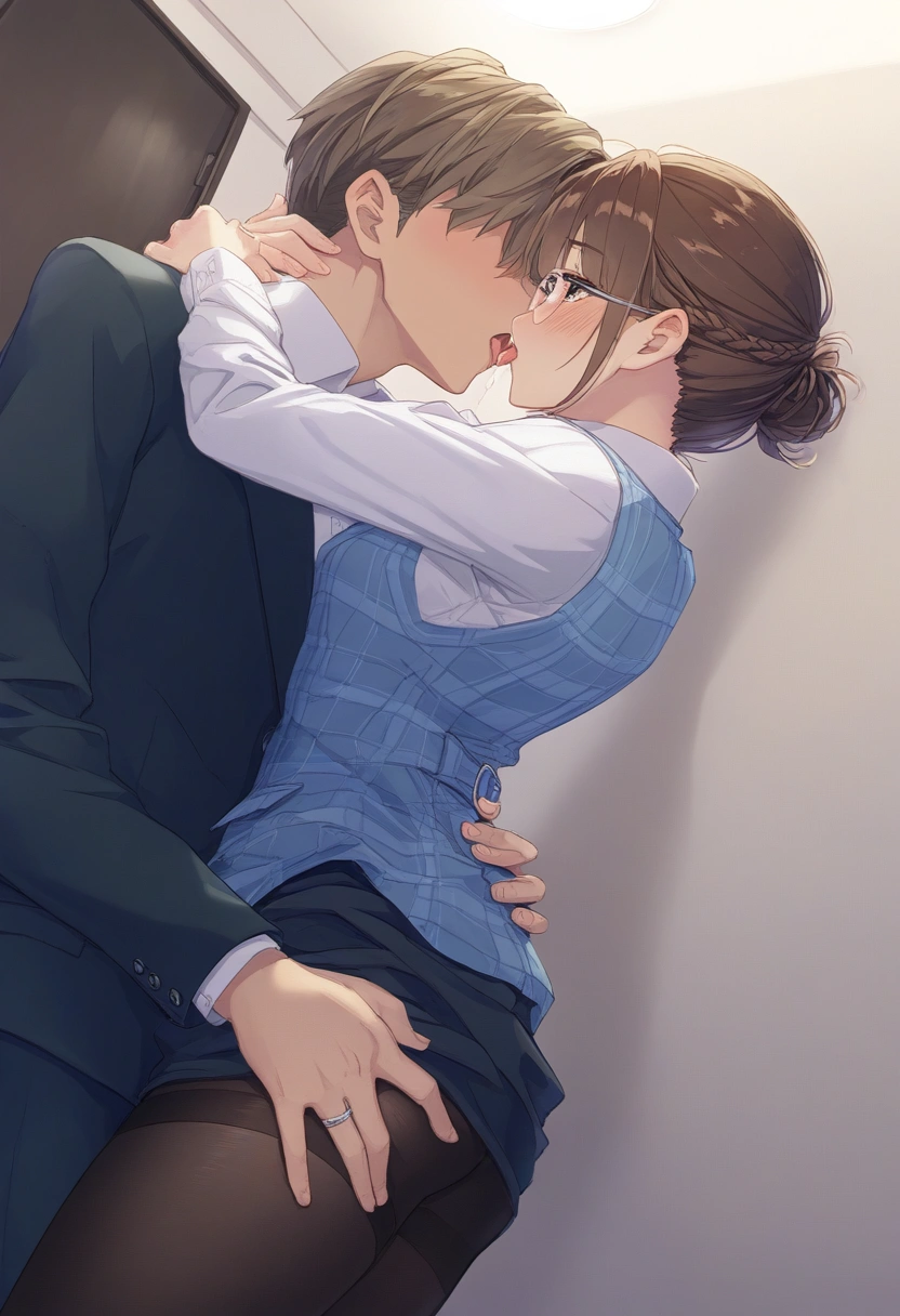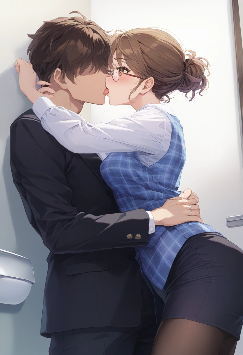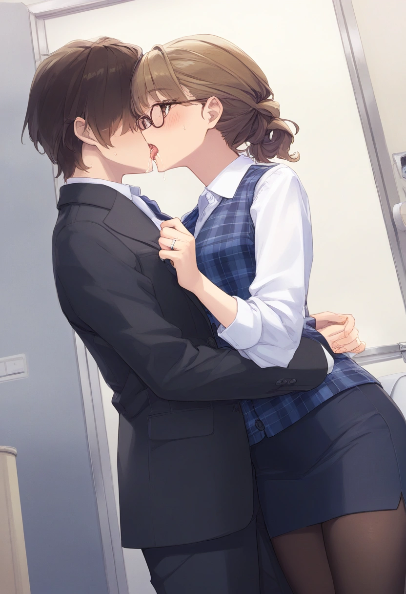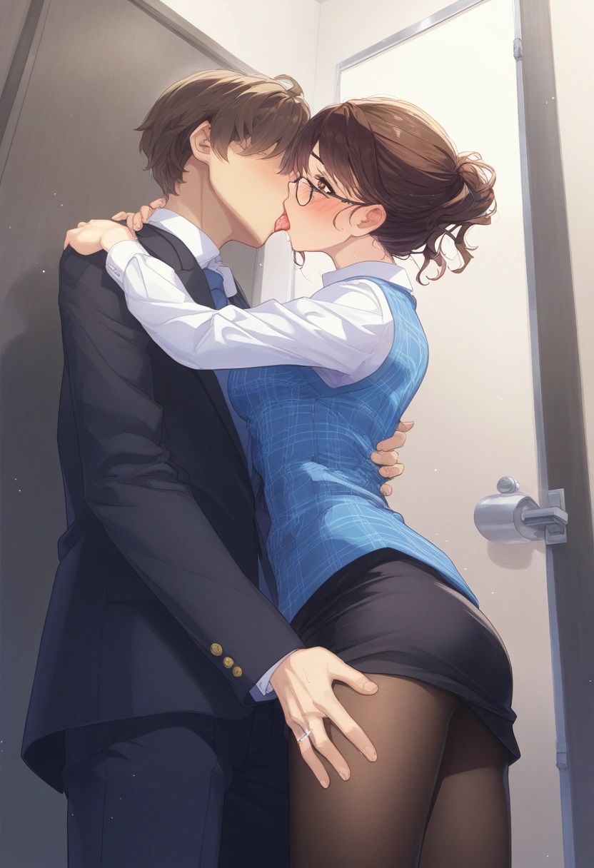 prompt: {NSFW},{{very aesthetic}},{{{best quality}}}, {{{fine detail}}}, {{{Amazing}}}, {{{finely detail}}}, {{{highly detailed CG unity 8k wallpaper}}}, {{{illustration}}},cowboy shot,beautiful,{{{25 years old,intellectual Married woman}},(very cute face:1.2),(wavy long brown Braid hair:1.2)}}},{{beautiful detailed hair}},(anime eyes),beautiful detailed brown eyes,brown shiny hair tied and uped back tightly,beautiful flat chest,clear beautiful skin,medium breasts,{{light makeup,intellectual glasses,simple earring,office worker uniform,clear sky blue plaid vest on the dress shirt,{{woman\\\\\\\\\\\\\\\'s wedding ring in her left ring finger},beautiful black tights,simple medium office worker uniform Tight skirt},{{in multipurpose toilet of Private room at the company},{{{{hetero,Adultery,Cheating,1pure Married woman kissing 1faceless man in suit,face to face deep kissing and hugging,a woman and a man standing by the door and intertwining their tongues},{shamefaced,saliva,happy and embarrassed,}from below left side view