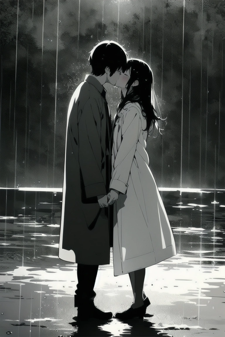 レインコートと言えば映画やドラマでしか見ないようなイメージなので、いかにもな感じの雨中のキスシーンを生成してみました