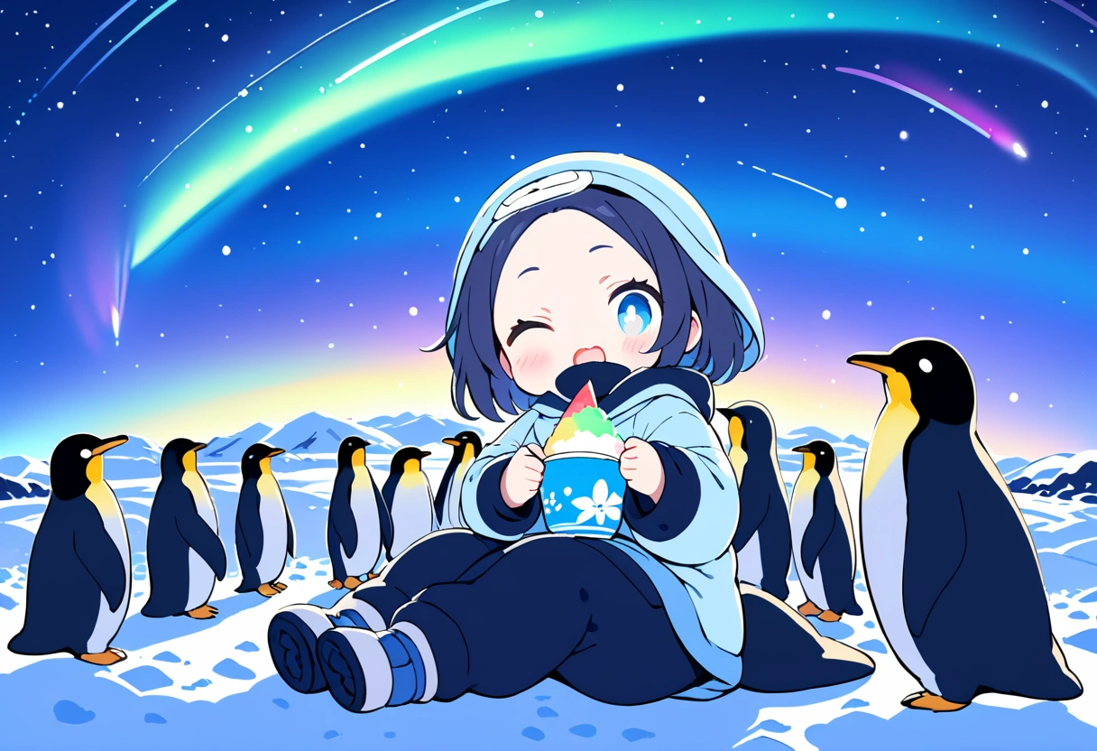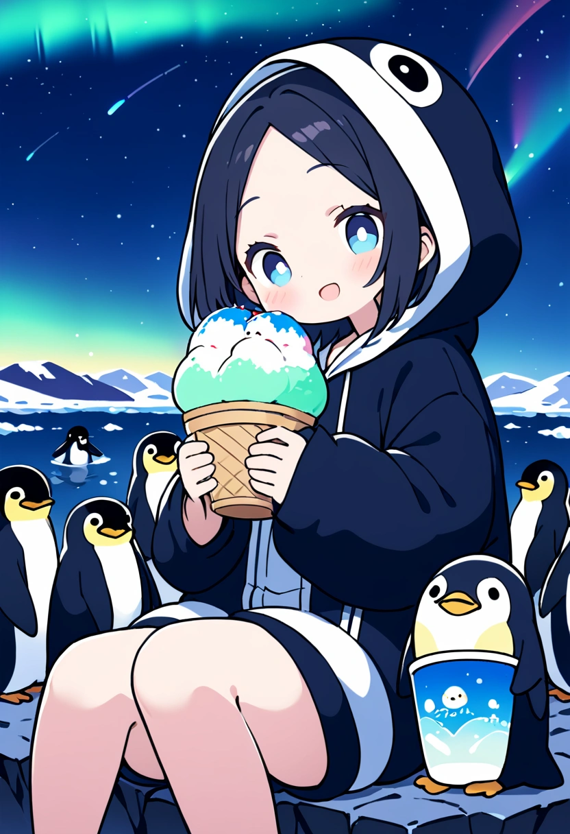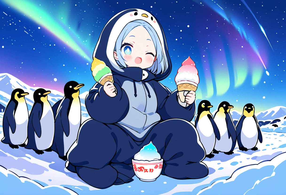 I created it based on the image of a girl who loves cold things eating ice cream and shaved ice in the extreme cold of Antarctica, with a starry sky and aurora in the background, and curious penguins surrounding her.