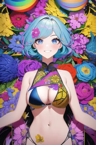 prompt: masterpiece, best quality, masterpiece,popcolor,bestquality,zentangle,fractal art,colorful,1girl,fusion of china dress and bikini in front of navel,midriff,large breasts,upperbody,midium hair,blue eyes,smile,dirndl,around flower, around flower,around flower,around flower,colorful,colorful,colorful,colorful,colorful,colorful,colorful,(vivid color:1.4), vibrant color, bold color, , absurdres, ultra detailed, all intricate, highres, colorful, dynamic, official art, beautiful and aesthetic BREAK screen printing, silkscreen art, bold graphics, layered colors, printmaking technique, versatile medium, pop art influence BREAK papier collé, paper collage, layered compositions, varied textures, abstract designs, artistic juxtapositions, mixed-media approach,(pastel pop color),(impressionism:1.3),{{{{{illustration, illustration, illustration, illustration, illustration}}}}},detailed CG unity 8k wallpaper,clear,Highly Detailed beautiful and aesthetic,an extremely delicate and beautiful,delicate facial features}}} ,{{{beautiful Background}}},{{{detailed background}}},,