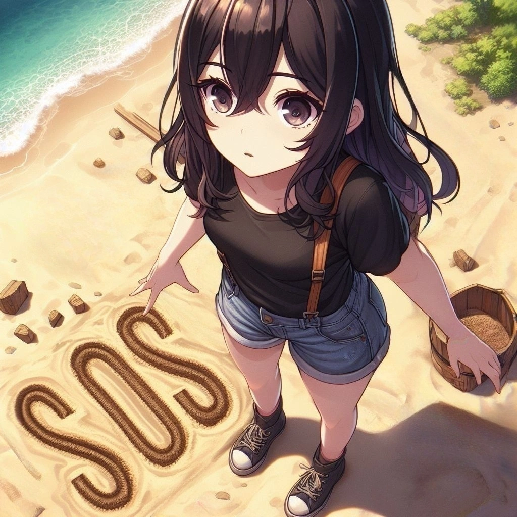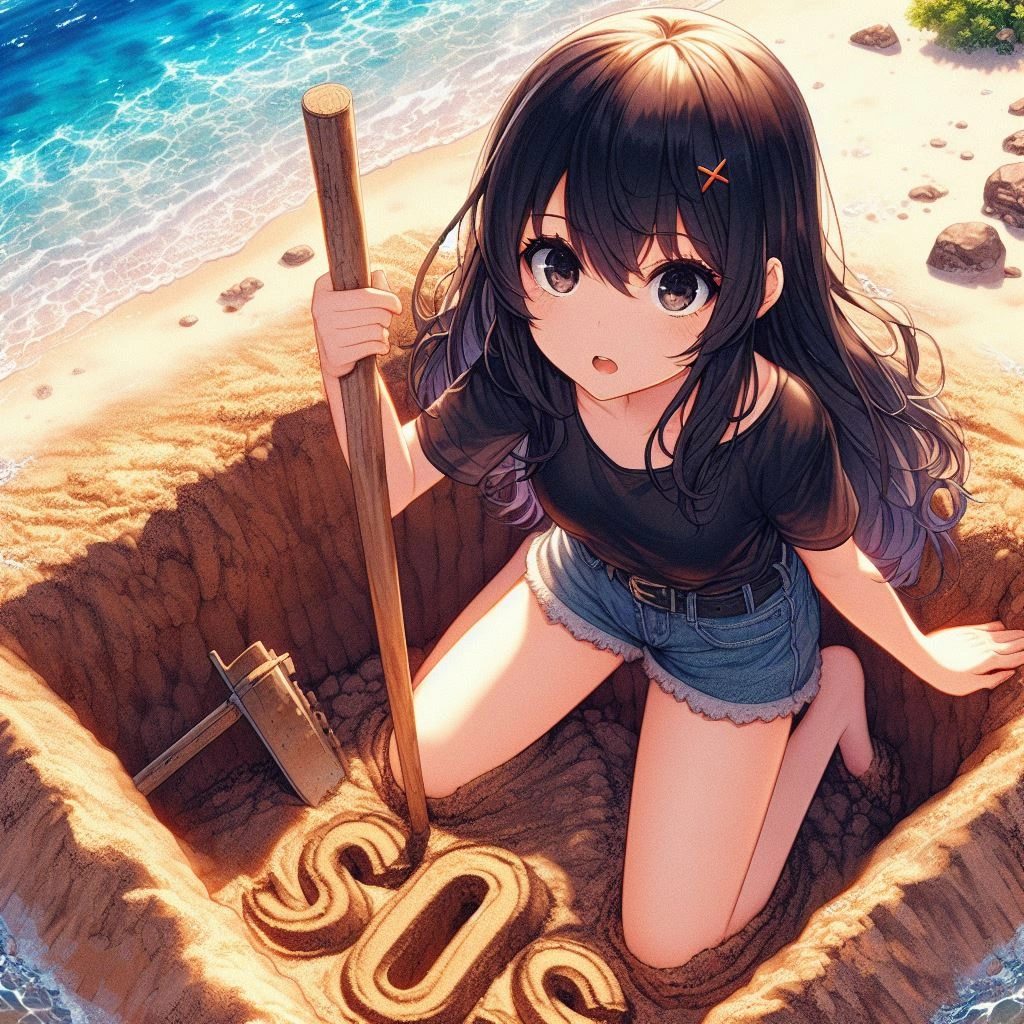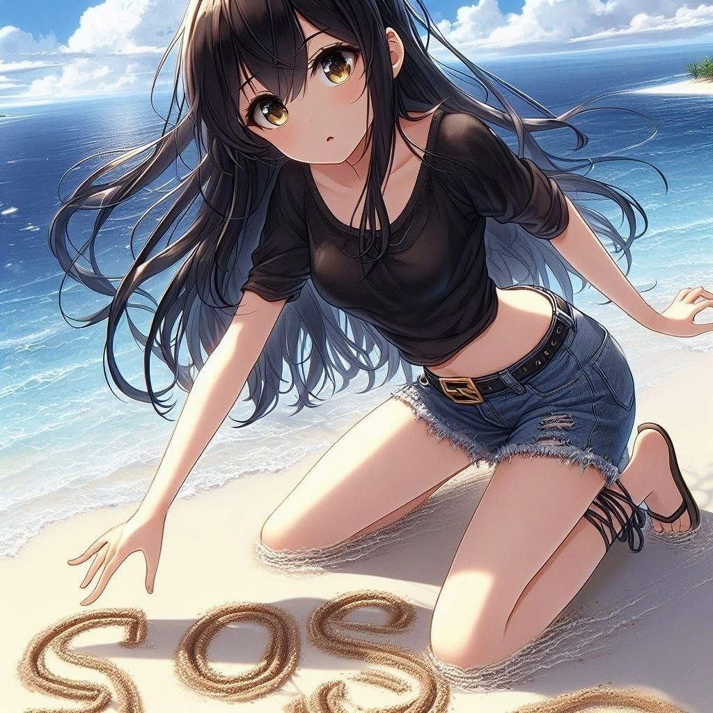 ホントは砂浜に大きく「SOS」って書きたいんですよー! なので砂浜にでっかく文字を書いてもらったら、 https://www.aipictors.com/works/321492/ こんな感じになりましたー!w でけーっ!