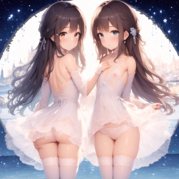 prompt: {{{2 girls,yuri}}},{{{one is flat chest and the other is large breasts}}},{{{little delicate girl}}}, highly detailed skin,beautiful detailed eyes,{{{Cute and round eyes that are big like a child}}}, {{{Eyes that reflect the underwater scenery and light}}},Soft and rounded facial contours,Childish and soft impression, Large and almost perfectly round eyes, body, ai-generated,{{{ amazing quality, very aesthetic ,highres}}},blue leotard, high leg leotard, blue shoulder armor, blue cloak, blue thigh high boots,holding sword,{{{{{library}}}}},light smile,light brown eyes,white leotard, high leg leotard, white shoulder armor, white cloak, white thigh high boots,holding sword