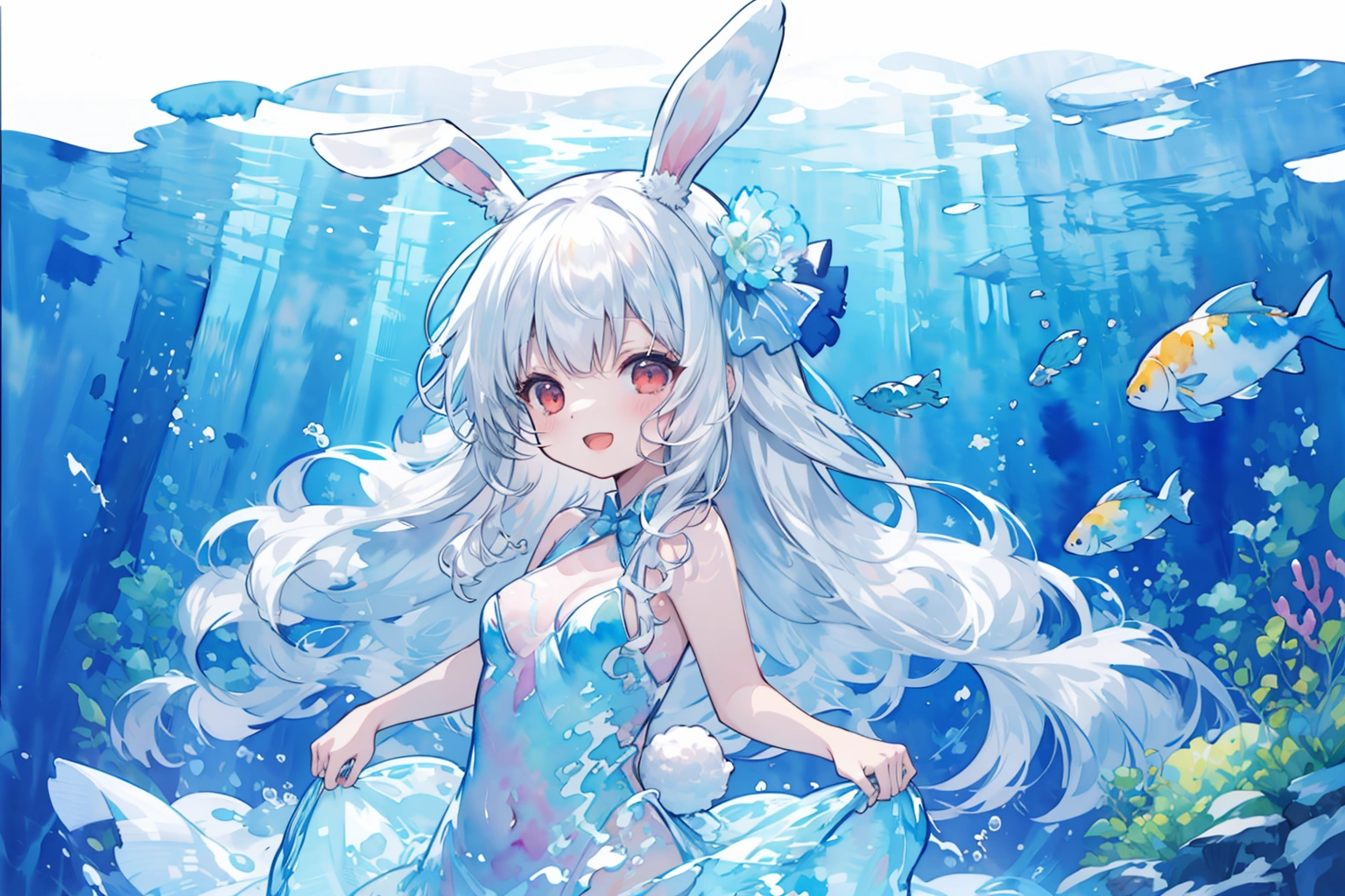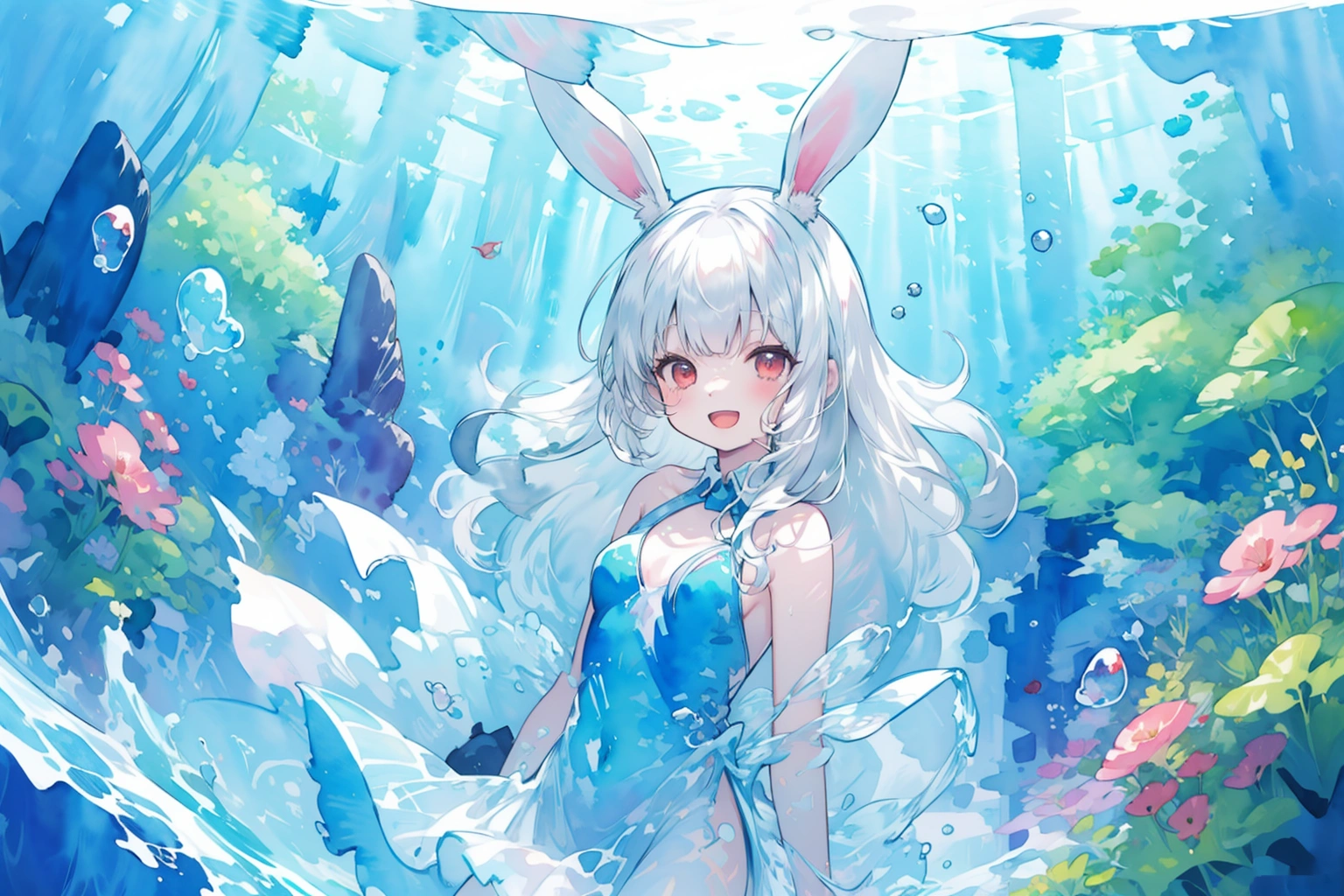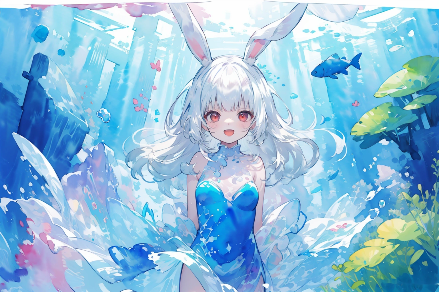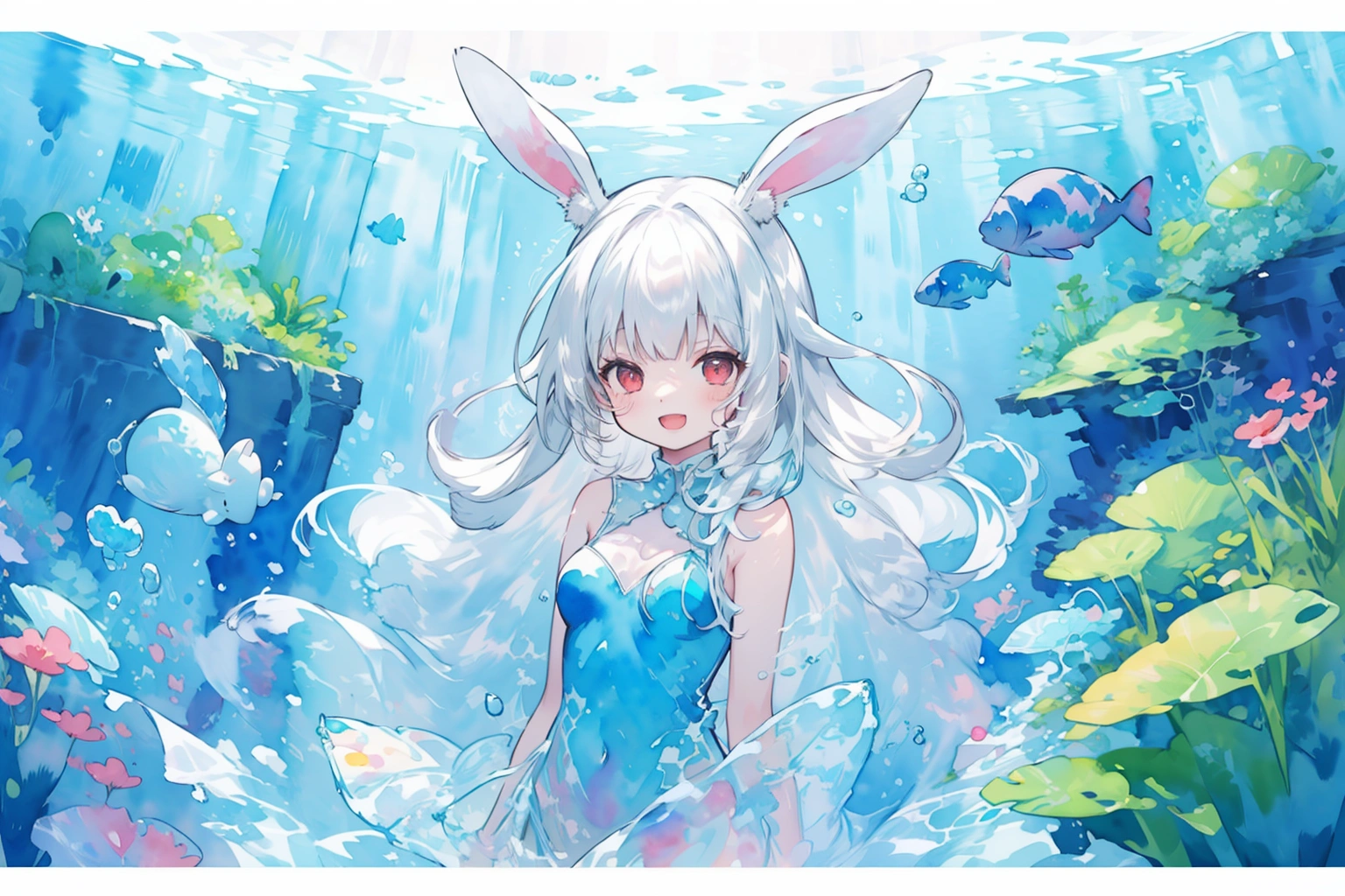 A white rabbit playing in the water wearing a watercolor dress♪