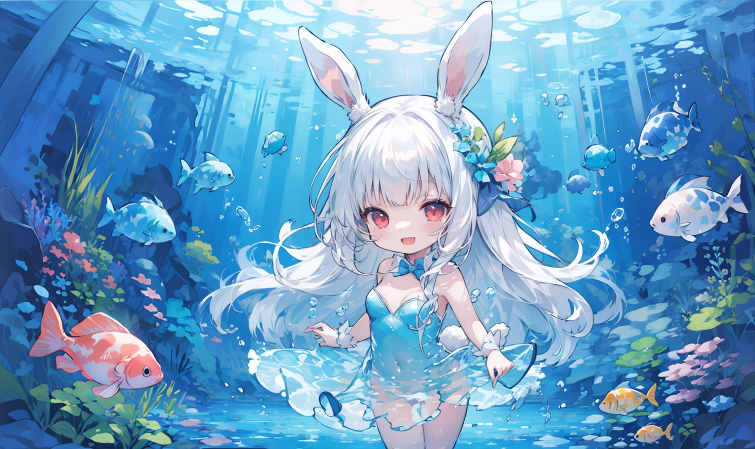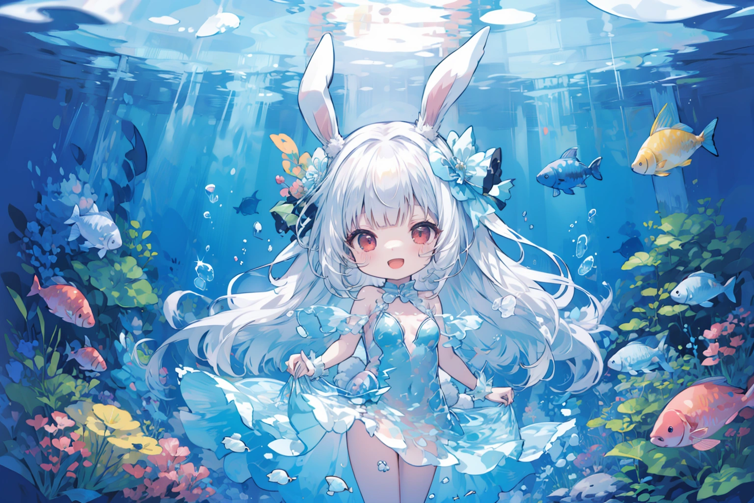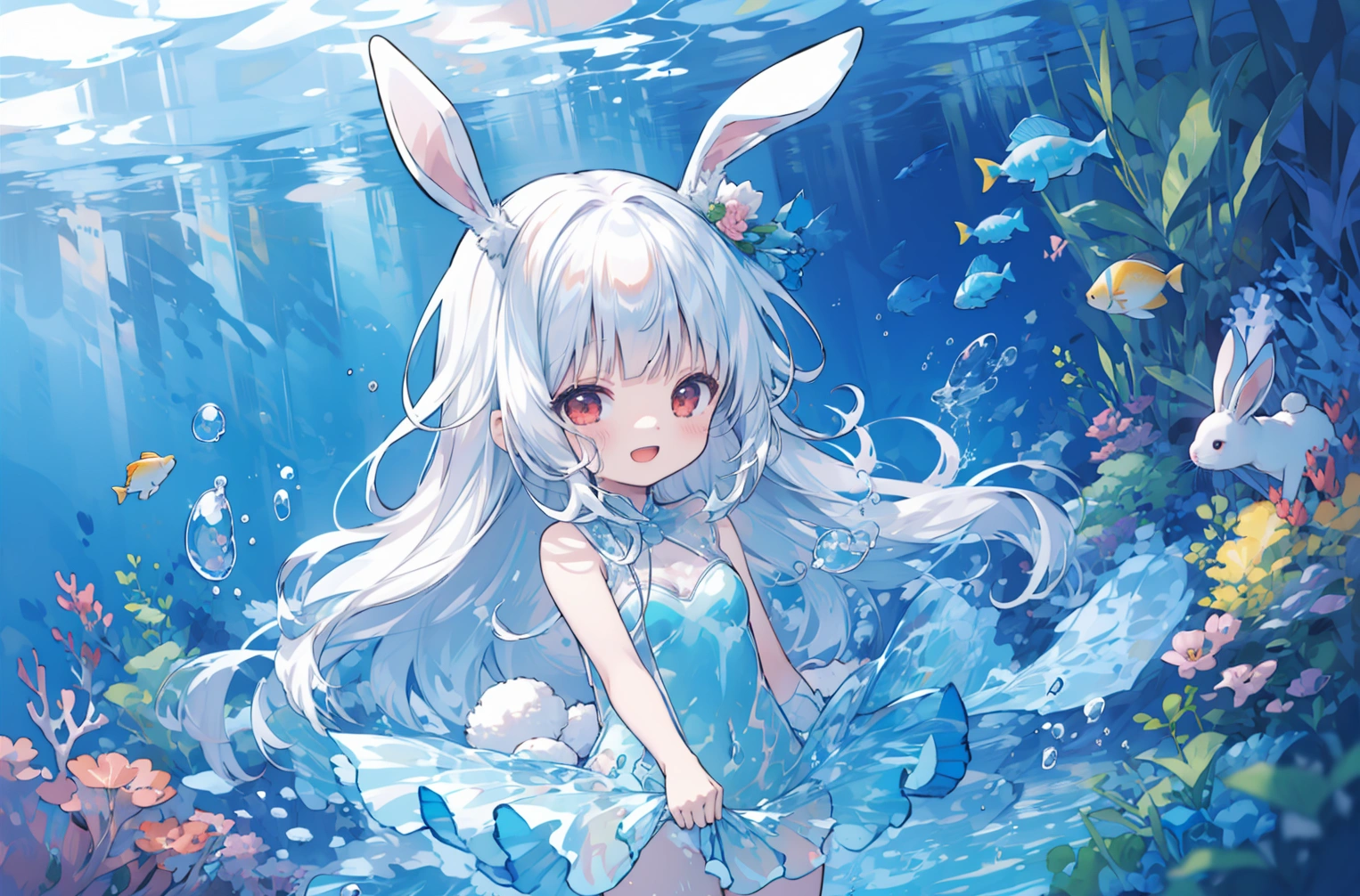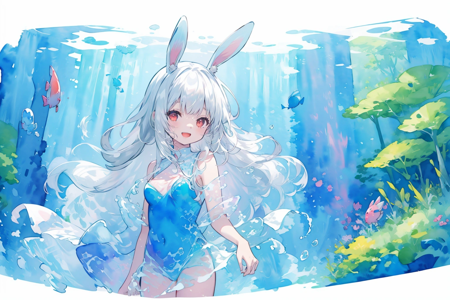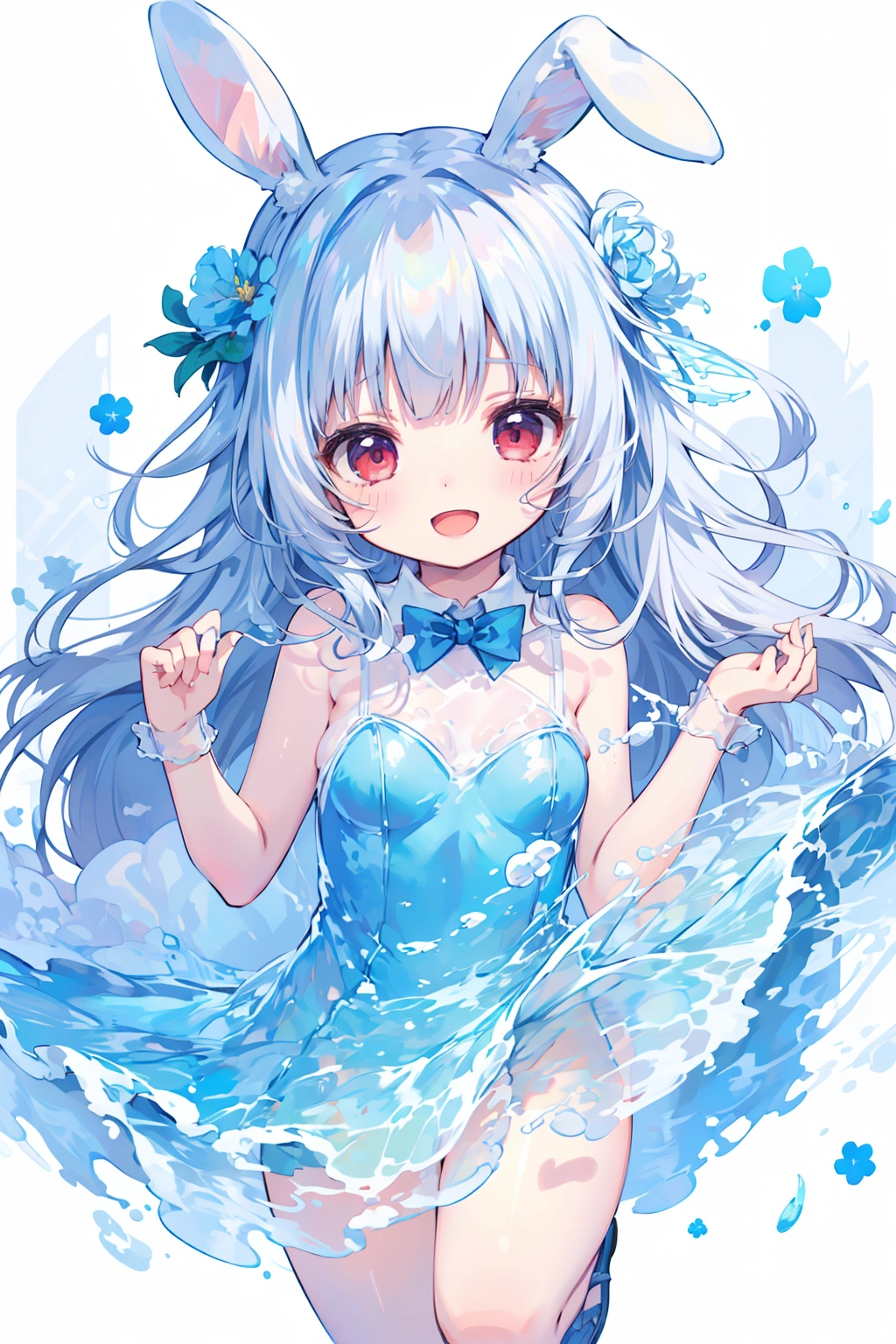 A white rabbit playing in the water wearing a watercolor dress♪