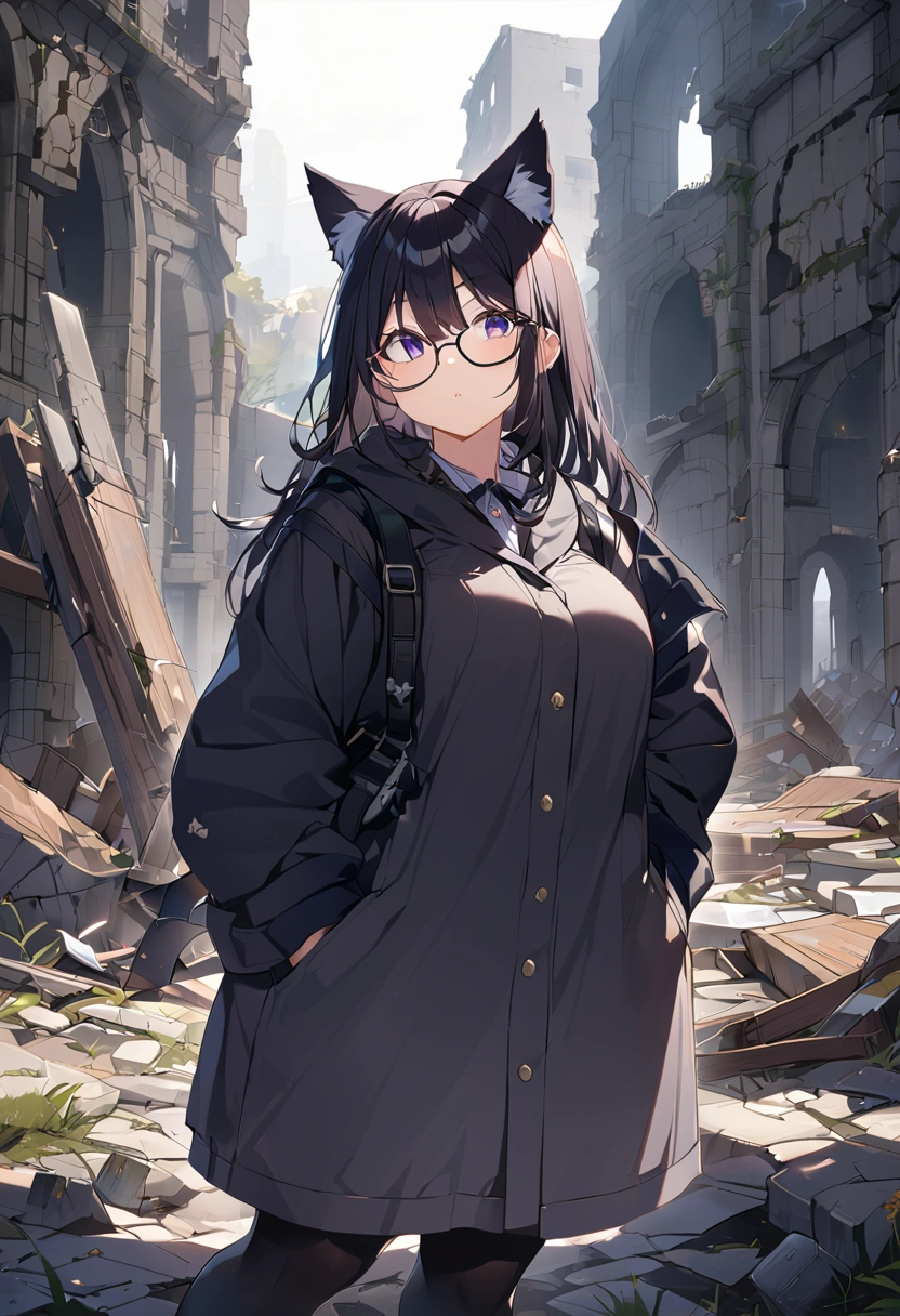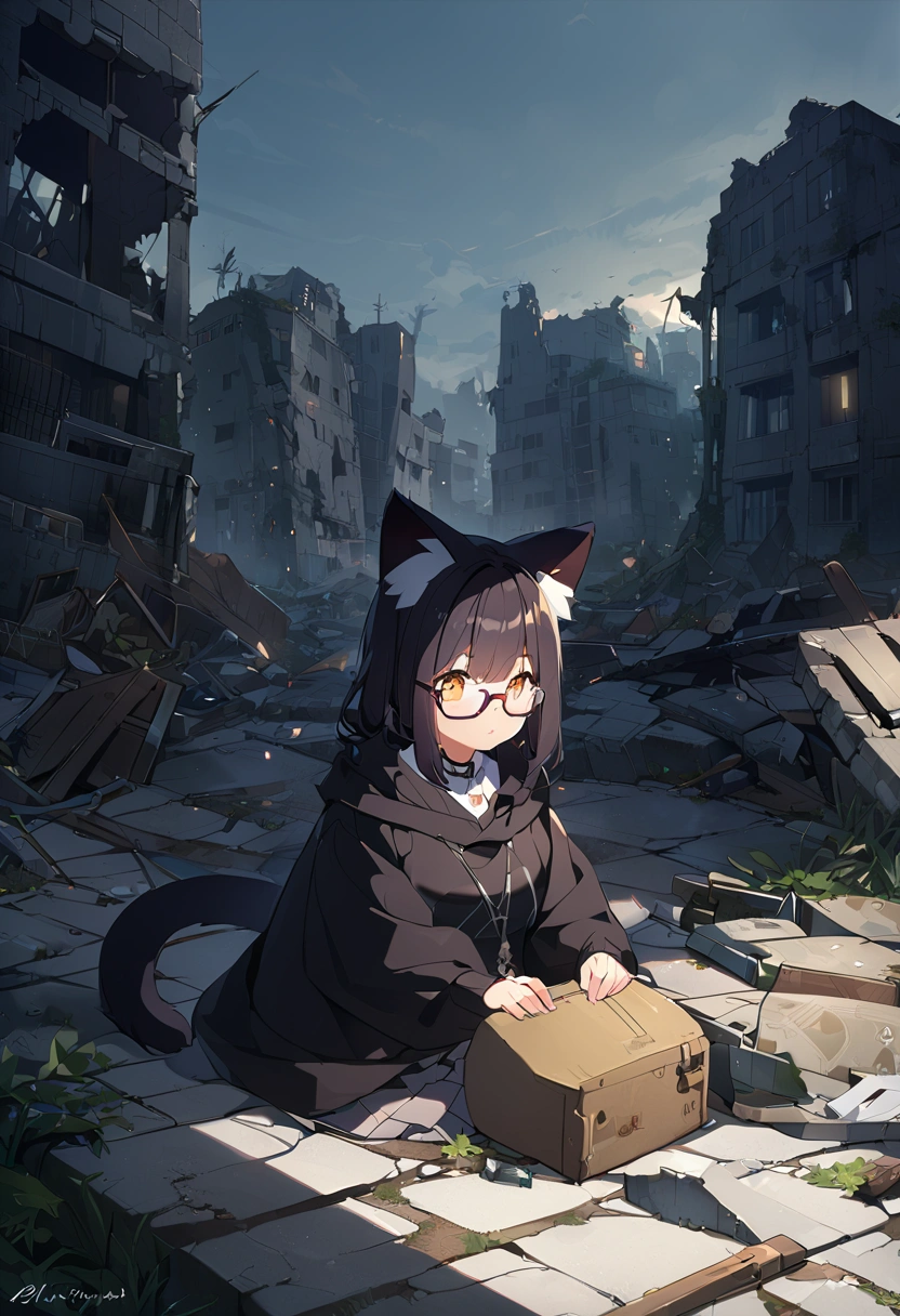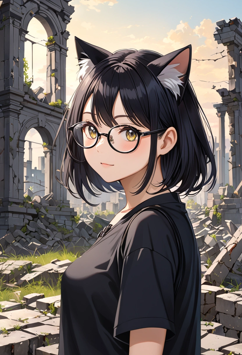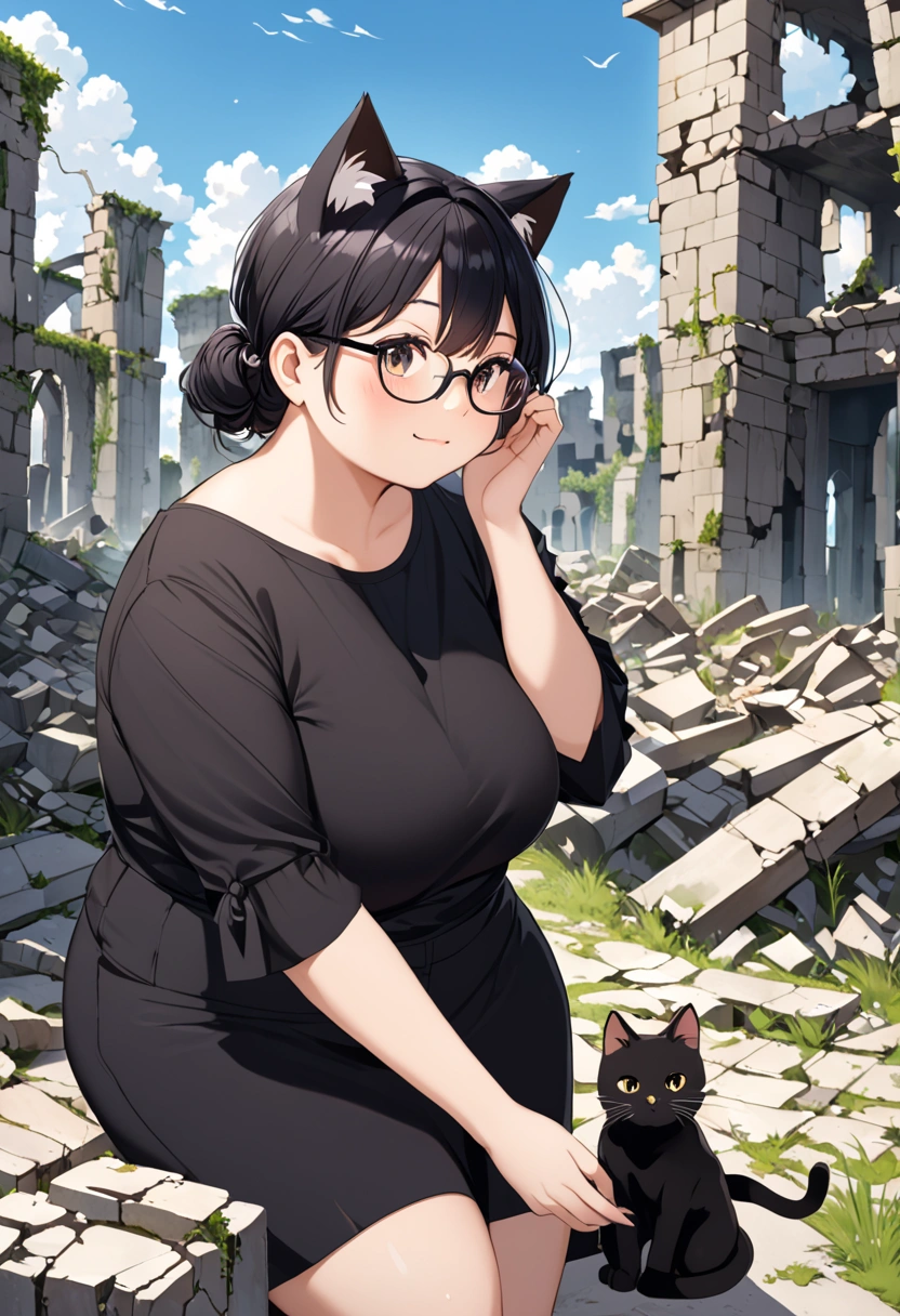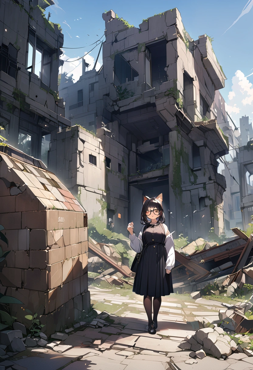 A black cat wandering through the ruins (anthropomorphic)