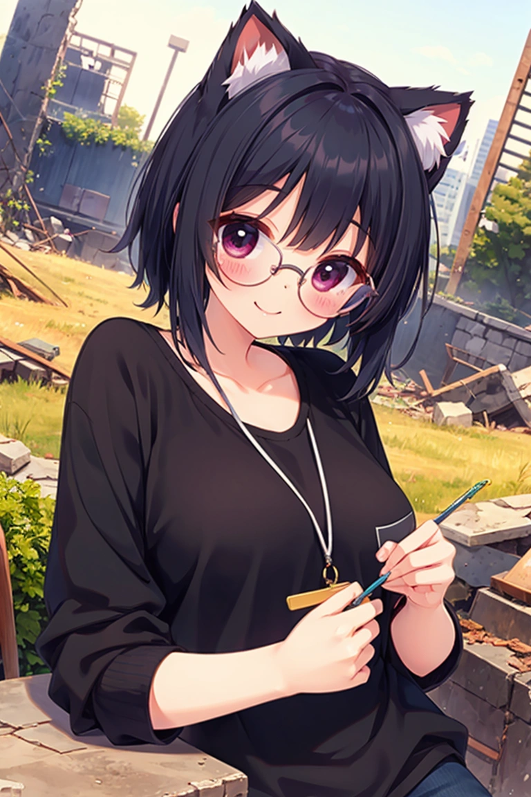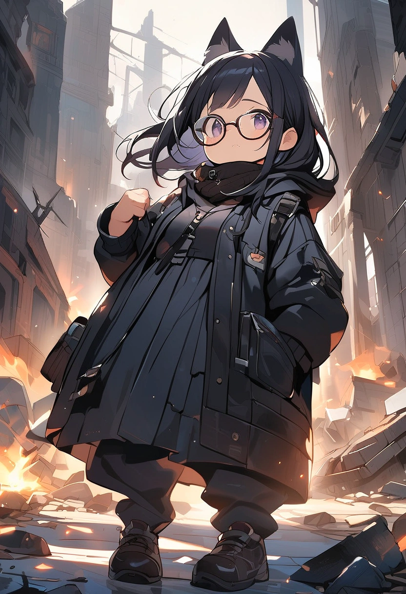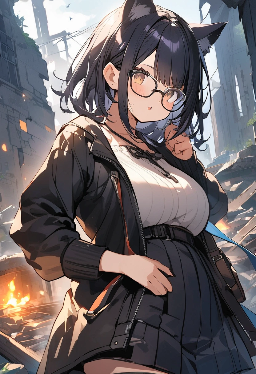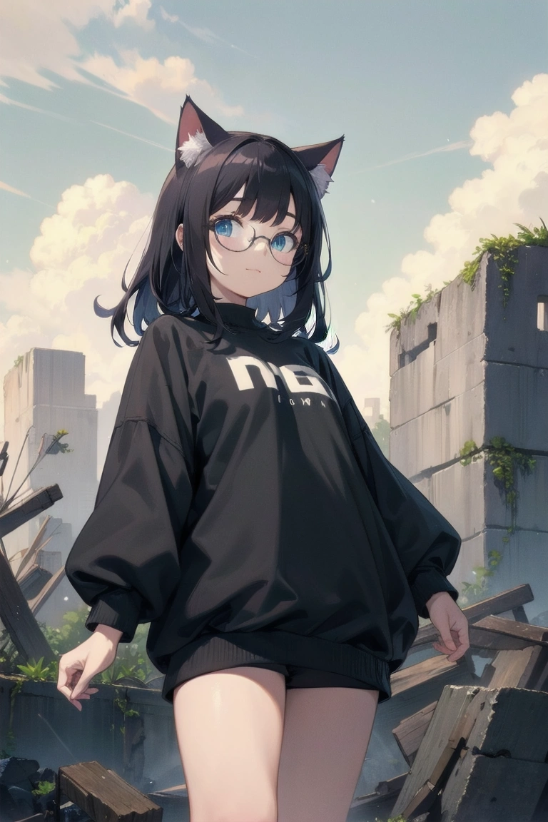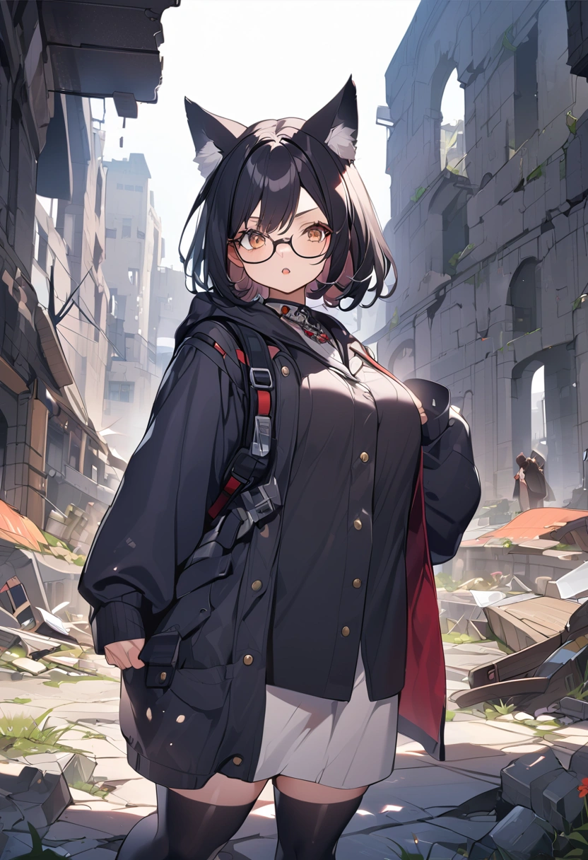 A black cat wandering through the ruins (anthropomorphic)