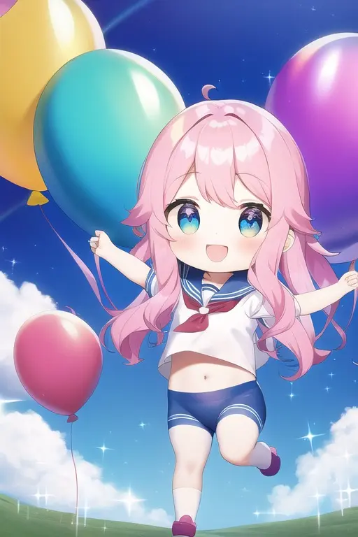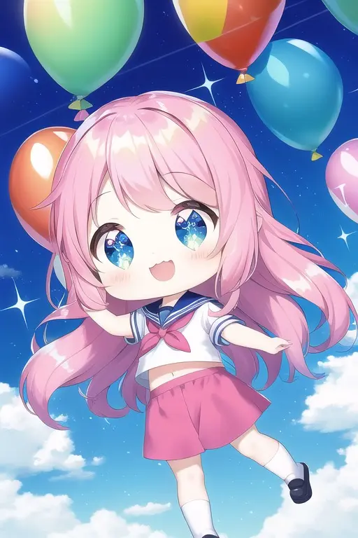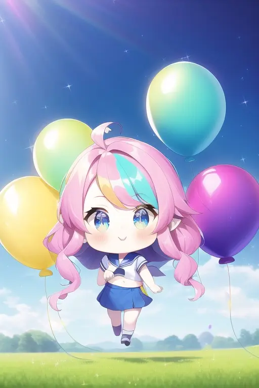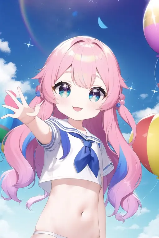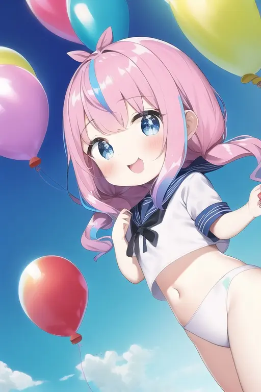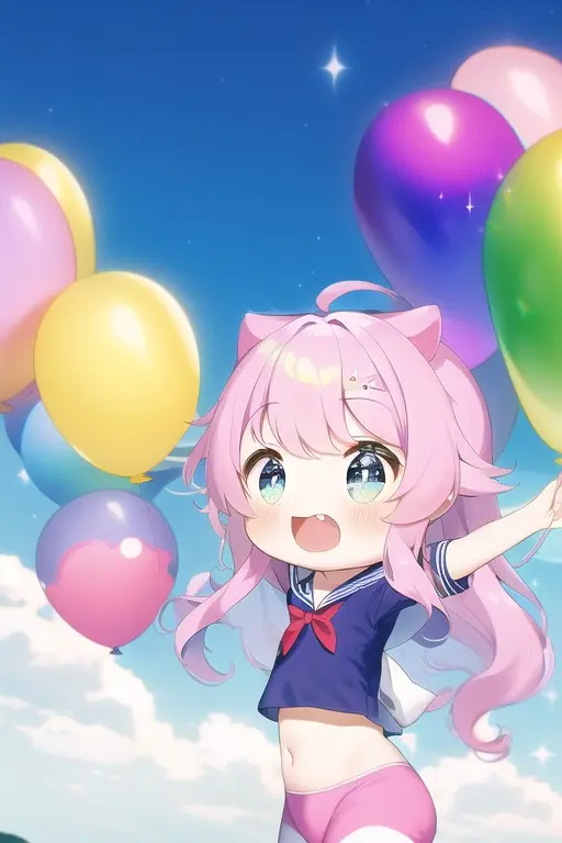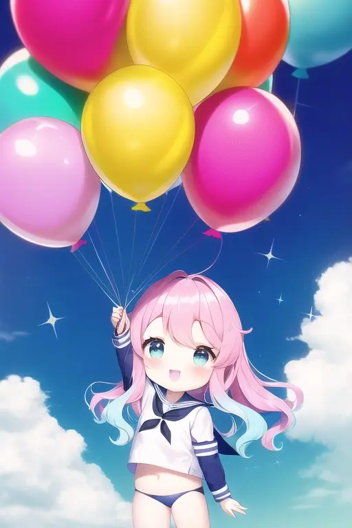 prompt: masterpiece, best quality, (masterpiece), (best quality), (ultra-detailed:1.1), (illustration), (wide shot:1.2), sky, (beautiful scenery:1.2), (flying:1.2), (many colorful balloons:1.2), (dynamic pose:1.1), (short girl:1.3) (loli:1.3) (chibi:1.3) (toddlercon:1.2) (toddler body:1.2) (loli face:1.3) (4yo:1.2), (beautiful detailed eyes:1.1), (highlight in eyes:1.2),(fusion of sailor uniform and ao dai in front of navel,midriff,navel cut out),sparkling colorful highlights in the eyes, (long wavy hair:1.2), (pink head hair:1.1), skyblue tip hair, , (pastel color hair:1.2), (colorful hair:1.2), (gradient hair:1.4), (((tareme))), ((pastel color)), (cat ears:1.1), (nekomimi:1.1), smile, happy, (wide shot:1.2), (balloons:1.2), Imagine a young girl soaring through the sky, held aloft by a multitude of vibrant, colorful balloons. Her eyes sparkle with delight as she gazes at the breathtaking scenery below. The balloons dance around her, their vivid hues of red, blue, yellow, and green contrasting beautifully against the clear blue sky. Her hair billows gently in the breeze, while her dress flutters gracefully as she floats higher and higher. (balloons:1.2), The world below seems to shrink in size, as the girl marvels at the patchwork of landscapes, from lush green fields to bustling cities, all connected by meandering rivers and winding roads. Her joyful laughter echoes through the sky, as she embraces the thrill and freedom of her incredible aerial adventure. (balloons:1.2),