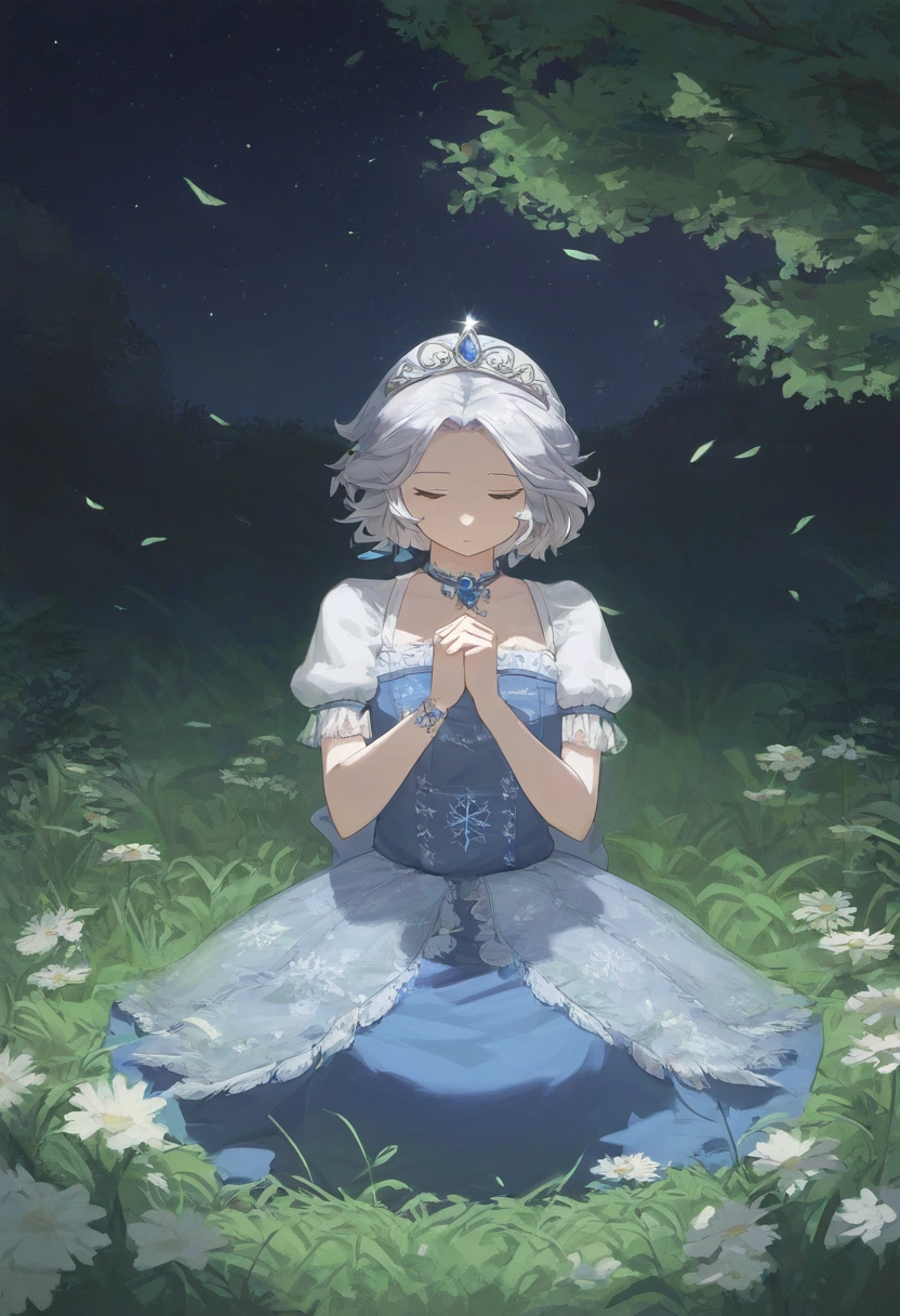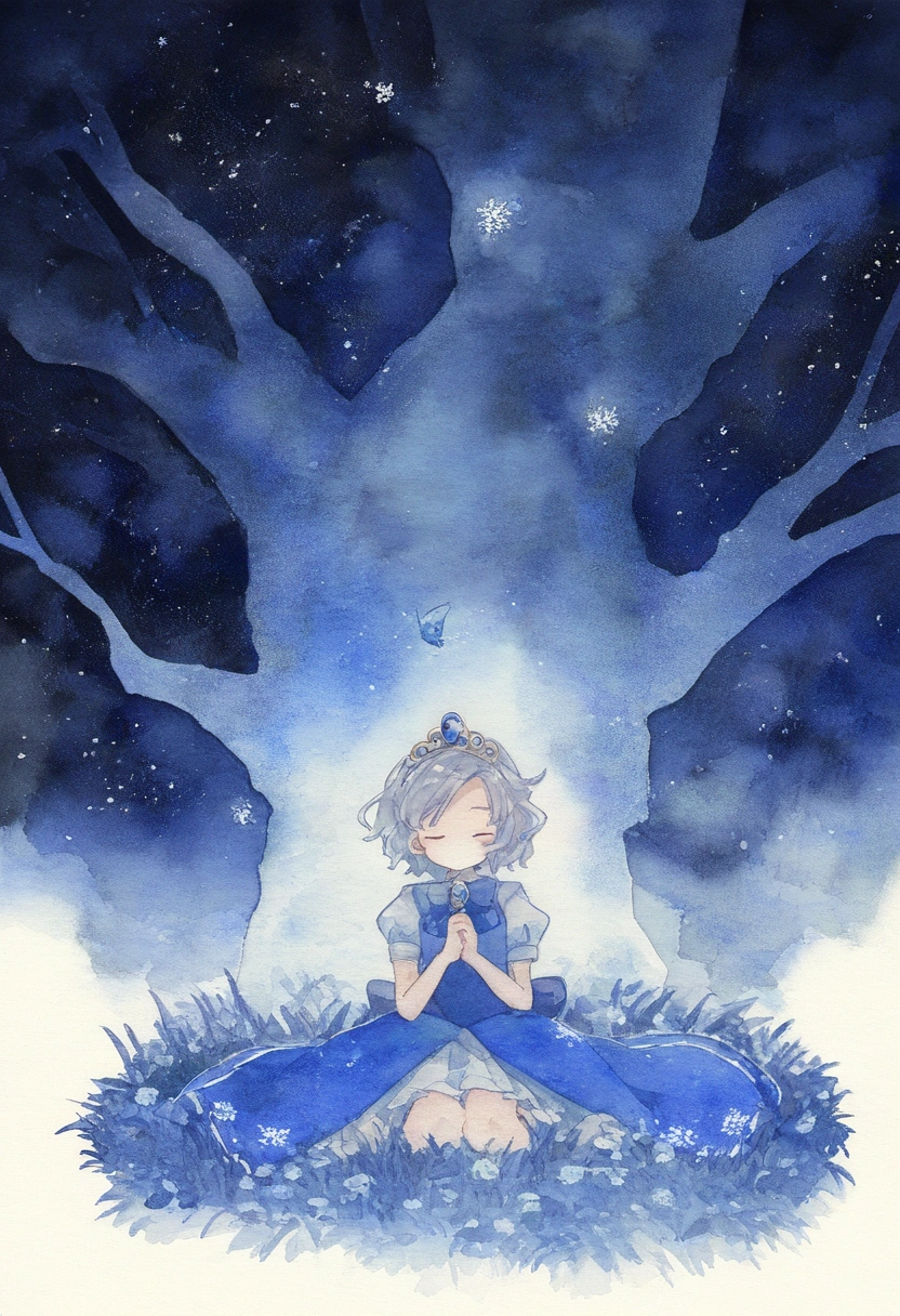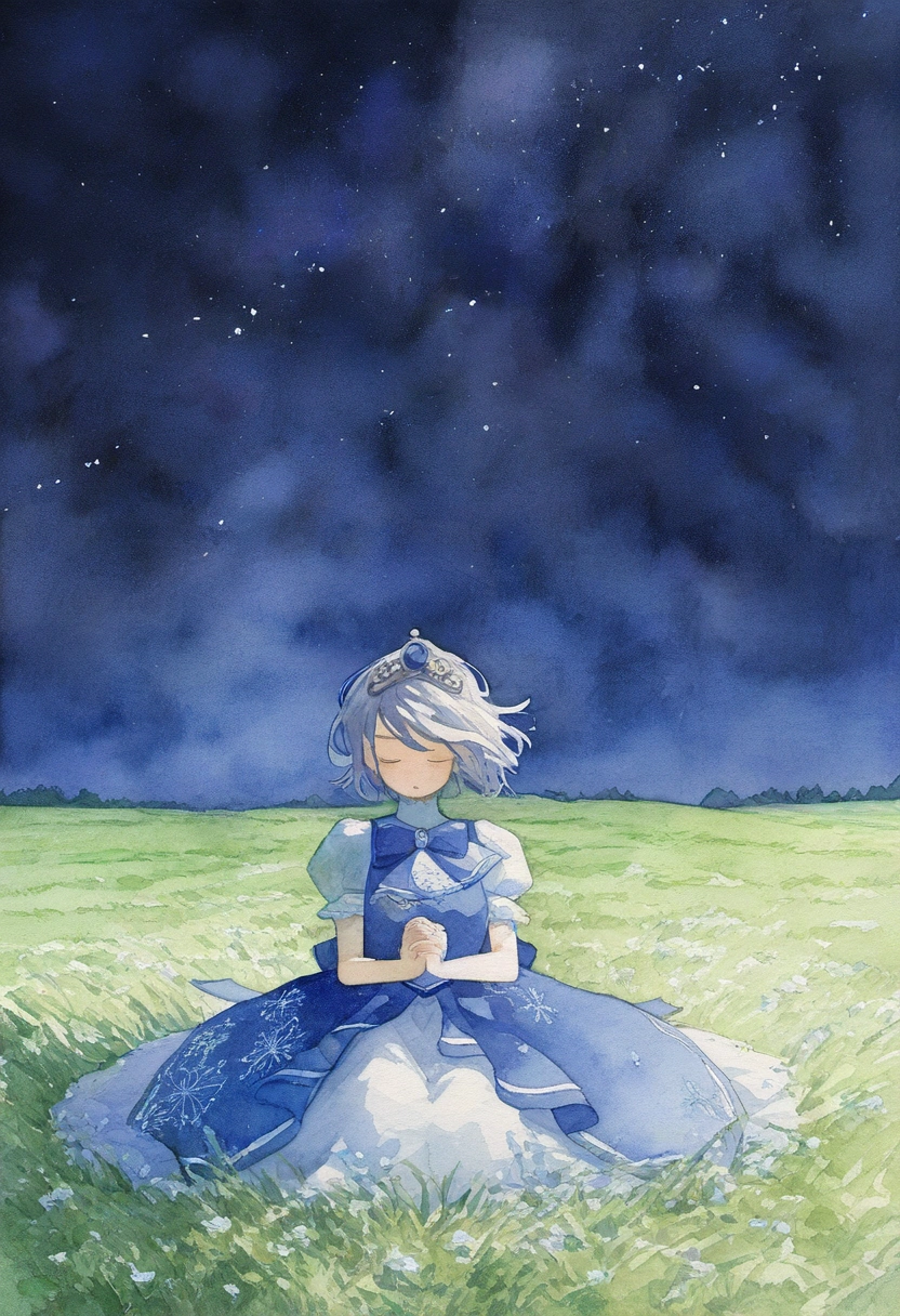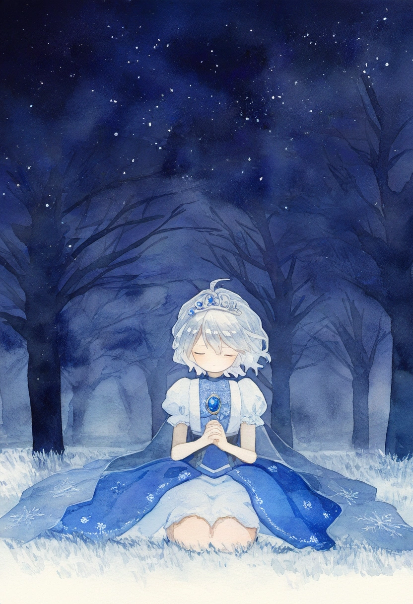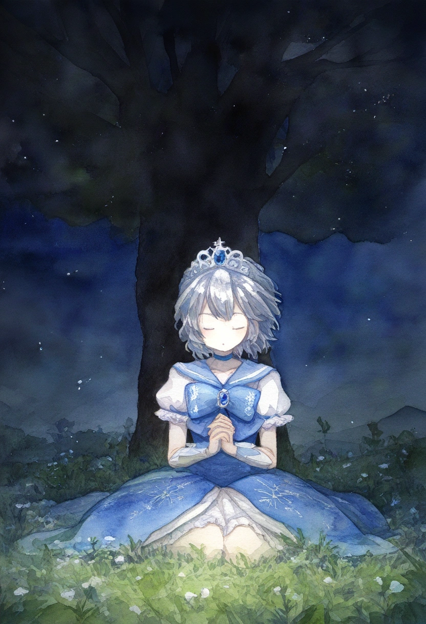 prompt: watercolor (medium), linear hatching, night, under tree, grassfield, sitting meditation, [[praying]], the little sturdy magical girl, slender, littel toned body, short hair, {{inward curl hair}}, clear silver hair, fair skin, [[closed eyes]], indigo dress, embroidery, snowflake embroidery, short sleeves, white sleeves, blue jewel on chest, princess tiara, armlets, kawaii, cute, brave, precious, gracefully, best detailed, best quality , , best quality, amazing quality, very aesthetic, absurdres