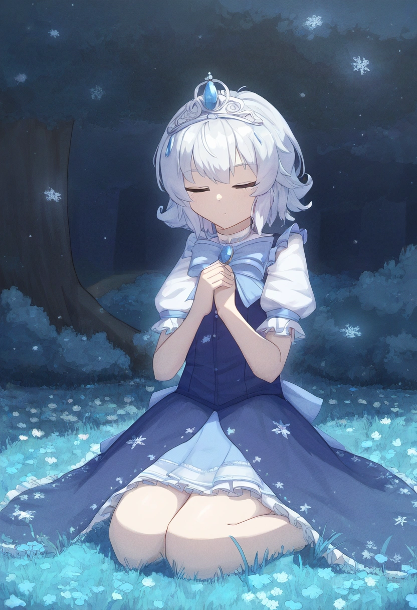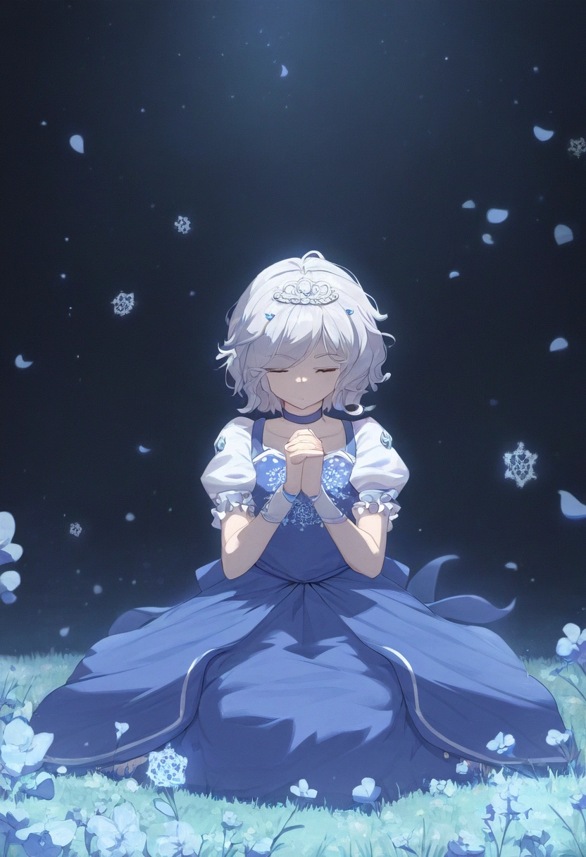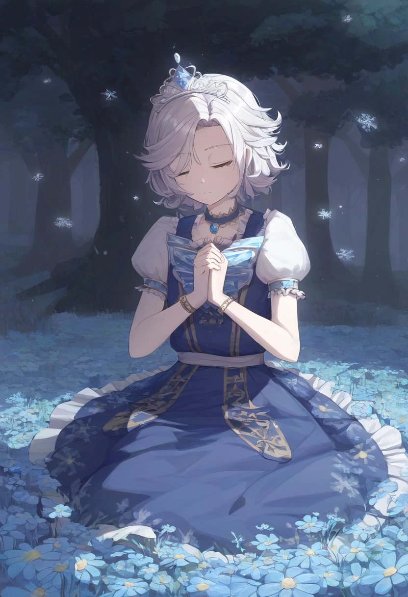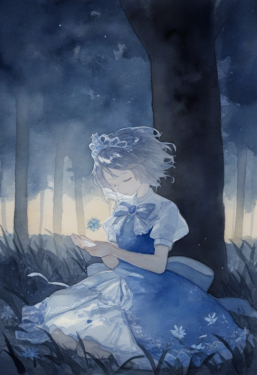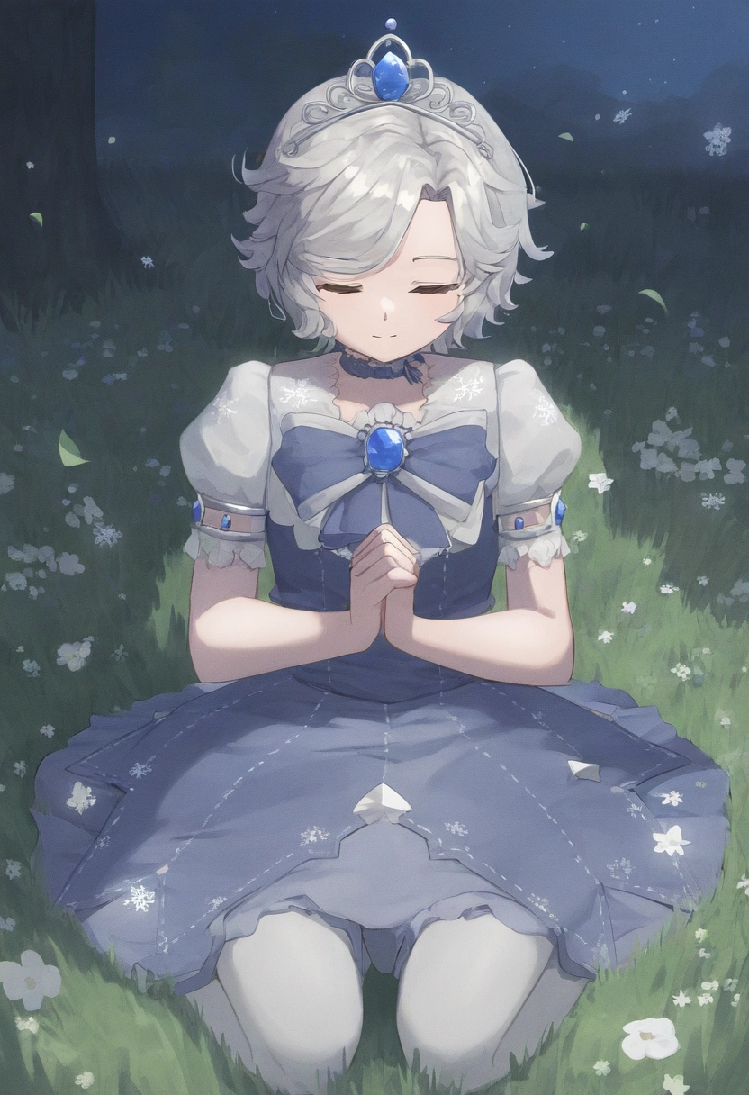prompt: watercolor (medium), linear hatching, night, under tree, grassfield, sitting meditation, [[praying]], the little sturdy magical girl, slender, littel toned body, short hair, {{inward curl hair}}, clear silver hair, fair skin, [[closed eyes]], indigo dress, embroidery, snowflake embroidery, short sleeves, white sleeves, blue jewel on chest, princess tiara, armlets, kawaii, cute, brave, precious, gracefully, best detailed, best quality , , best quality, amazing quality, very aesthetic, absurdres