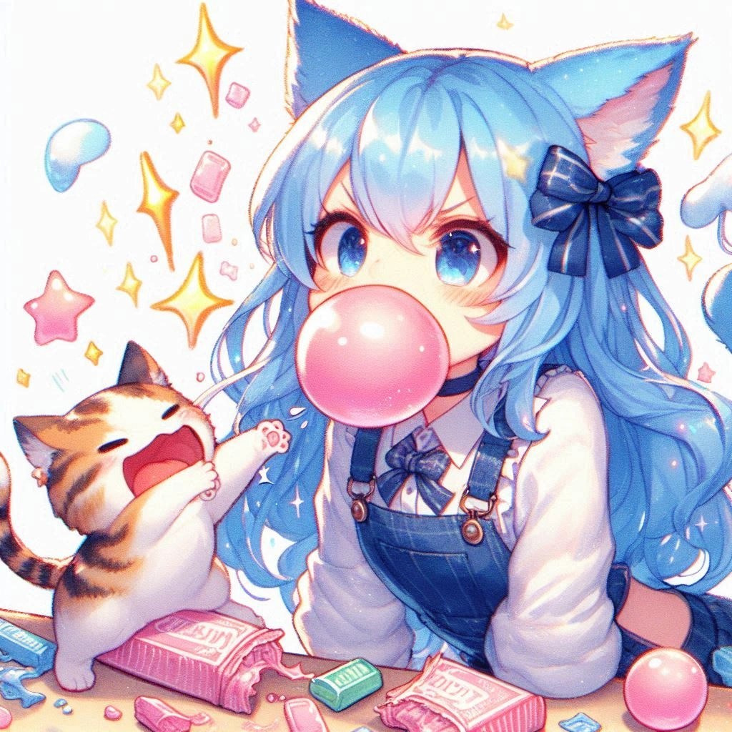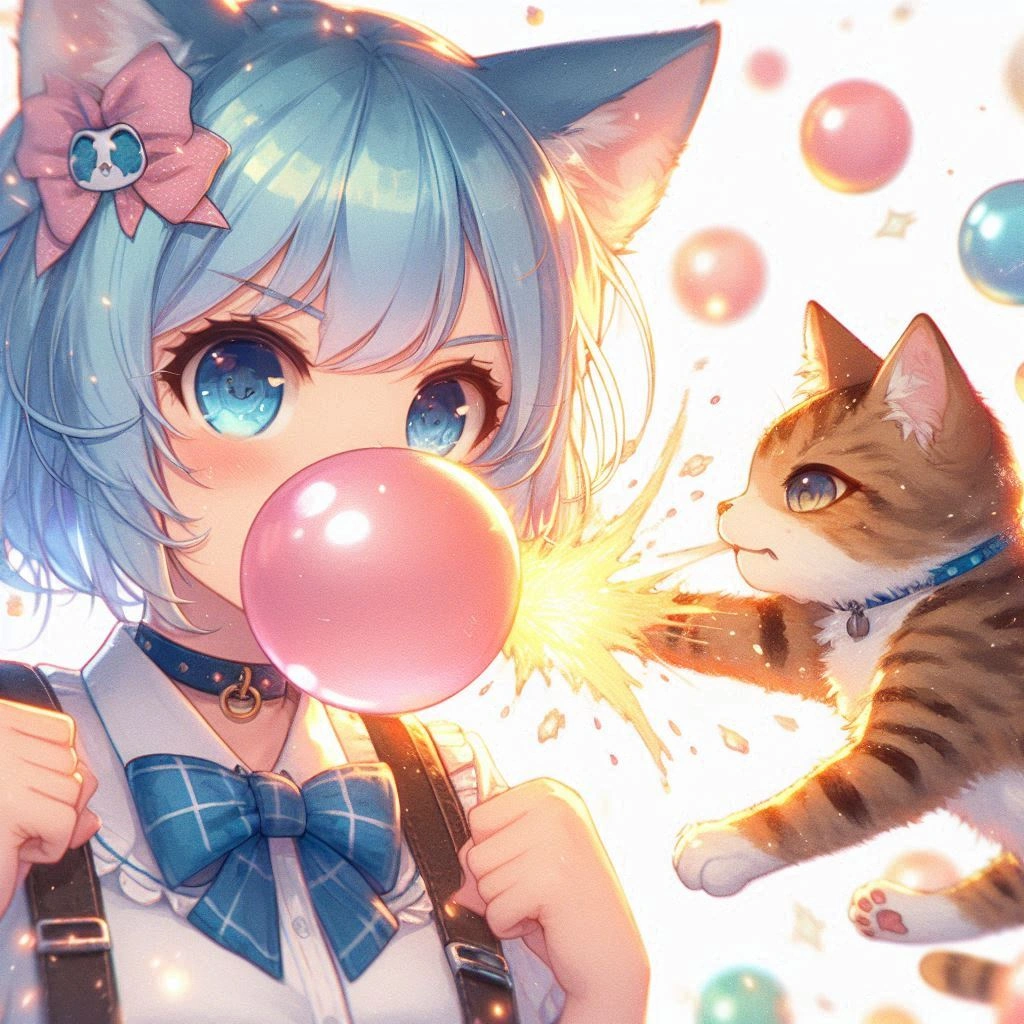 A kitten aims at the chewing gum that the blue-haired cat ears are inflating.