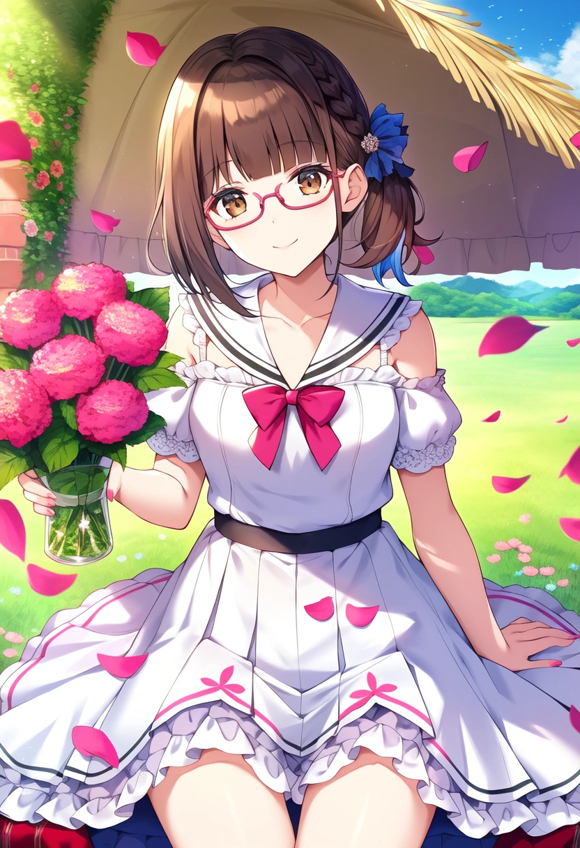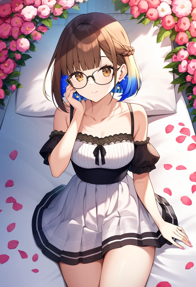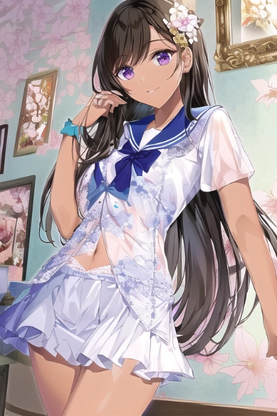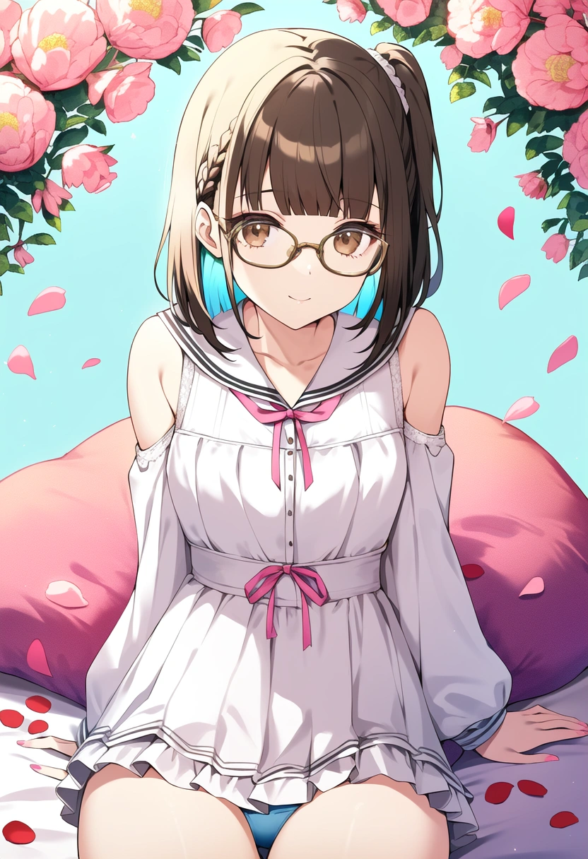 prompt: very aesthetic, best quality, absurdres, In a picturesque scene, a girl lies on a luxurious canopy bed, surrounded by the gentle fragrance of pink carnations. Her short black braid hair frames her face, and her warm brown eyes sparkle with a hint of mystery. Adorned in a charming sailor uniform with delicate frills and ruffled sleeves, she reveals her dainty shoulders, while pink petals dance in the air around her. Meanwhile, in the vibrant blue sky, colorful birds soar gracefully, accompanied by a majestic peacock. The girl\\\'s detailed hair and eyes match the beauty of her surroundings, creating a captivating image of innocence and elegance.. official art, {{ultra-detailed}}, {{high resolution}}, dynamic fuzziness, colorful, best quality, cowboy shot, underwear, girl ,solo, 20 years old, beautiful detailed hair, blunt bangs, braid hair, twintail, side ponytail, bob, Shostakovich,