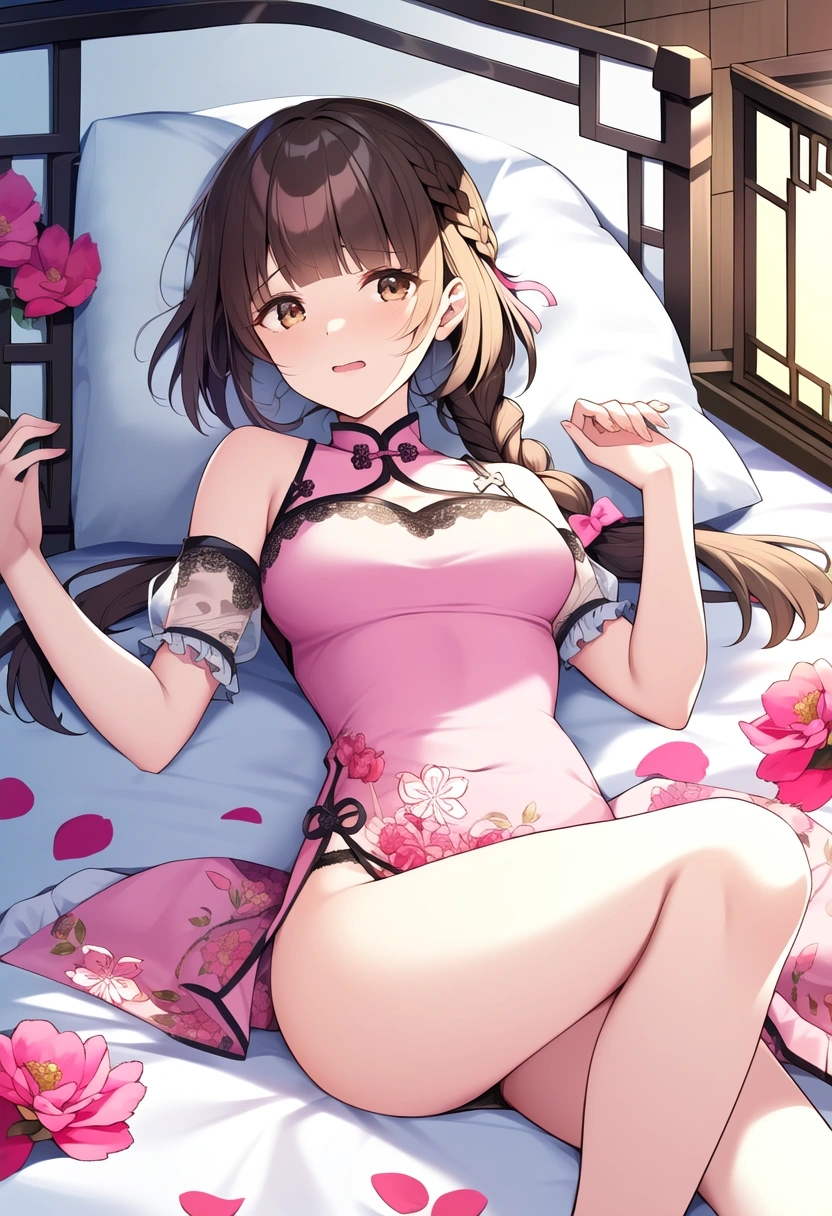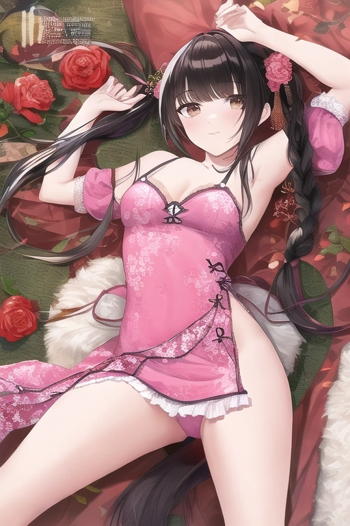 prompt: very aesthetic, best quality, absurdres, girl with short black braided hair and brown eyes lies on a canopy bed, holding a pink carnation. She wears a camisole outfit with frilly trim and ruffled sleeves, the see-through lace material revealing her dainty shoulders. Pink petals float in the air around her, lending an air of mystery to her gaze. In the background, she appears embarrassed as her china dress lifts while lying on her back with open legs in a Chinese room, official art, {{ultra-detailed}}, {{high resolution}}, dynamic fuzziness, colorful, best quality, cowboy shot, underwear, girl ,solo, 20 years old, beautiful detailed hair, beautiful detailed eyes, blunt bangs, braid hair, twintail, side ponytail, bob, Shostakovich, hypermaximalist, super detailed, {{{{amazing quality, great quality, high quality, very aesthetic, aesthetic, best quality}}}}