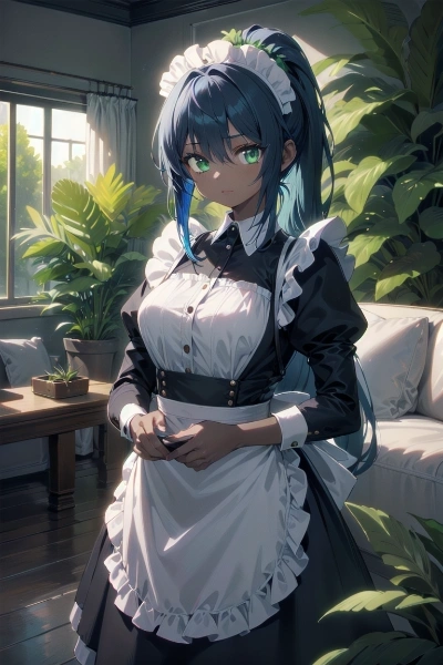 観葉植物と青ポニテメイドちゃん