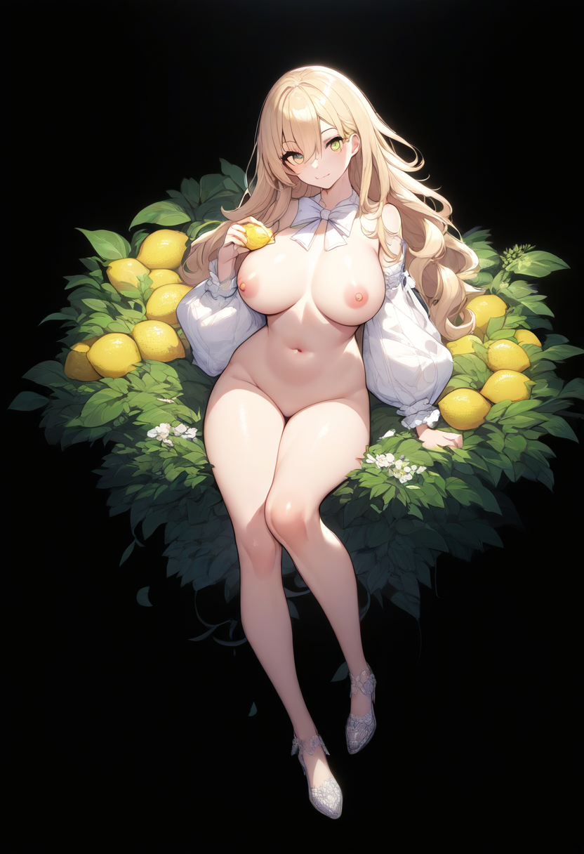 prompt: , {masterpiece, best quality, illustration,,{beautiful detailed girl},beautiful detailed glow, (smile),navel,{beautiful detailed eyes},expressionless,{lemon,holding lemon,garden},nsfw,nipples,azure hair,disheveled hair,long bangs, navel,hairs between eyes,black ribbon,white bowties,midriff,,big forhead,blank stare,flower,large top sleeves,huge breasts,(completely nude:1.5)(smile),,whitelegwear,highheels,blondehear,longhear,(slender),((thin legs)), {⭐}, absurdres blue, ai-generated,, best quality, amazing quality, very aesthetic, absurdres, best quality, amazing quality, very aesthetic, absurdres, best quality, amazing quality, very aesthetic, absurdres
