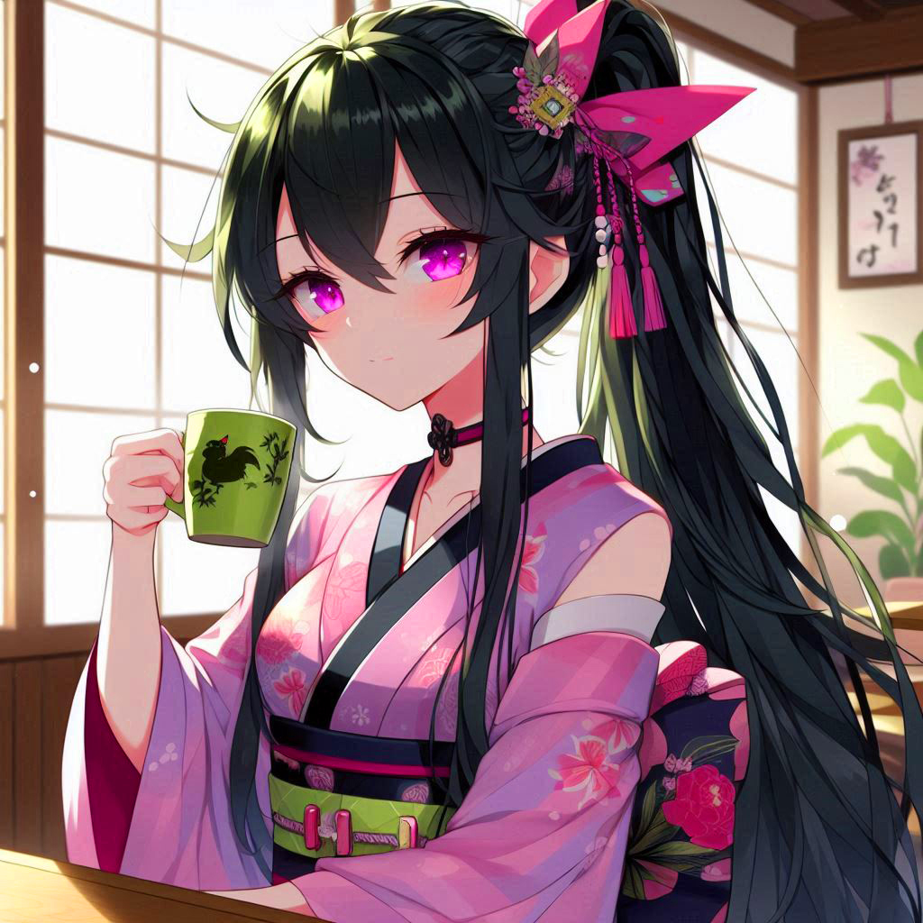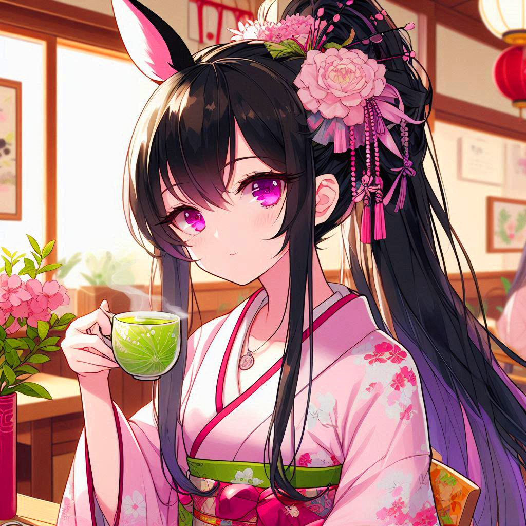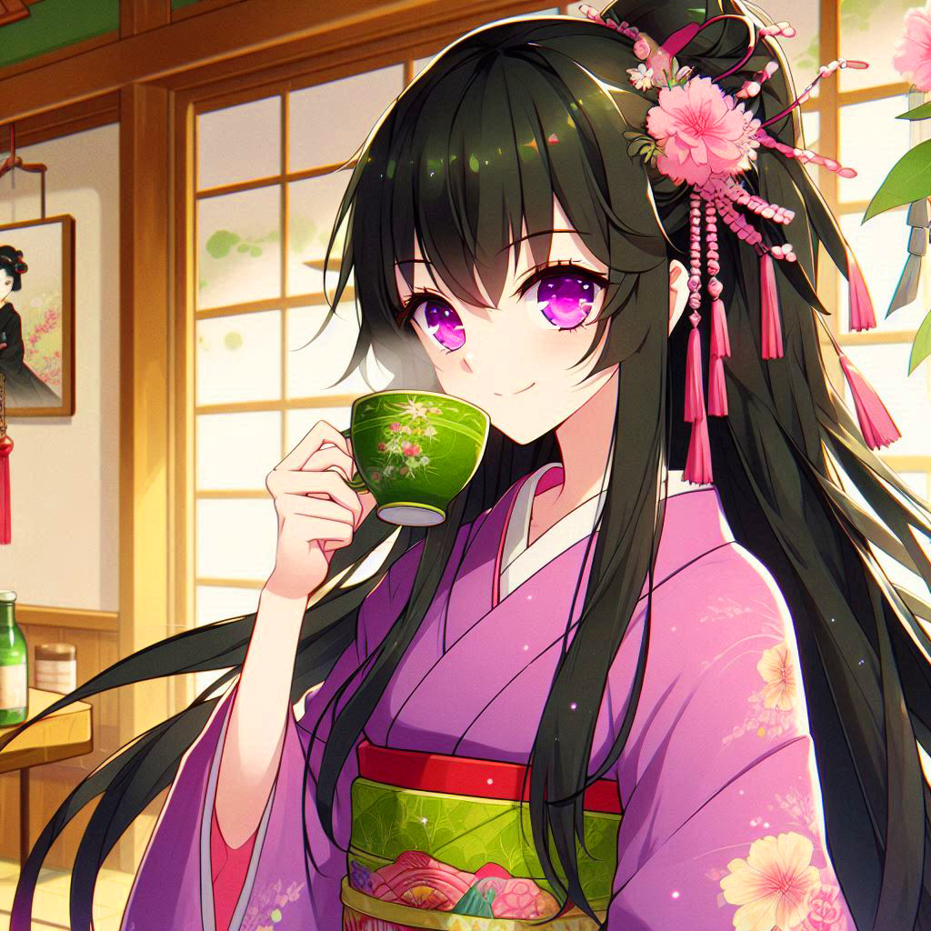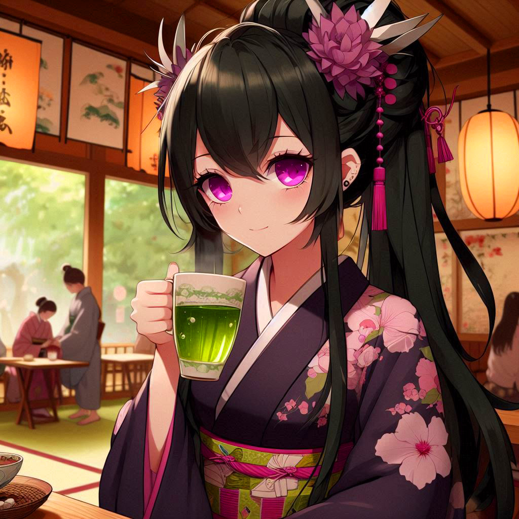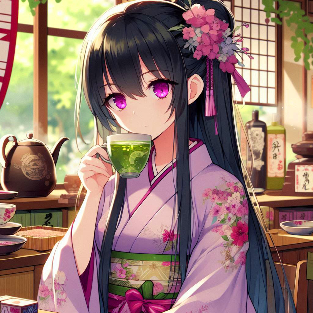 Black-haired ponytail girl drinking green tea *(8 photos)