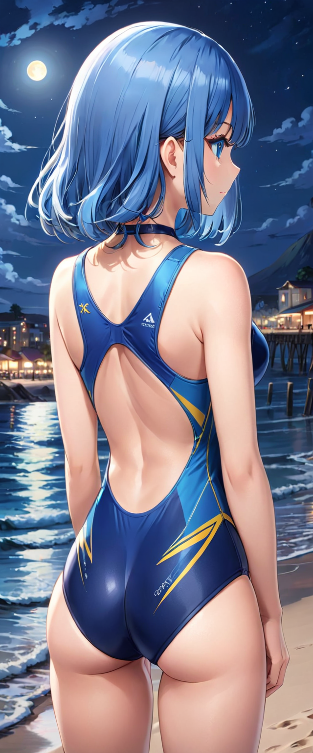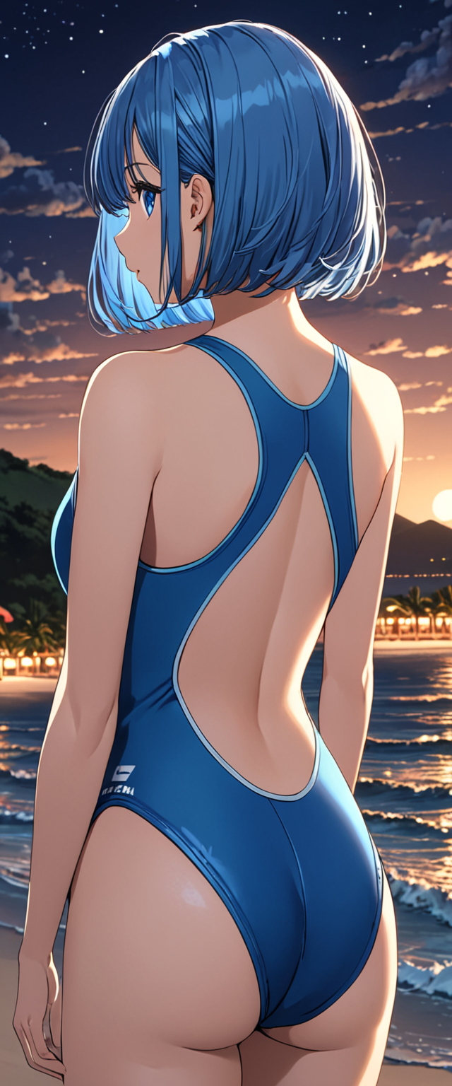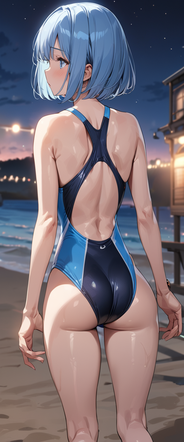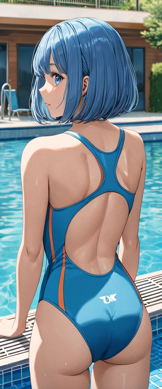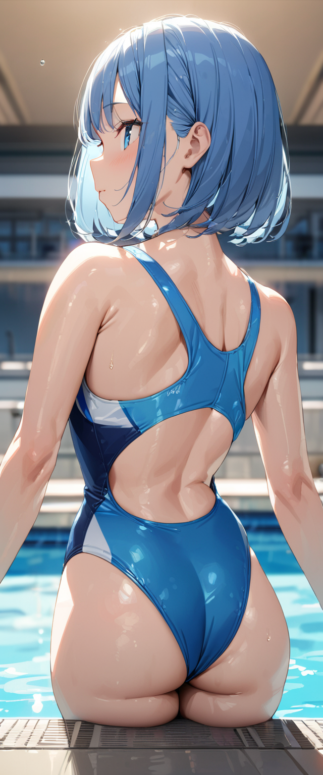 青髪さんの競泳水着後ろ姿