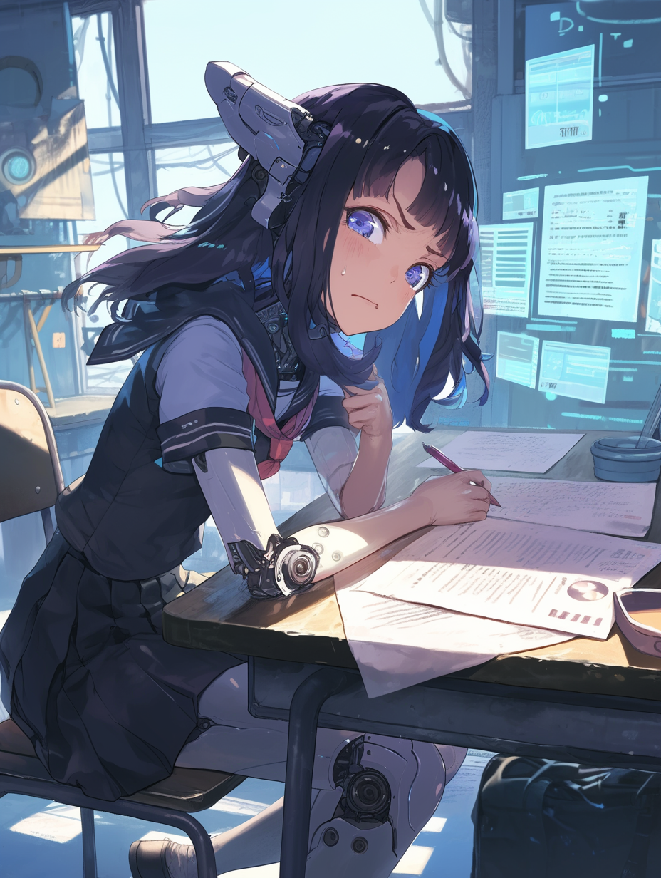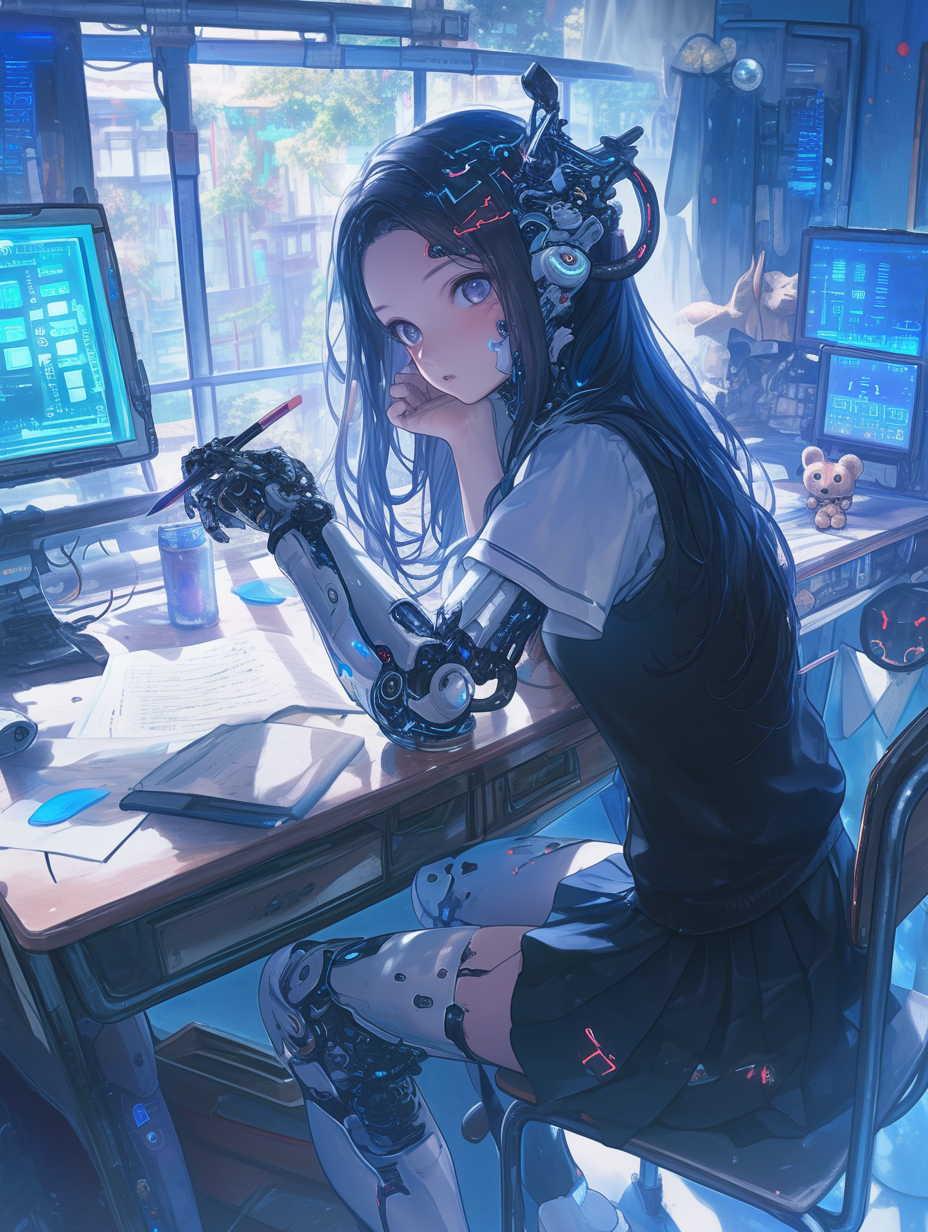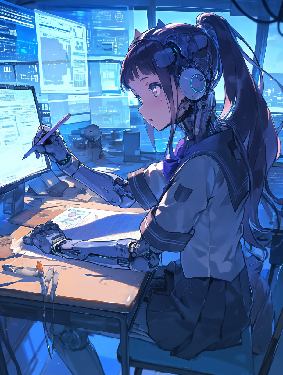 Cyborg girl studying for exams