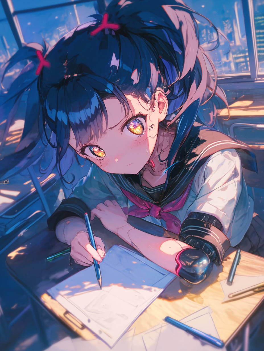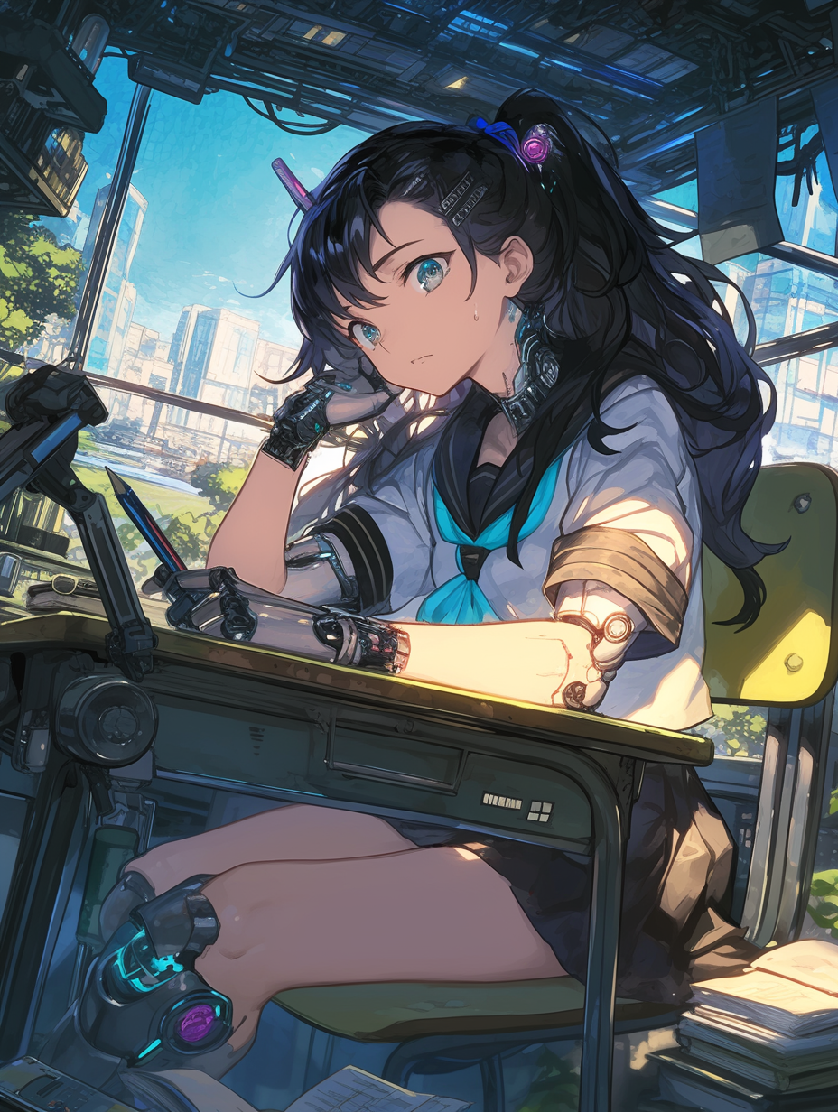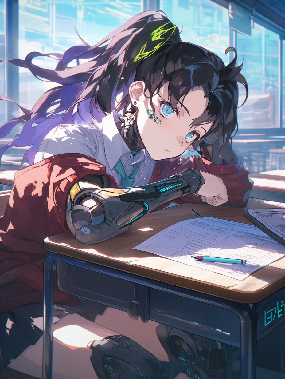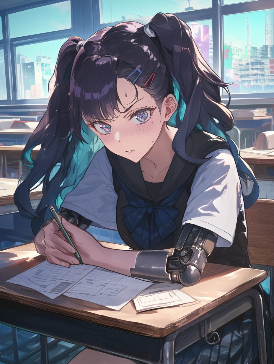 Cyborg girl studying for exams