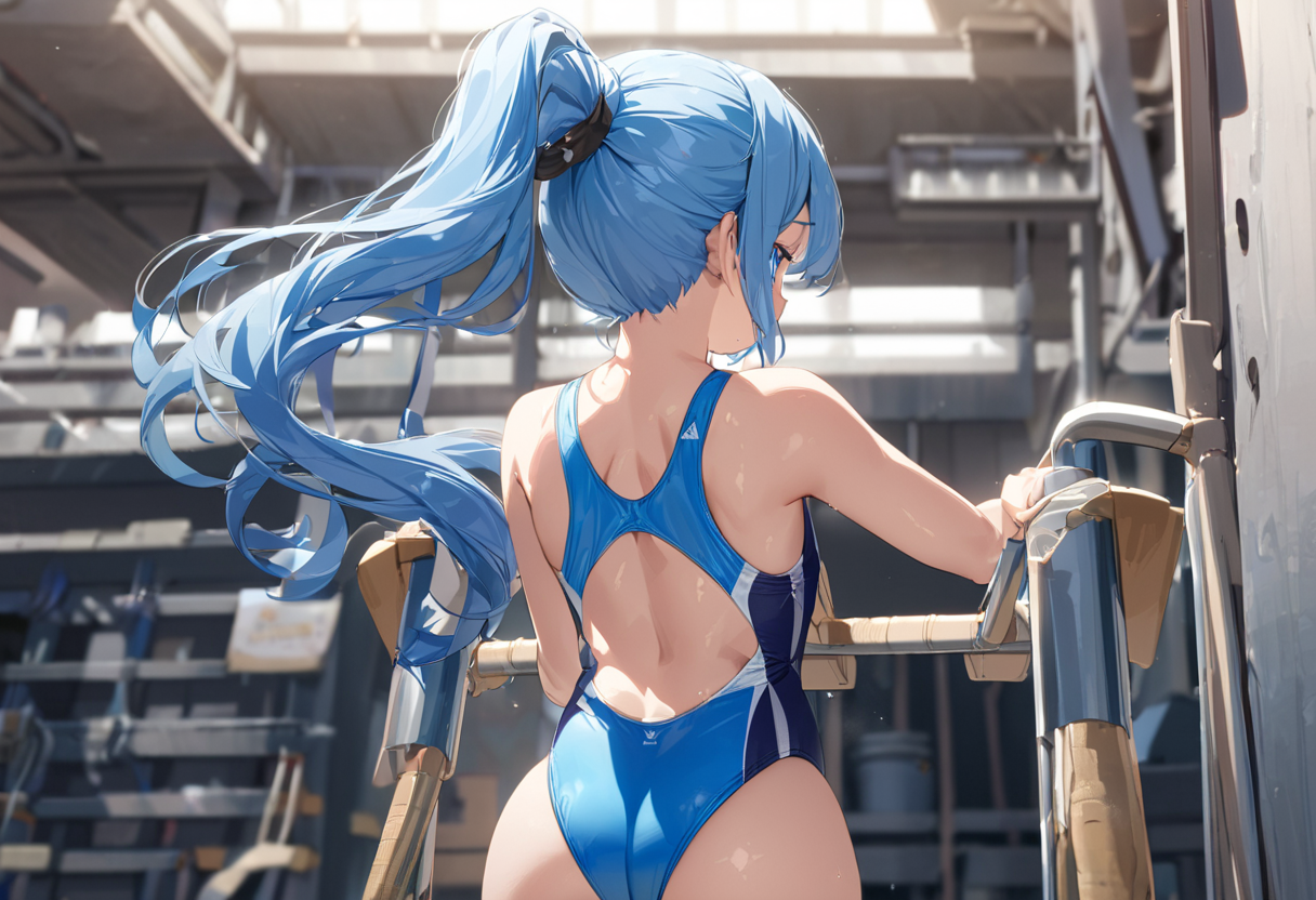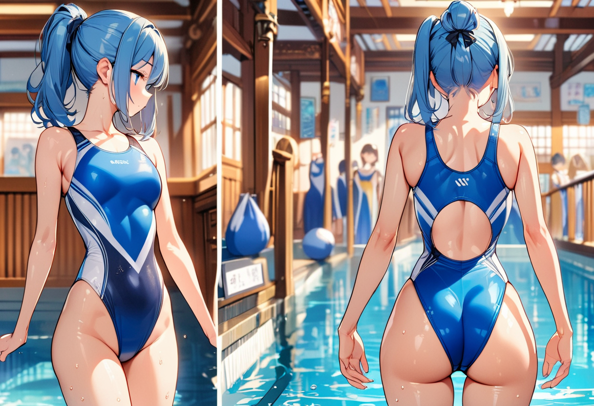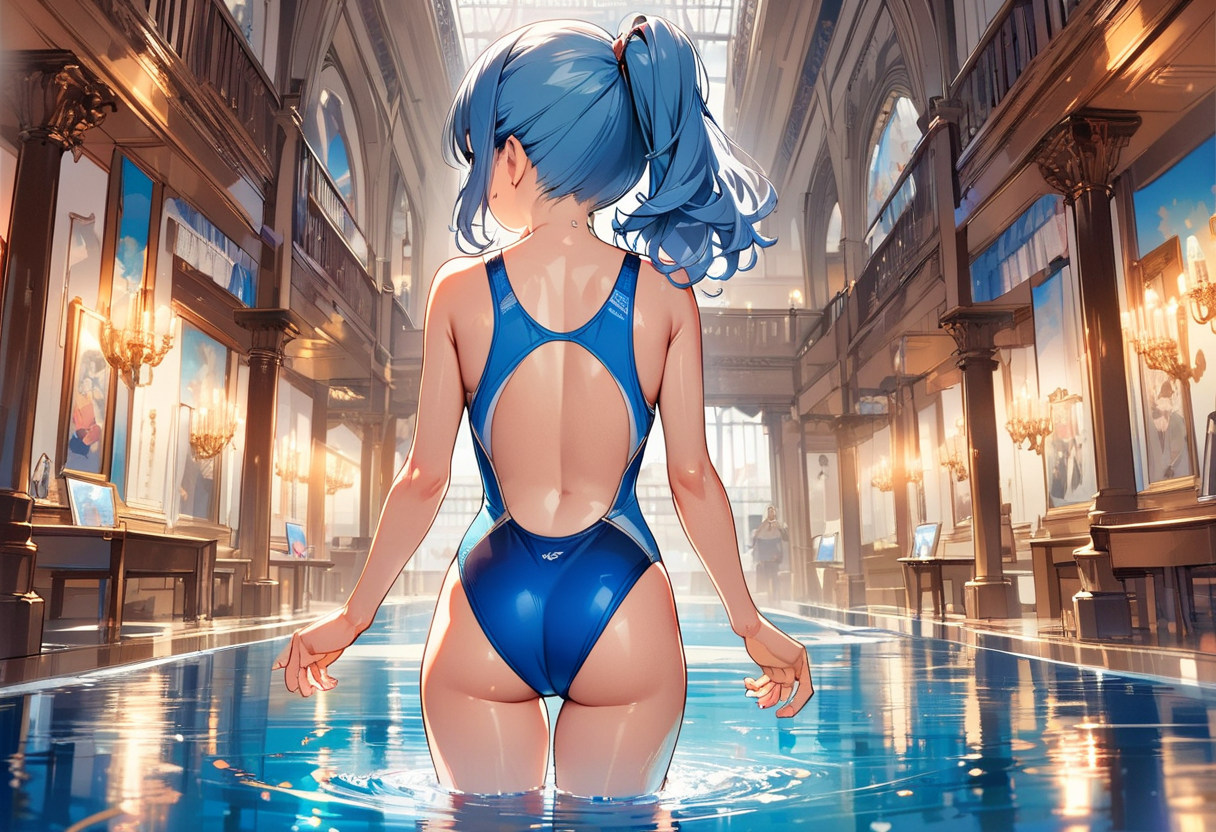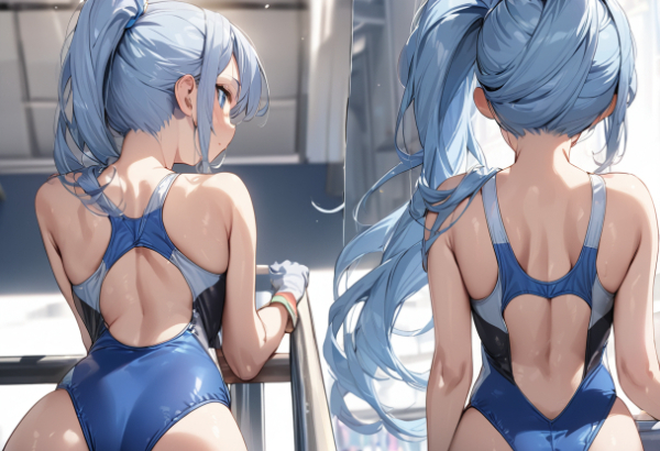 競泳水着と後ろ姿の青髪さん