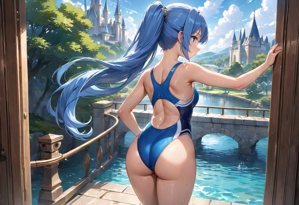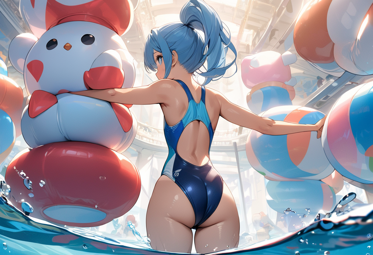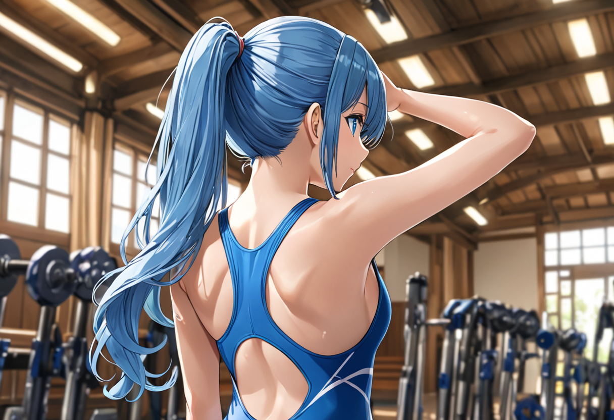競泳水着と後ろ姿の青髪さん