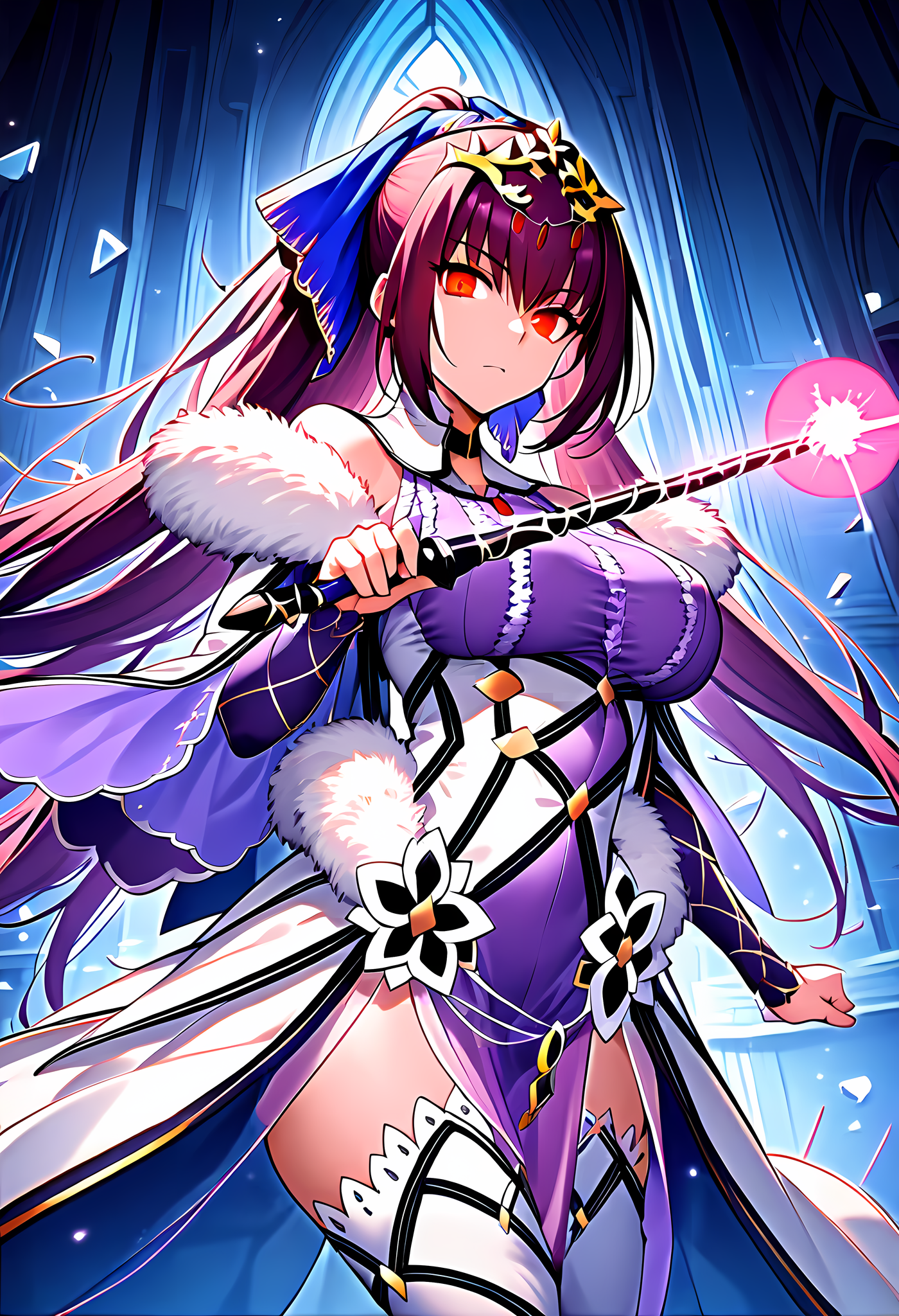 prompt: {{{{amazing quality}}}},{{{{{{very aesthetic}}}}}},year 2023,{{{{{{scathach skadi (third ascension) (fate)}}}}}}},fate/grand order,cute,animation,ai-generated,closed mouth,holding magic wand,{{cool}},magic spell,spell,{{purple magic circle}},{{{white tights}}},{{{Purple Lightning}}},{{{broken glass}}},{{{emphasis lines}}},{{{{Purple magic attack}}},heaven,cathedral,resurrection,expressionless,nsfw,{{{{glowing eyes}}}},fighting stance,,Dynamic lights,{Beautiful Backgrounds},{{{beautiful}}},{realistic},{{{{8K}}}},{photorealistic},best quality, amazing quality,very aesthetic,absurdres, best quality, amazing quality, very aesthetic, absurdres