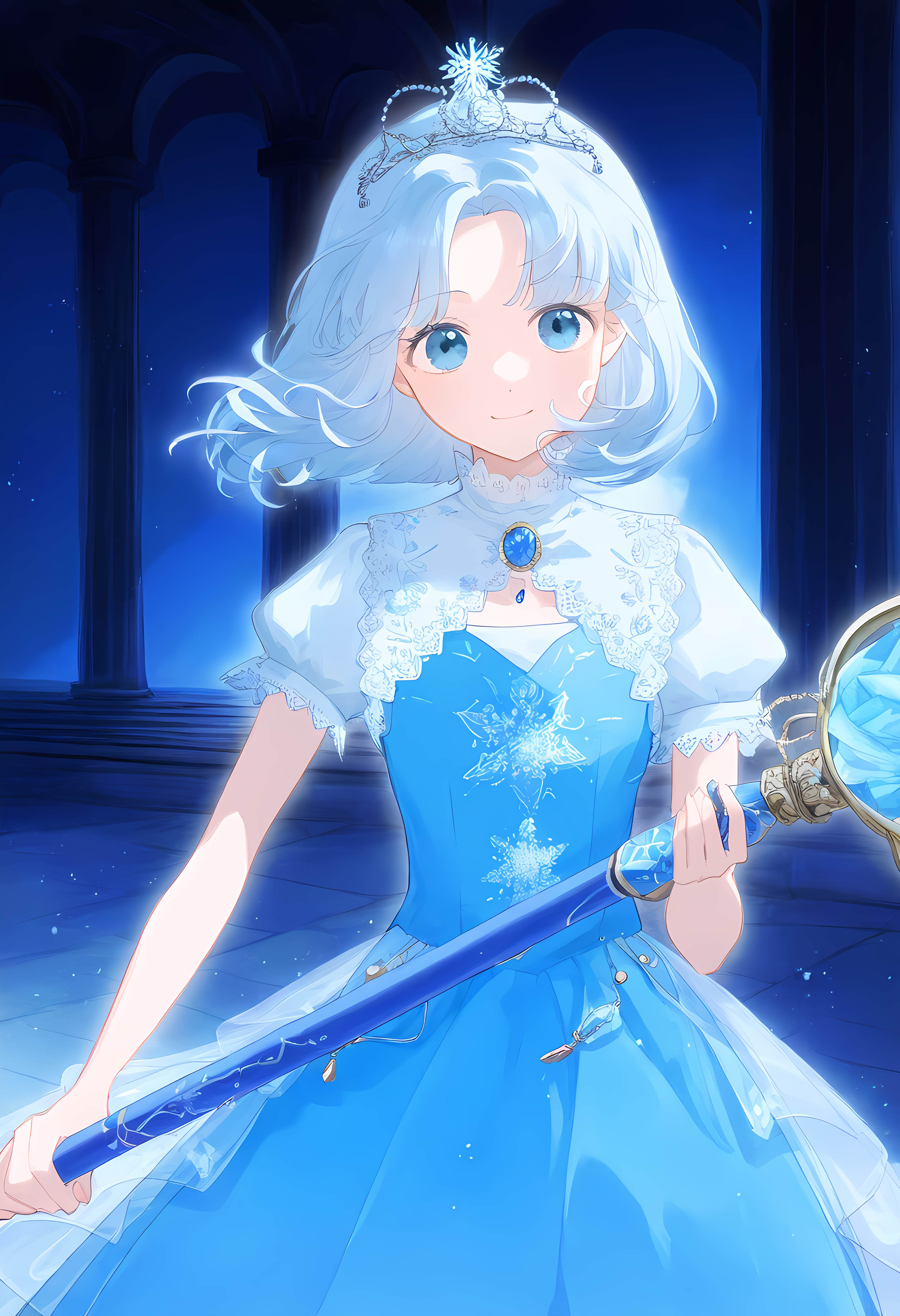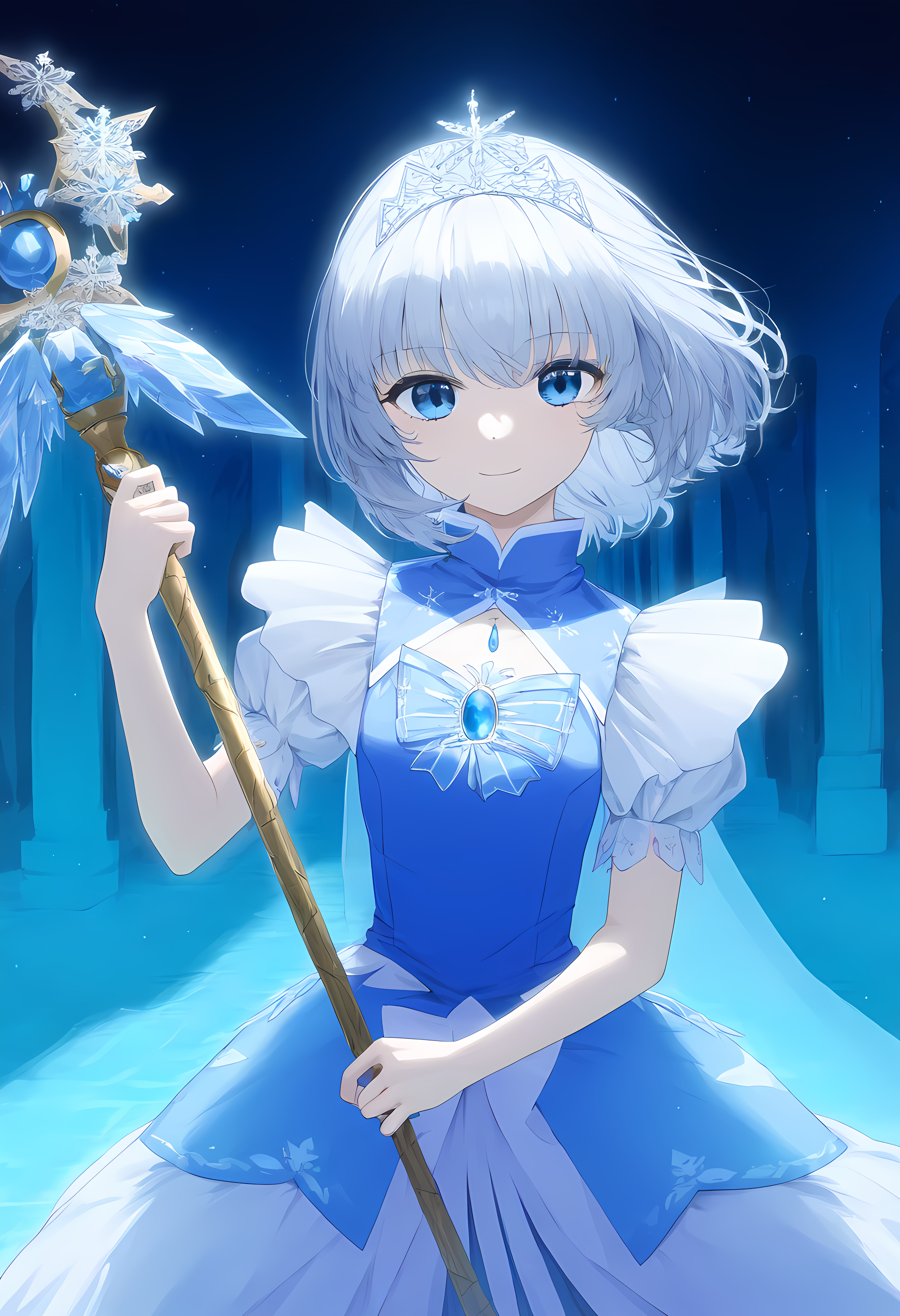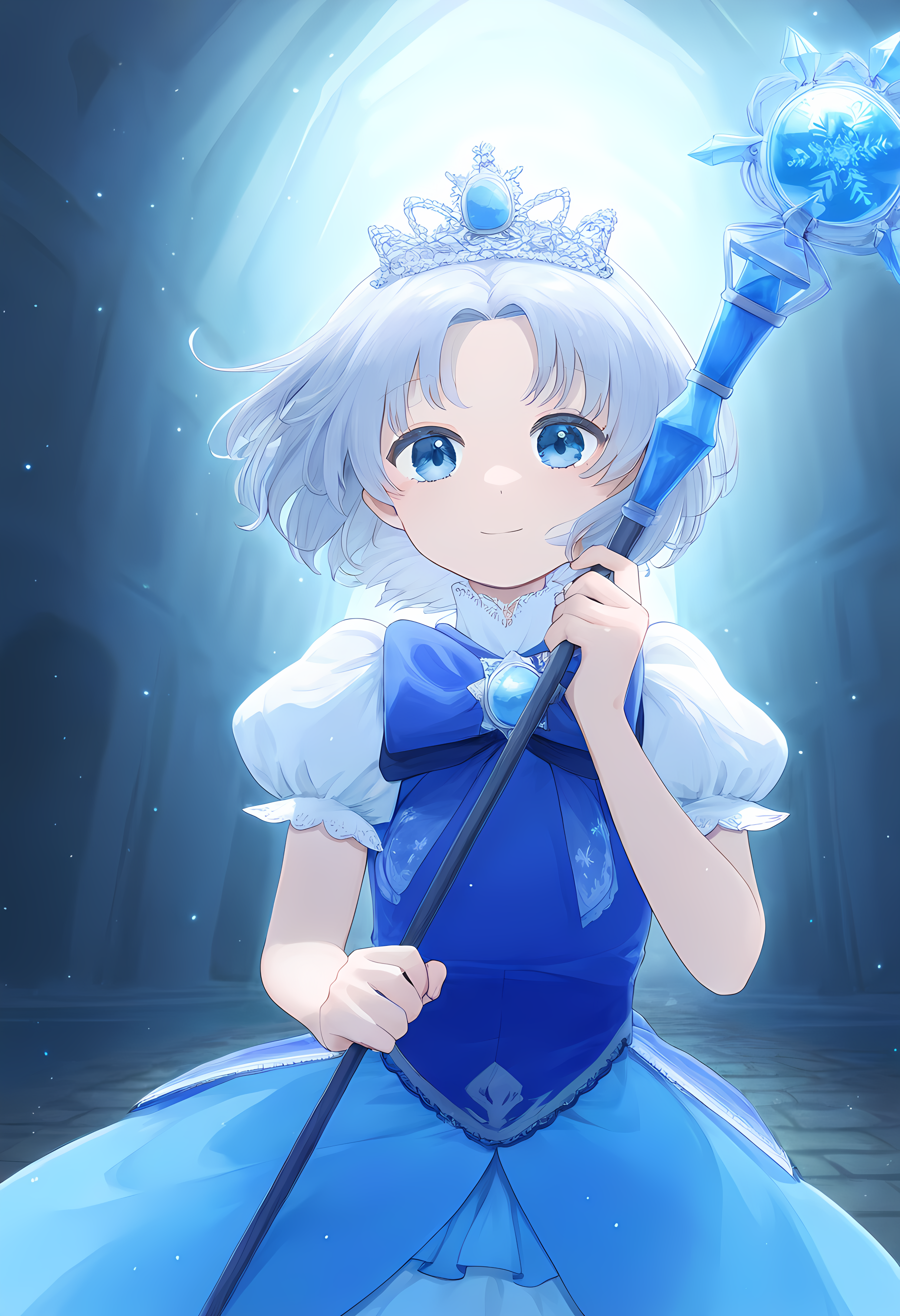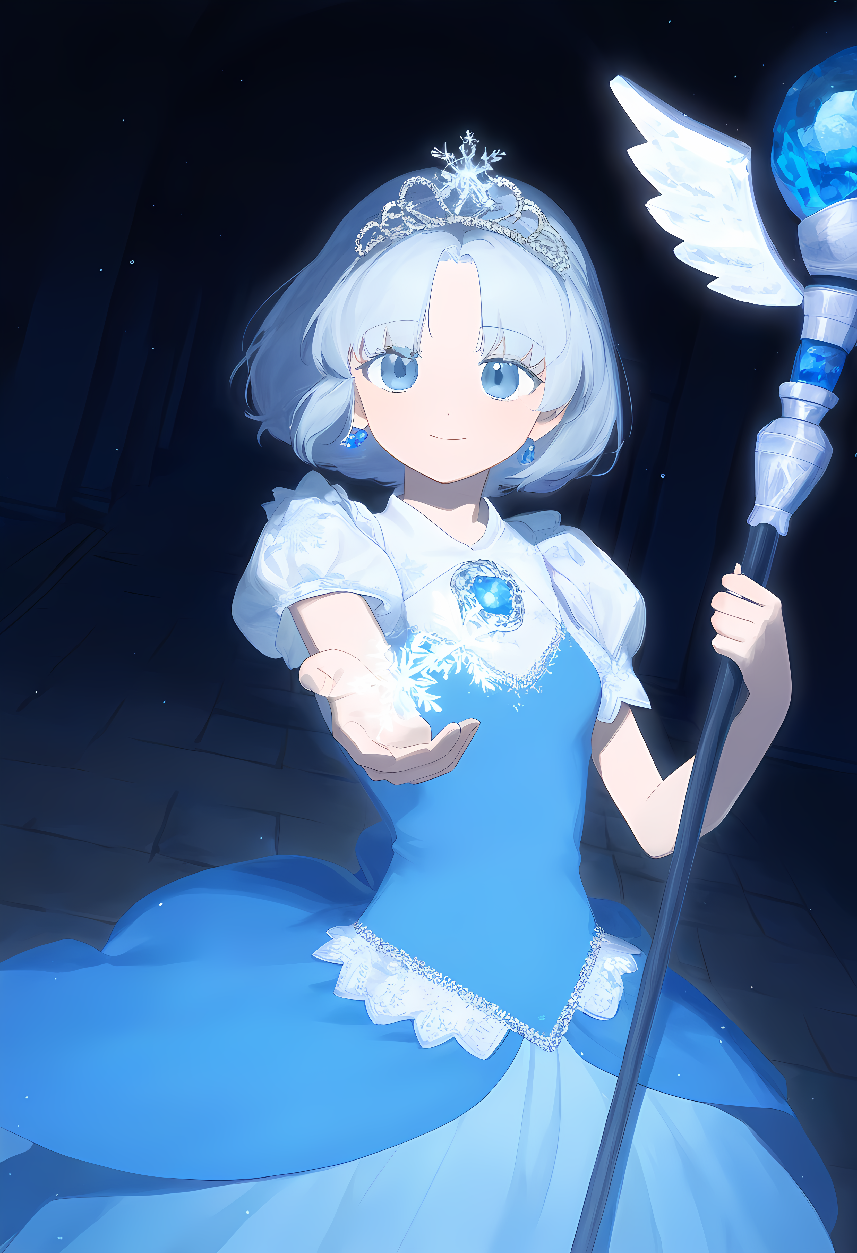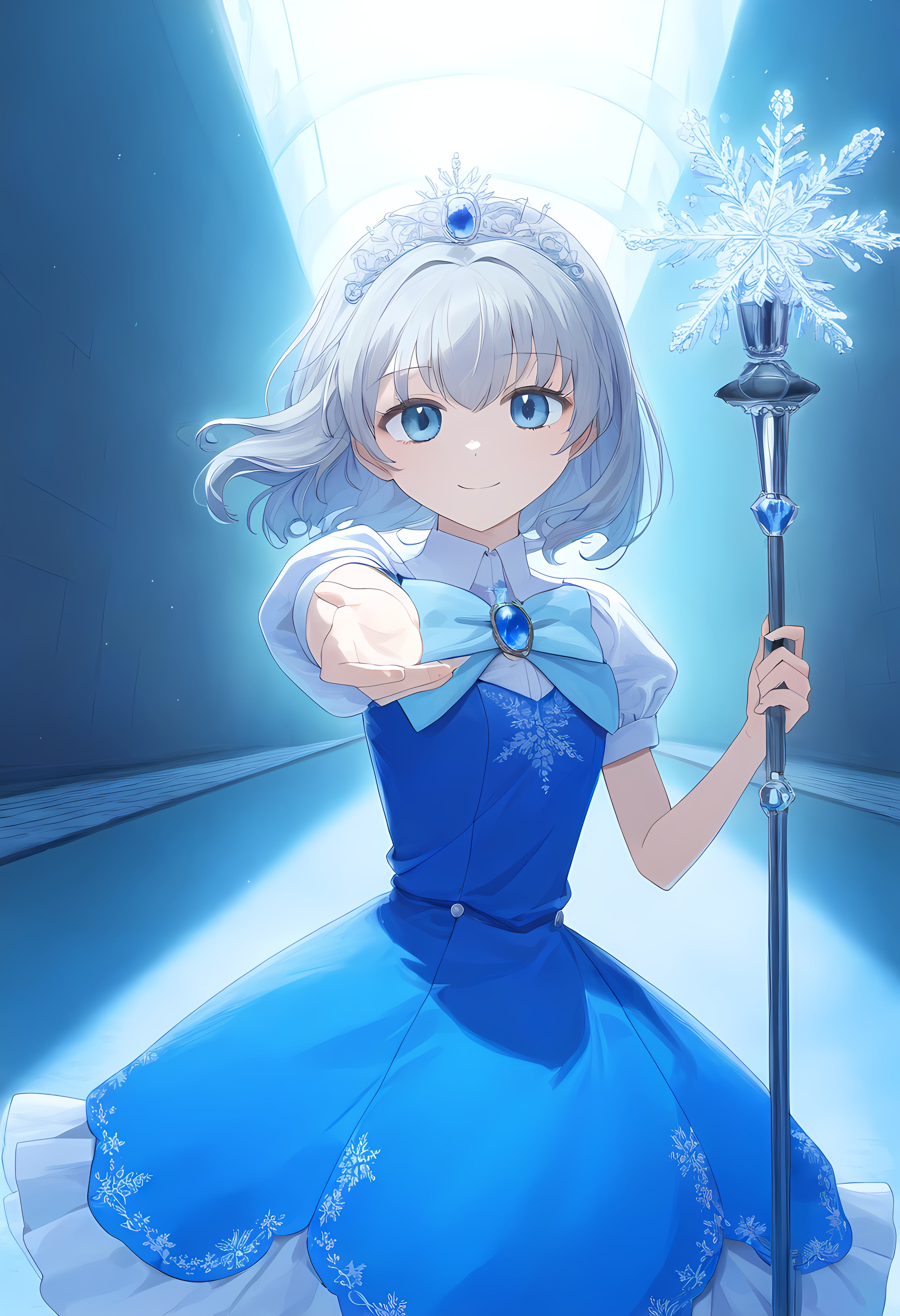 prompt: 1girl, straight-on, {hand focus,}, cowboy shot, {{{lihgt smile, gentle smile}}}, aiming at viewer, light smile, the little sturdy magical girl, slender, littel toned body, short hair, inward curl hair, floating hair, clear silver hair, floating hair, clear eyes, cute eyes, light blue eyes, indigo dress, embroidery, snowflake embroidery, {{{short sleeves, white sleeves}}}, blue jewel on chest, shor skirt, holding staff, miracle staff, large staff, large blue jewel on top of the staff, princess tiara, shining magical aura from the top of the staff, brave, cool, cute, kawaii, shader, autoluminous, backlighting, dark underground walkway, anime, dynamic angle, {{grisaille, glazing, hatching}}, best quality, , best quality, amazing quality, very aesthetic, absurdres
