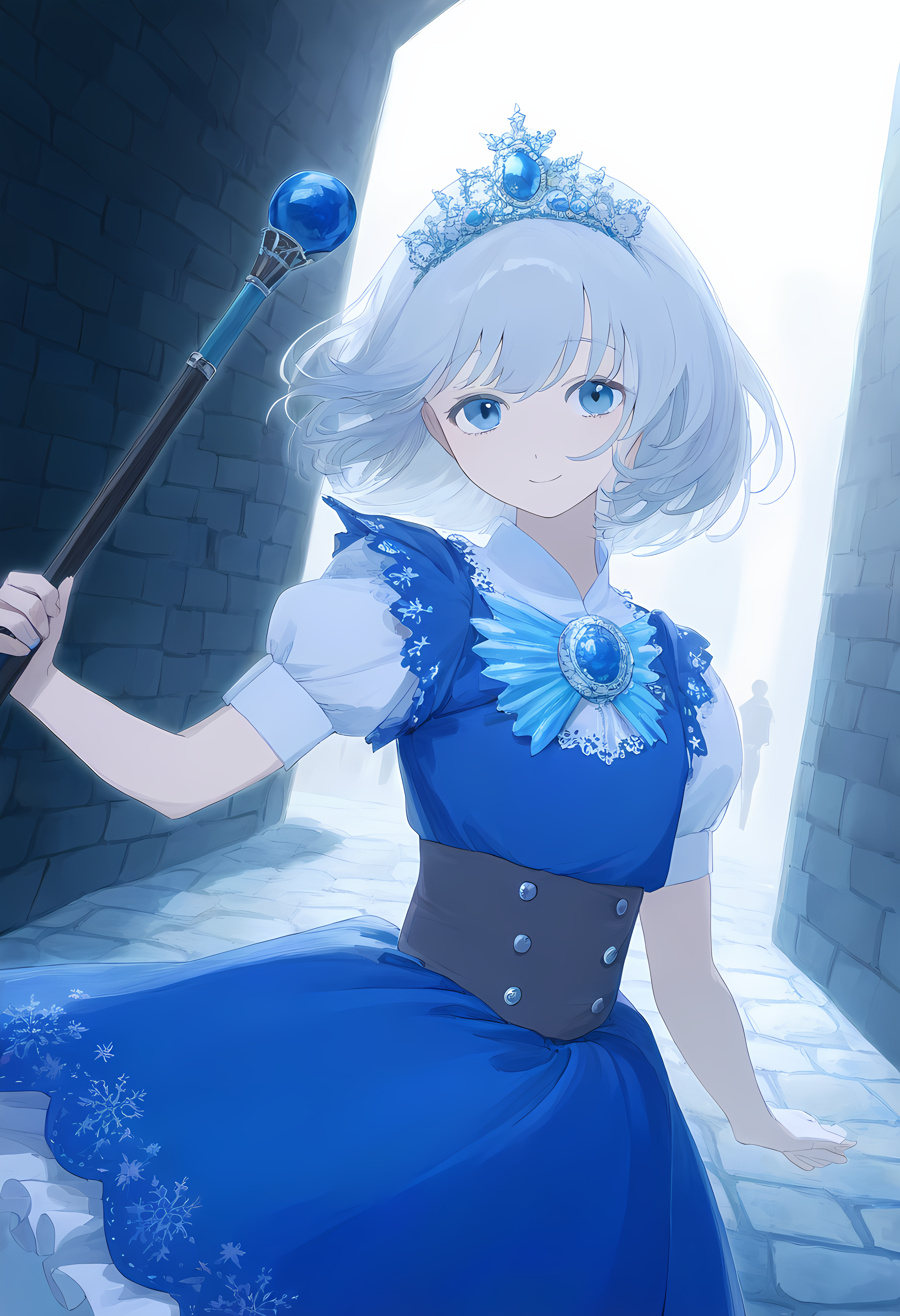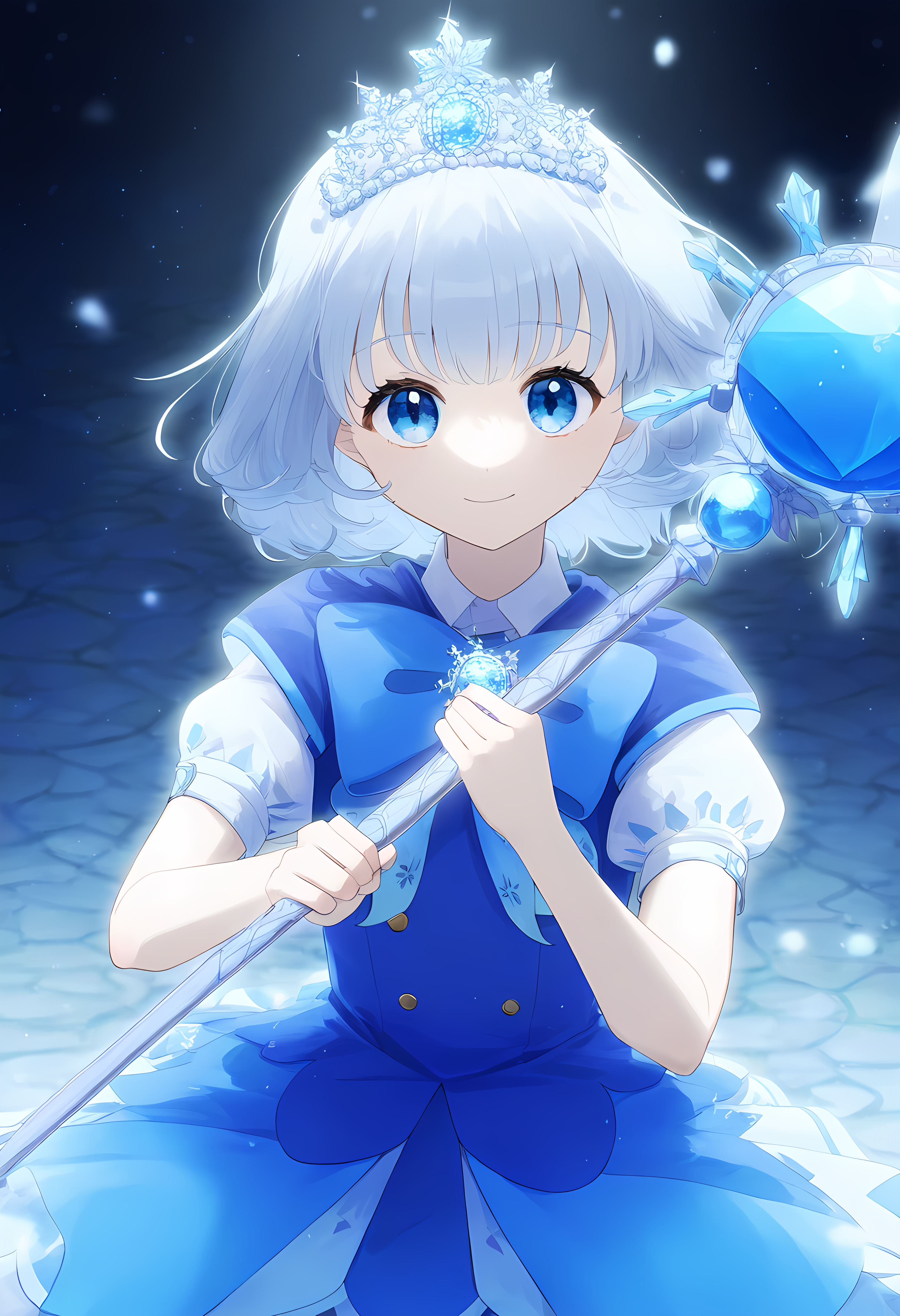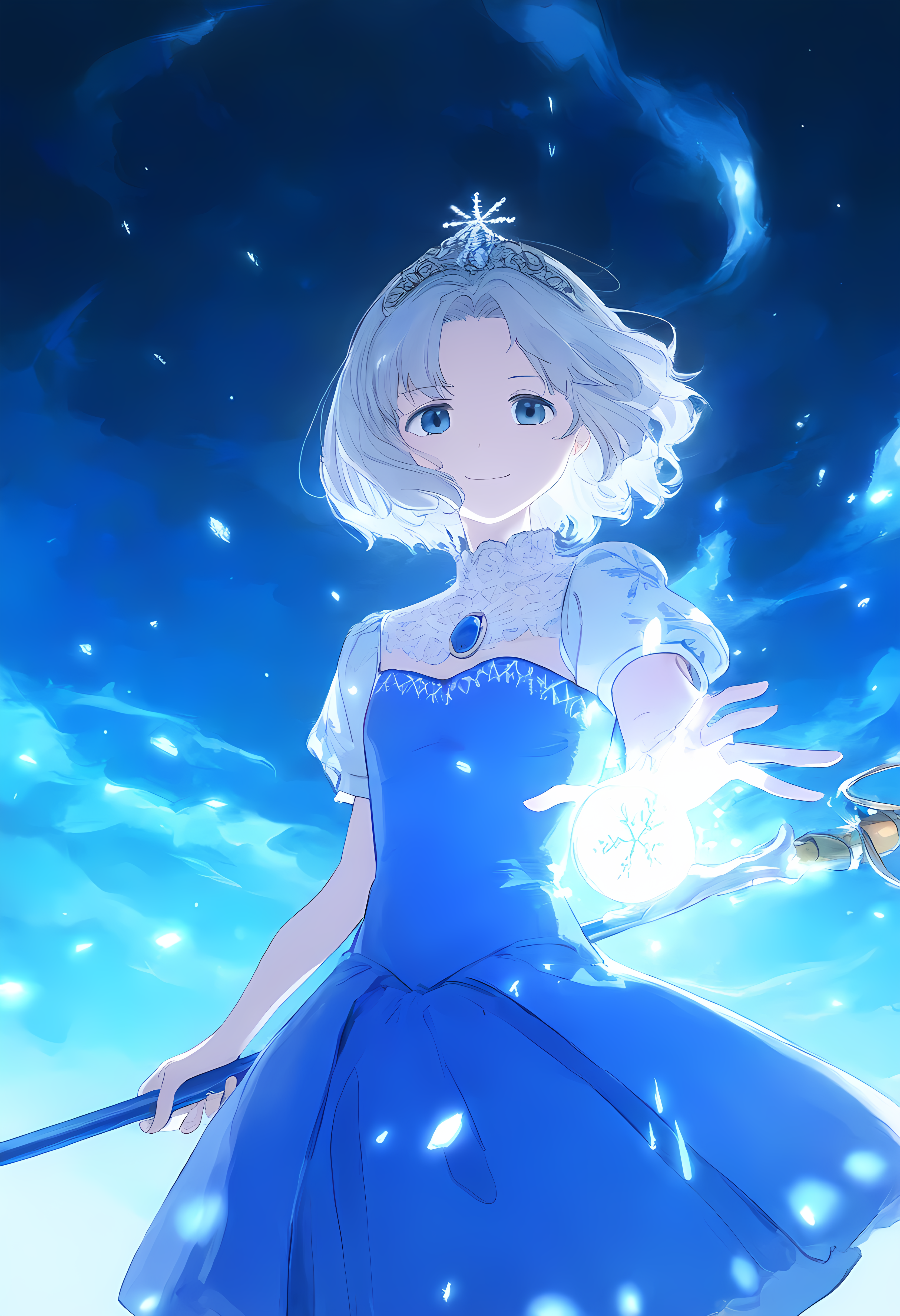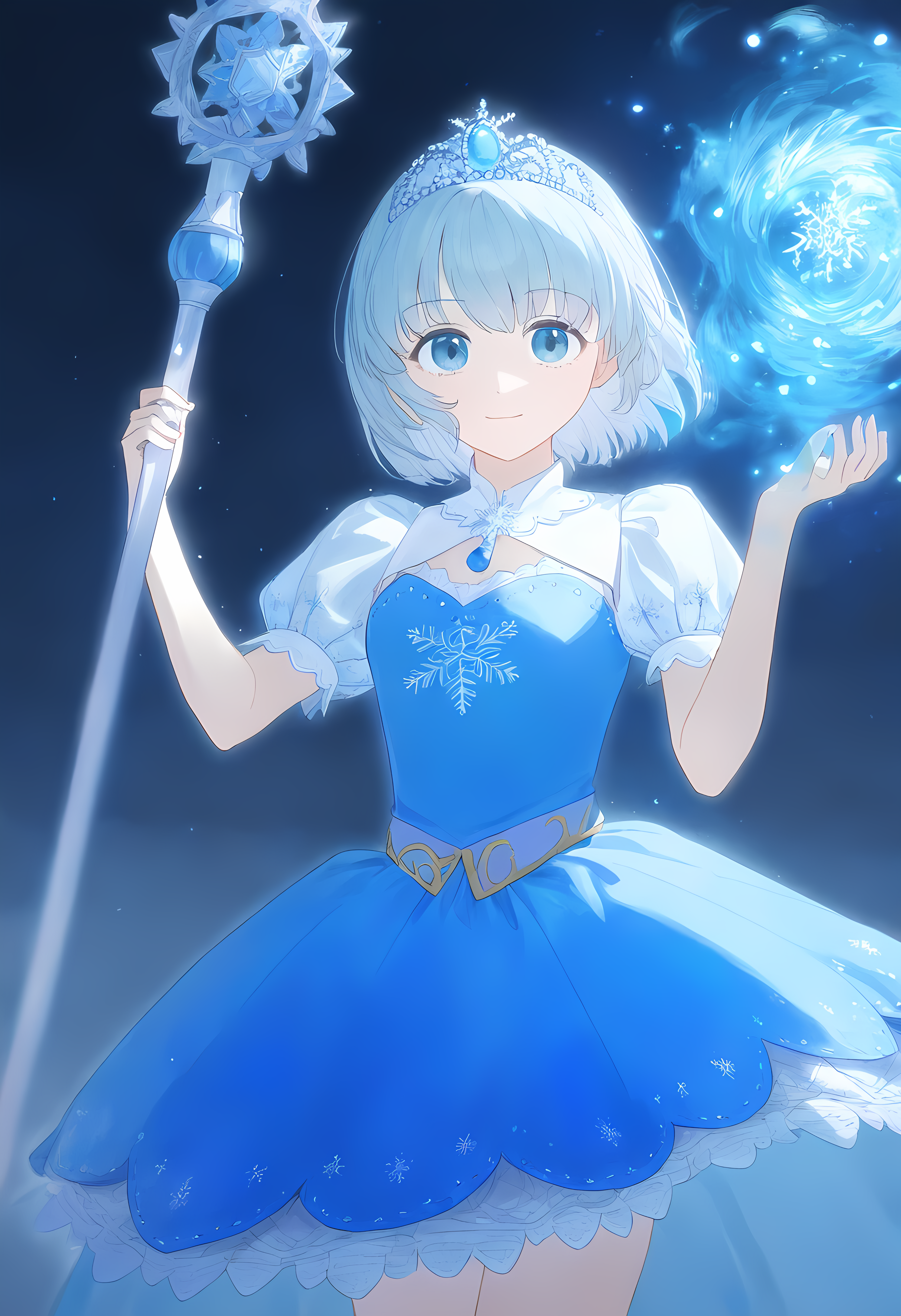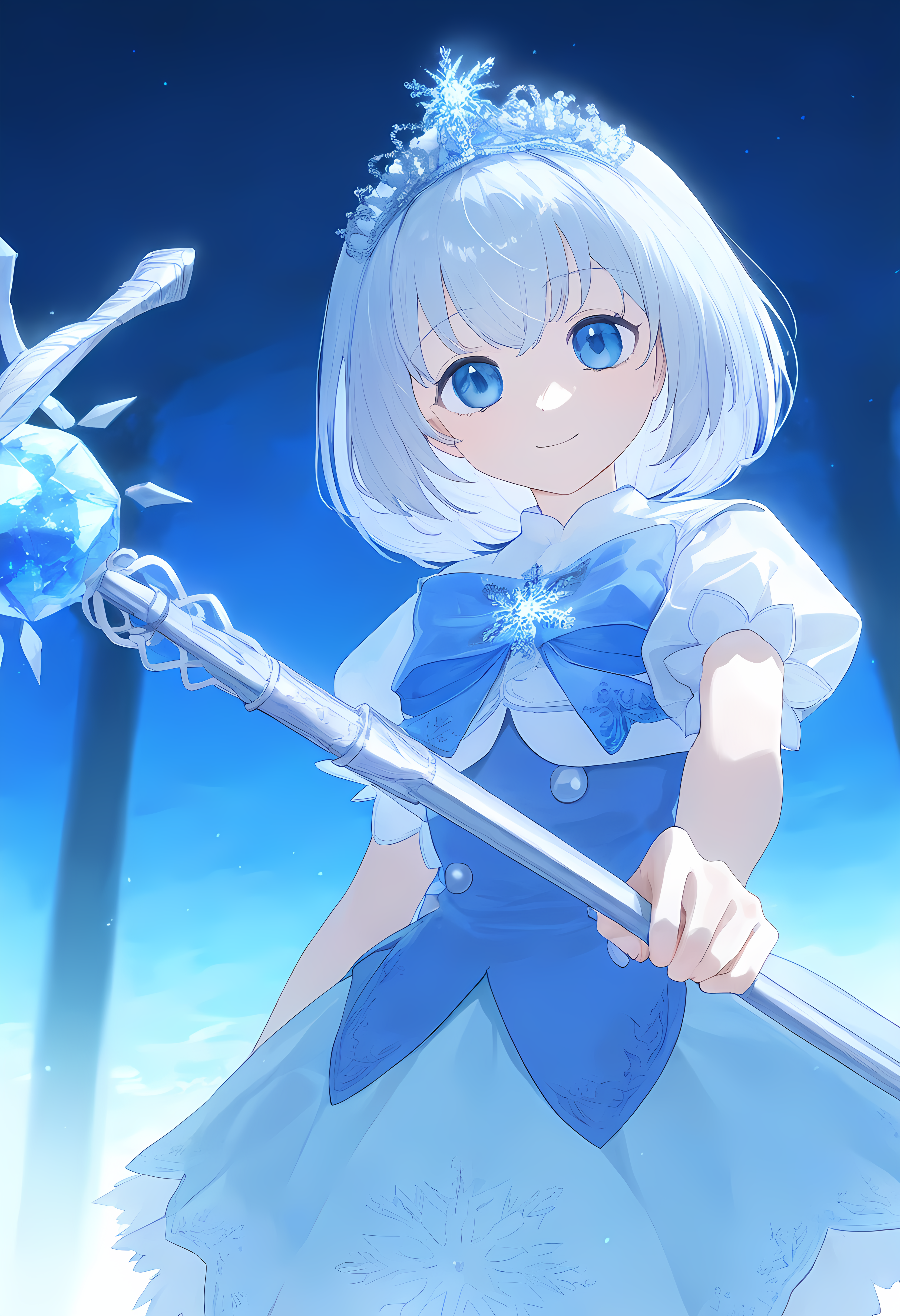 prompt: 1girl, straight-on, {hand focus,}, cowboy shot, {{{lihgt smile, gentle smile}}}, aiming at viewer, light smile, the little sturdy magical girl, slender, littel toned body, short hair, inward curl hair, floating hair, clear silver hair, floating hair, clear eyes, cute eyes, light blue eyes, indigo dress, embroidery, snowflake embroidery, {{{short sleeves, white sleeves}}}, blue jewel on chest, shor skirt, holding staff, miracle staff, large staff, large blue jewel on top of the staff, princess tiara, shining magical aura from the top of the staff, brave, cool, cute, kawaii, shader, autoluminous, backlighting, dark underground walkway, anime, dynamic angle, {{grisaille, glazing, hatching}}, best quality, , best quality, amazing quality, very aesthetic, absurdres
