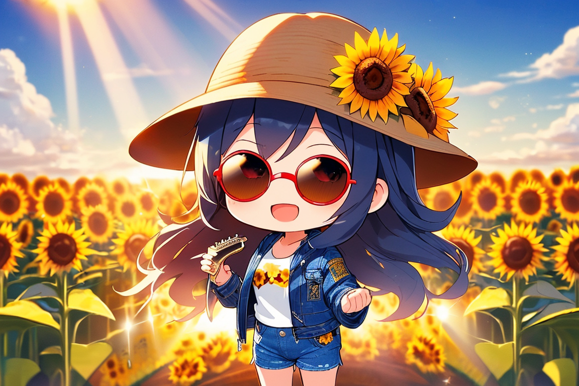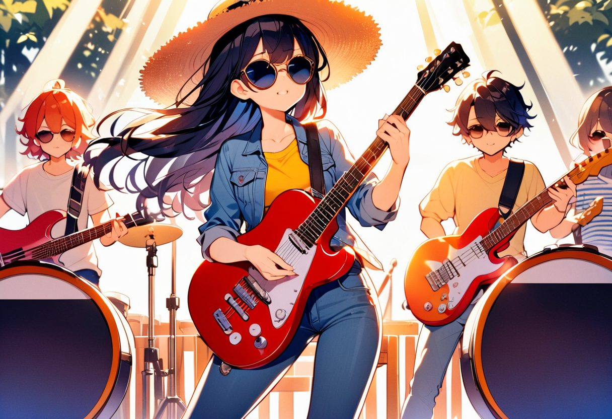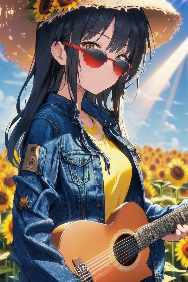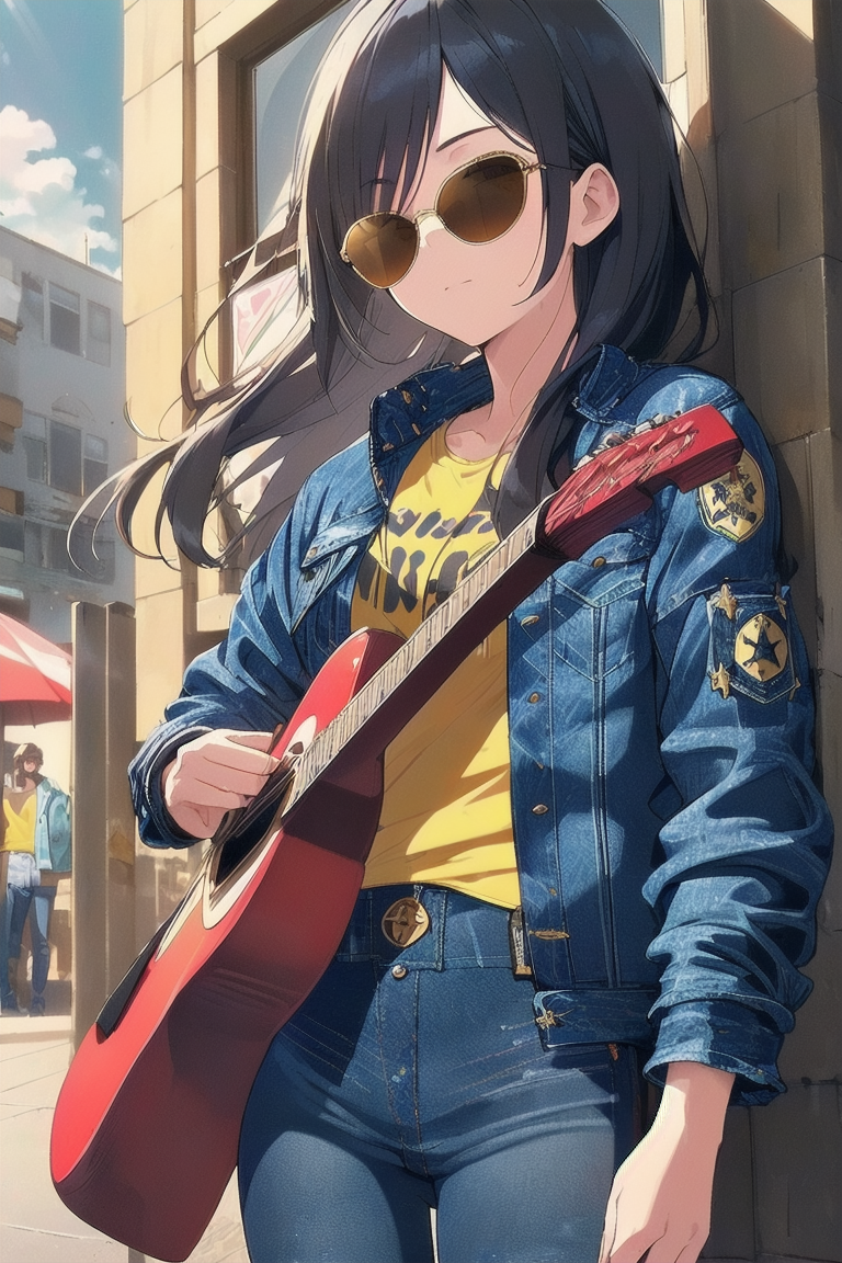 parameters: Masterpiece, top quality, very detailed, animated style illustration, (sun shine), Rooftop of a building, upper body, upper body focus, 1girl, cute girl, solo, beautiful black hair, long hair, slim, slender, medium breast, (black Sunglasses:1.4), (Eyes hidden by sunglasses:1.1), (Reflected light on the surface of the sunglasses:1.3), (Indigo denim jacket:1.6), (Yellow T-shirt:1.3), standing, (playing a red folk guitar:1.5), outdoor, (Lonely expression:1.2), (Two police officers in the background:1.1).