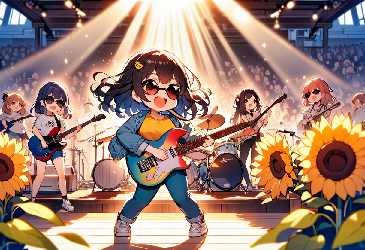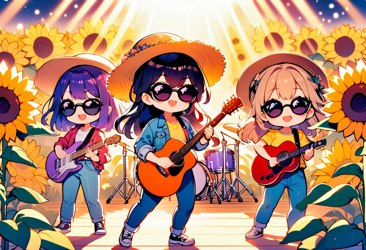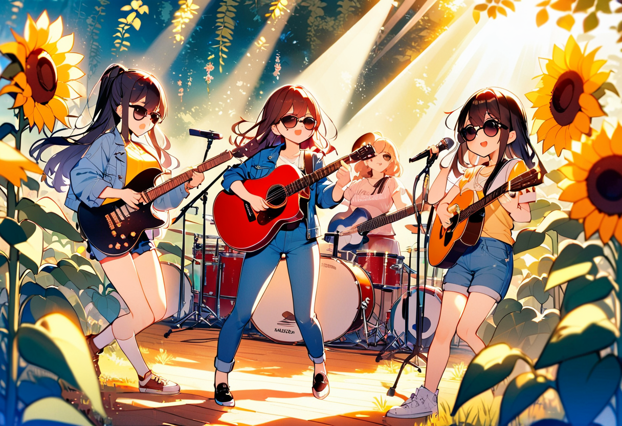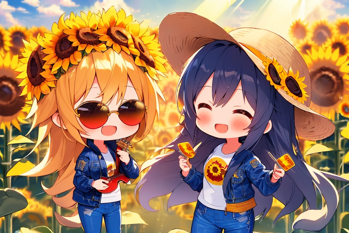 parameters: Masterpiece, top quality, very detailed, animated style illustration, (sun shine), Rooftop of a building, upper body, upper body focus, 1girl, cute girl, solo, beautiful black hair, long hair, slim, slender, medium breast, (black Sunglasses:1.4), (Eyes hidden by sunglasses:1.1), (Reflected light on the surface of the sunglasses:1.3), (Indigo denim jacket:1.6), (Yellow T-shirt:1.3), standing, (playing a red folk guitar:1.5), outdoor, (Lonely expression:1.2), (Two police officers in the background:1.1).