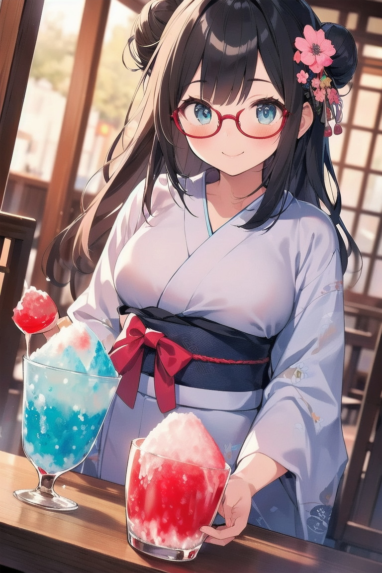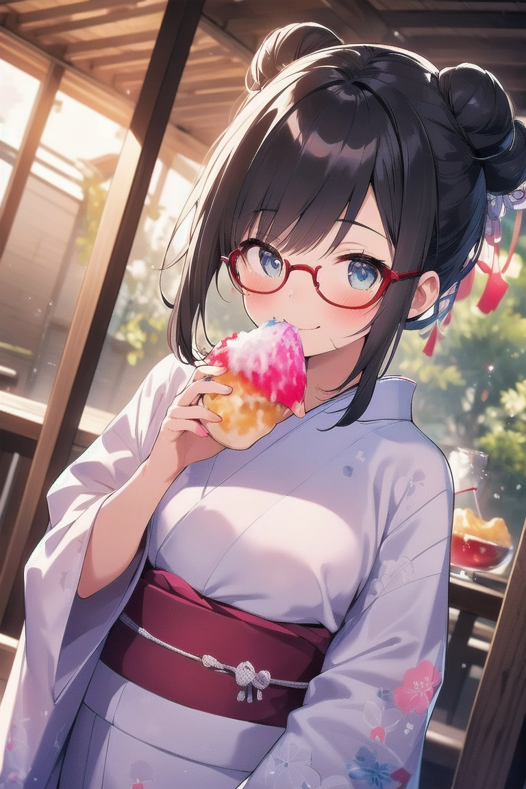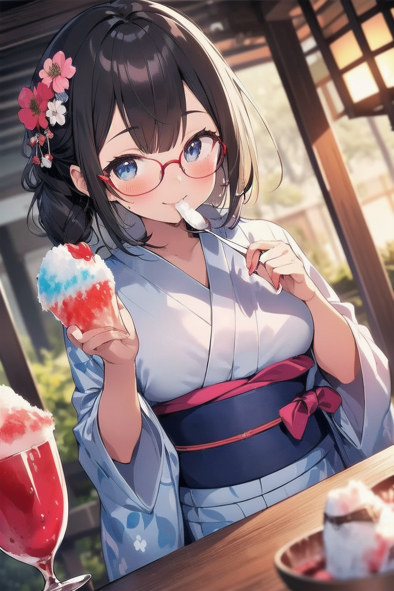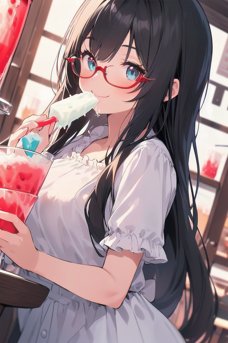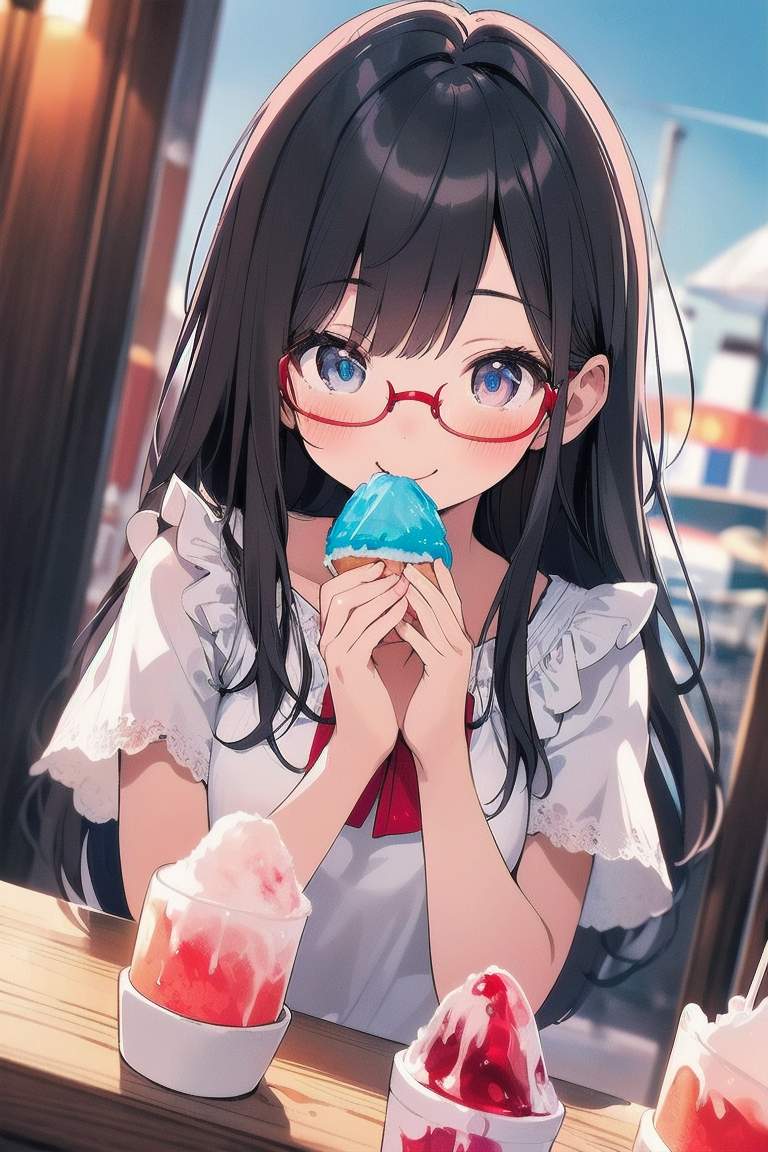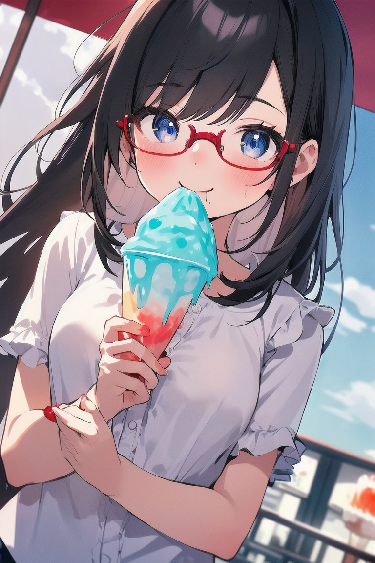 parameters: Masterpiece, top quality, very detailed, animated style illustration, 1girl, cute girl, upper body, upper body focus, (Dutch angle shot:1.2), outdoor, beautiful eyes, beautiful black hair, (long hair:1.3), slim, slender, medium breast, glasses, (white Ruffled blouse:1.3), Short sleeves, (eating a shaved ice with red syrup:1.3), (seductive smile:1.2).