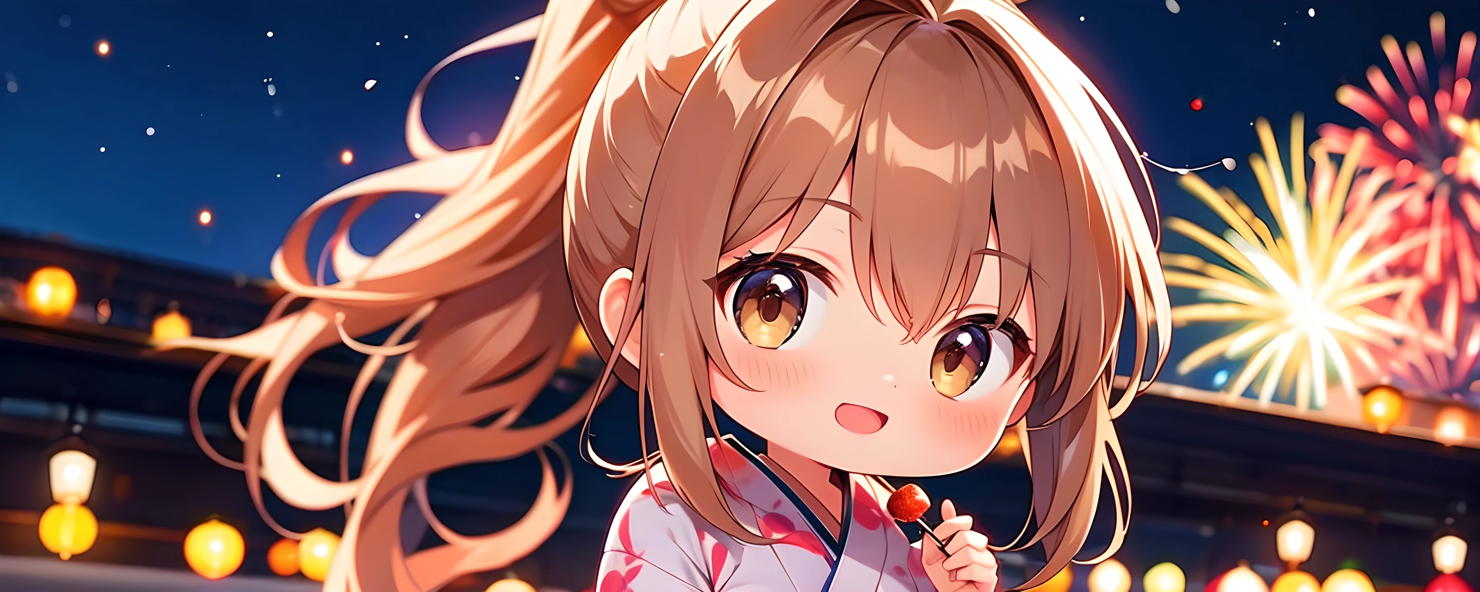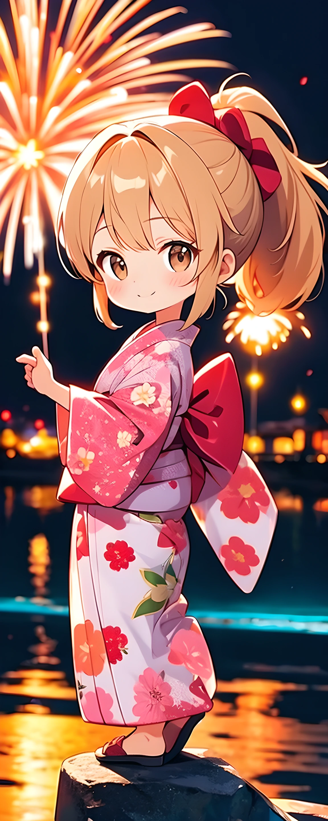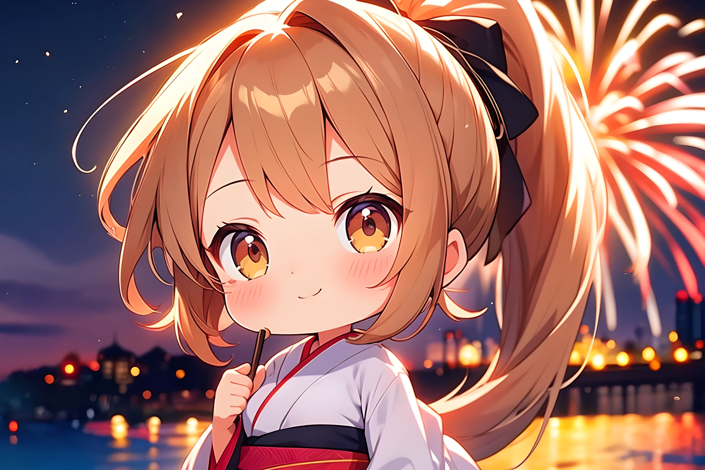 parameters: Beautiful,Masterpiece,Best Quality: 1.6,Best Aesthetic: 1.8,Photo-realistic: 1.8,Cinematic Perfect Lighting: 2,Fireworks Display: 2,Chibi girl: 1.7,Long hair: 2,Ponytail: 1.8,Shiny beige hair,hazel brown eyes: 2,Extremely detailed face: 2,Medium breasts: 1.6,Yukata: 2,Collection of poses: 1.4, <lora:Fixhands_anime_bdsqlsz_V1:1>