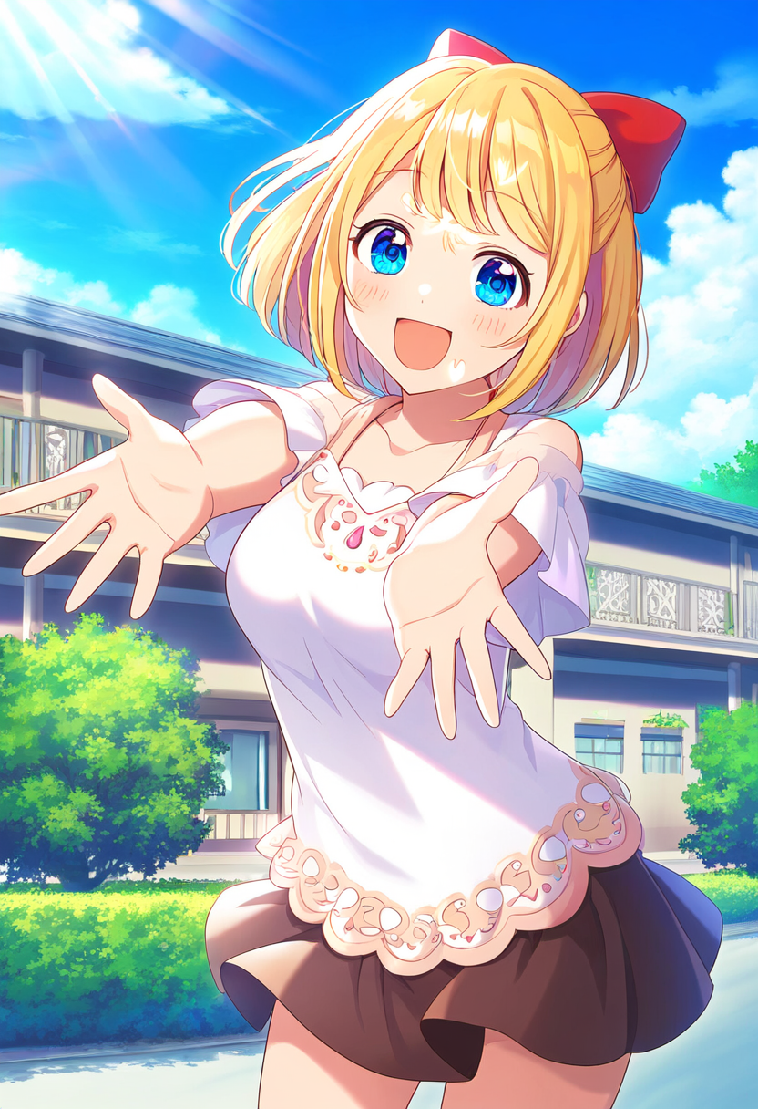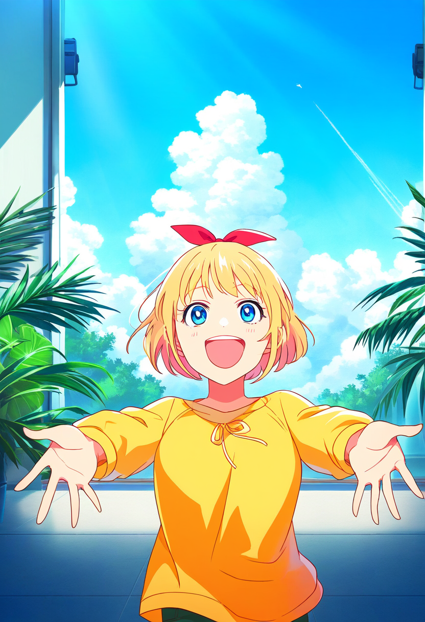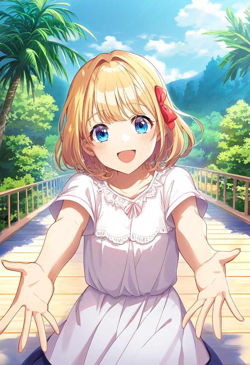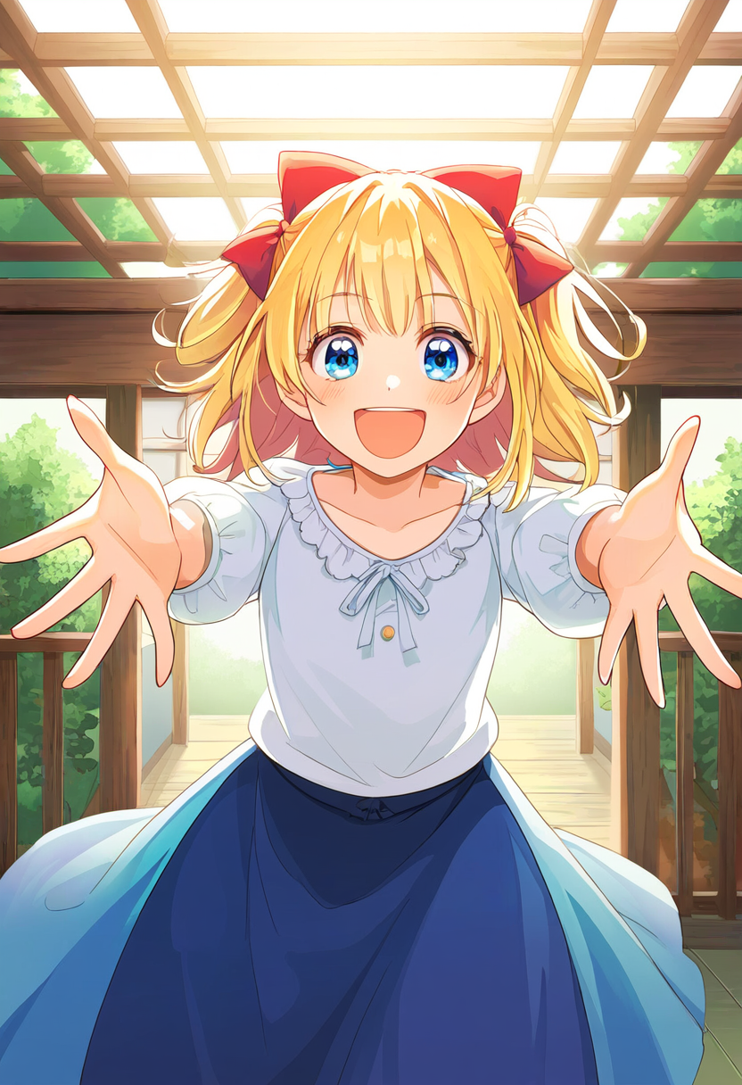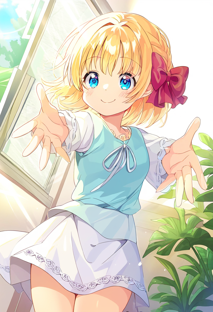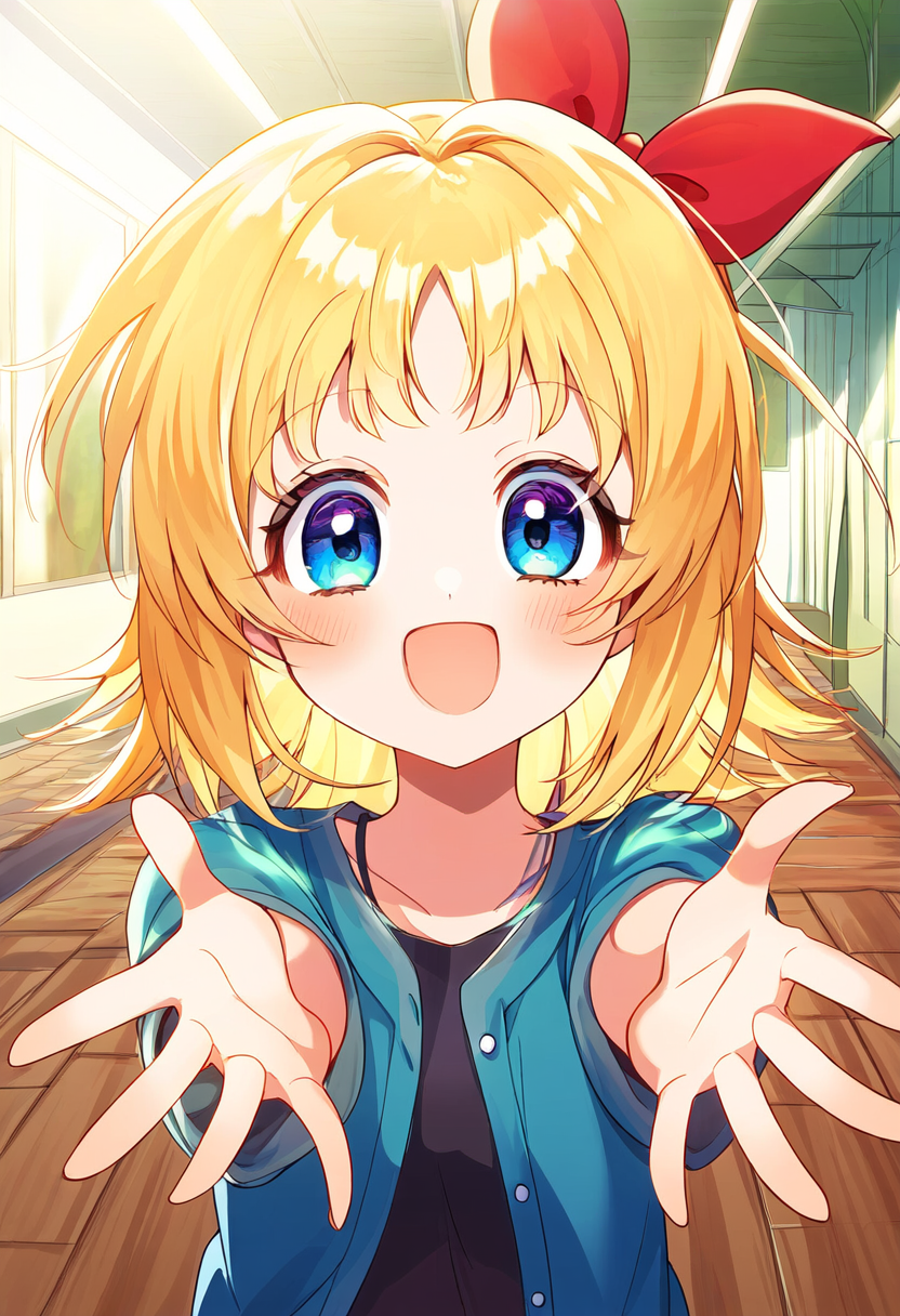 prompt: 1girl, open hands, palms facing forward, wide open arms, facing viewer, smiling, blonde hair, short hair, blue eyes, hair bow, red bow, cheerful, happy, inviting, welcoming, anime style, indoors, vibrant colors, detailed textures, clear facial expressions, joyful, casual clothing, light fabric, outdoor, natural light, sunny day, clear sky, playful, youthful, energy, lively, friendship, connection, gesture emphasized, expressive posture, masterpiece, best quality, very aesthetic, absurdres (confused expression:1.2), best quality, amazing quality, very aesthetic, absurdres