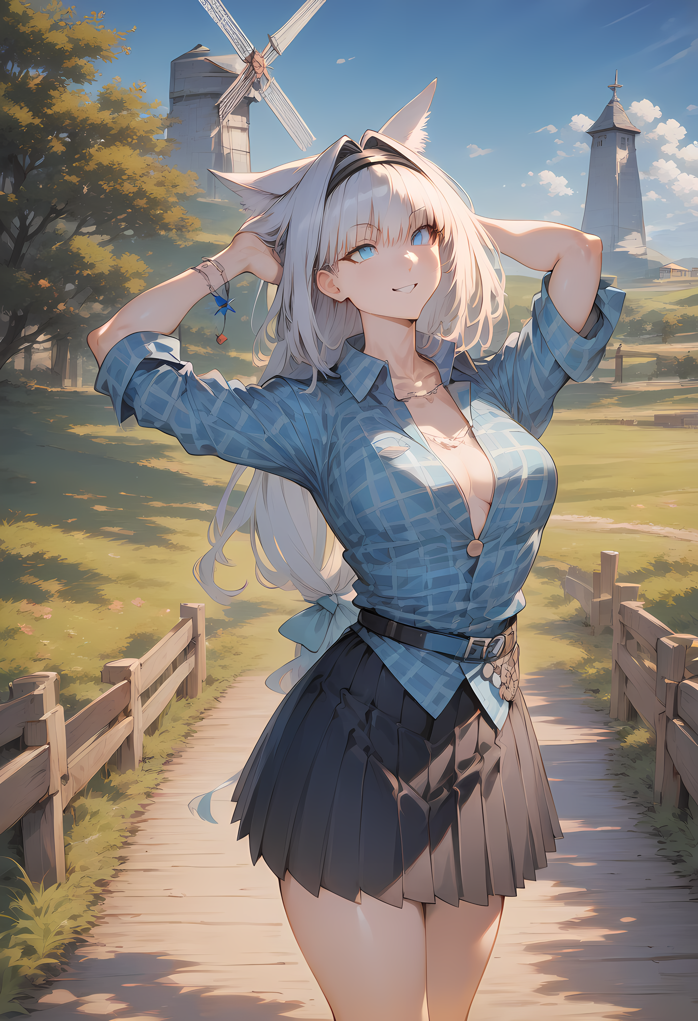 prompt: {{{{amazing quality}}}},{{{{{{very aesthetic}}}}}},year 2023,{{{{{{{{dobrynya nikitich (first ascension) (fate)}}}}}}},fate/grand order,ai-generated,Cute,animation,solo,ench suburb,windmill,{{blue flannel shirt}},black plaid,straight skirt,dominated,beautiful background,summer,rural,countryside,arch bridge ,fantastic, looking up,vacation,upright,nsfw,happy,enjoying,(fashon model)+++,smile,insanely detailed eyes,{{{beautiful}}},{realistic},{{{{8K}}}},{photorealistic},best quality, amazing quality,very aesthetic,absurdres, best quality, amazing quality, very aesthetic, absurdres