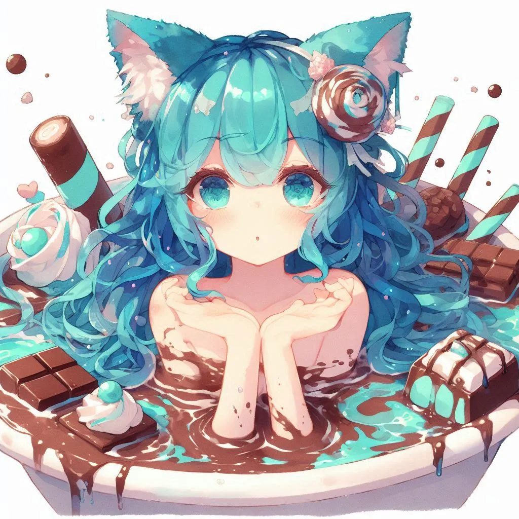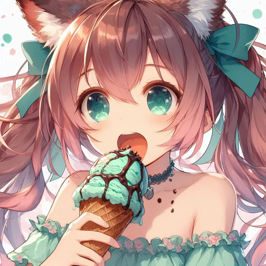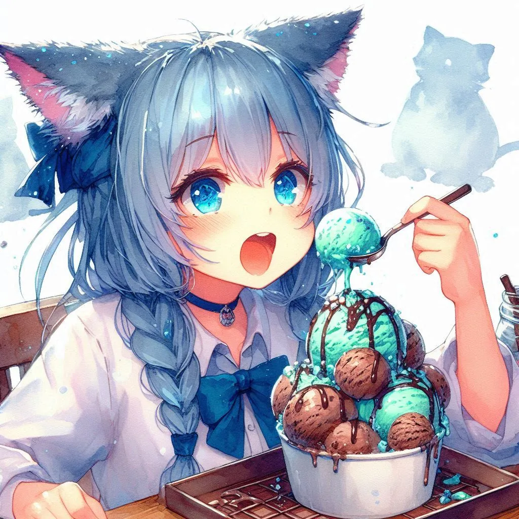Blue-haired cat ears munching on chocolate mint ice cream