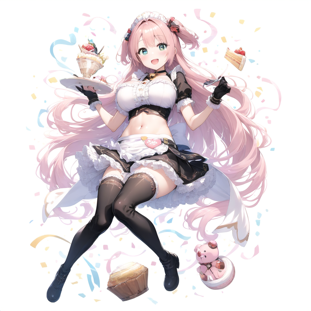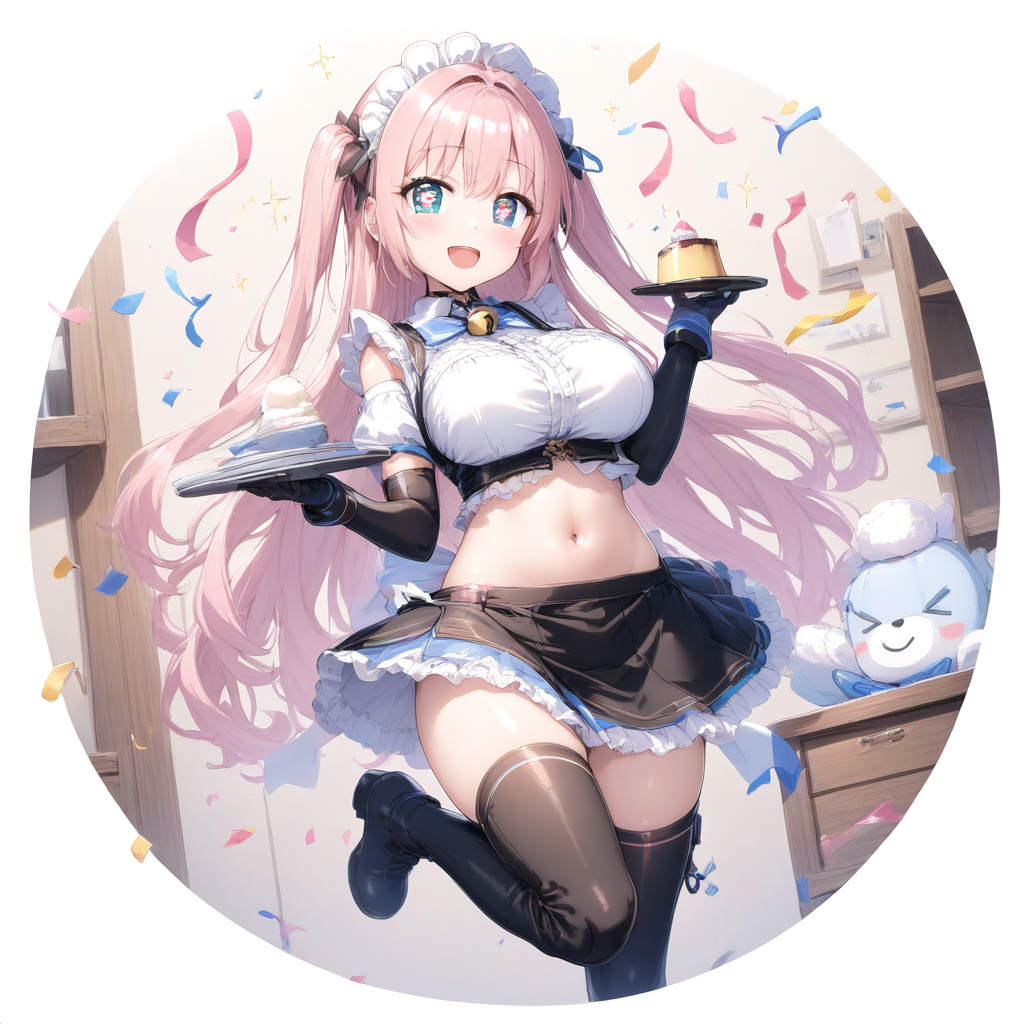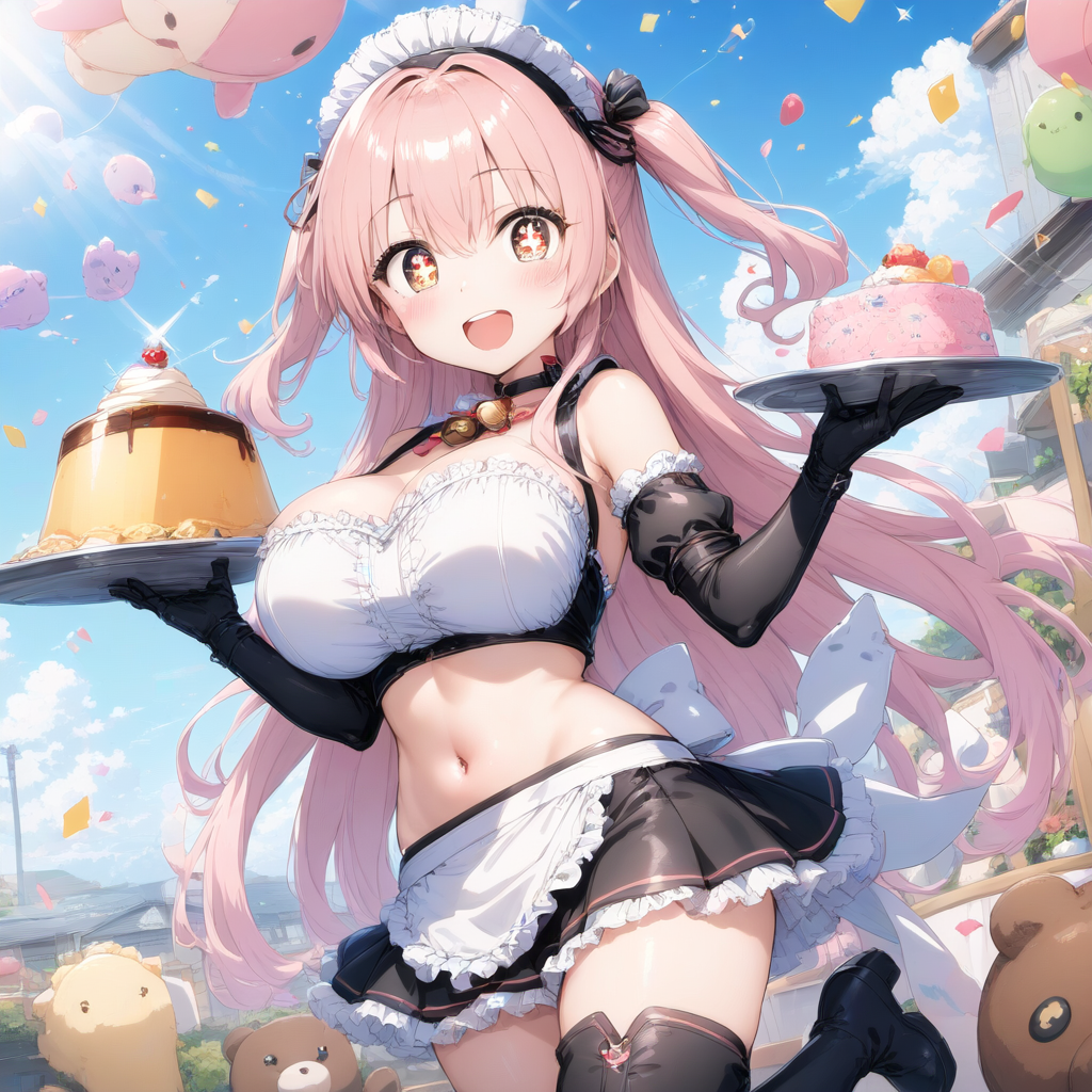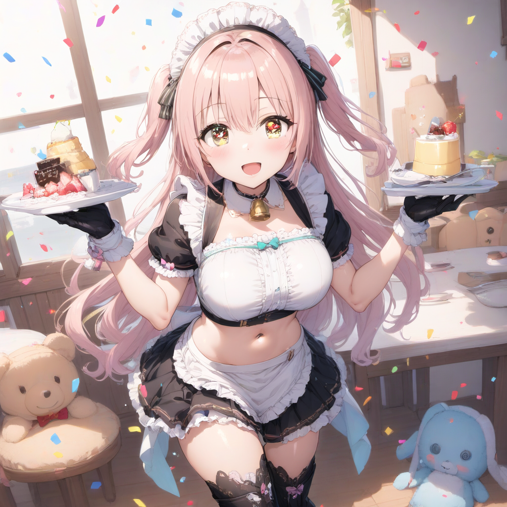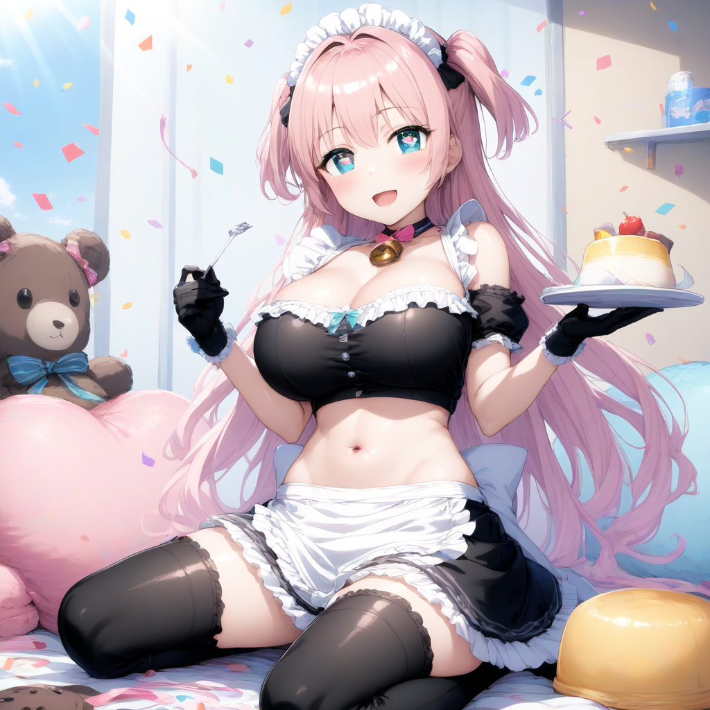 prompt: ,,, ,pastel color long hair ,side up,round eyes,yuruyuri,heart shaped pupils, sparkle pupils, sparkling anime eyes,,(, 1 maid girl,maid headless,maid in front of navel,midriff,navel cut out,smile,black glove,navel, huge breasts,,with thigh boots, ,:1.2155),smile, (solo:1.2155),BREAK,cafe,,Pudding,🍮,🍮,have cutlery,breeze,,spring sunshine,choker with bell,The ends of the hair are spread out softly,solo,1 girl,best quality, (((extremely masterpiece))),best quality, extremely detailed,ai-generated,highres,HDR,official art, , best quality, amazing quality, very aesthetic, absurdres, , best quality, amazing quality, , best quality, amazing quality, very aesthetic, absurdres, cutting a ribbon, cute plush toys, confetti, warm and inviting atmosphere,{{{ai-generated}}},highres,HDR,{{{official art}}}, , best quality, amazing quality, very aesthetic, absurdres, best quality, amazing quality, very aesthetic, absurdres, , best quality, amazing quality, very aesthetic, absurdresaesthetic, absurdres, best quality, amazing quality, very aesthetic, absurdres, best quality, amazing quality, very aesthetic, absurdres
